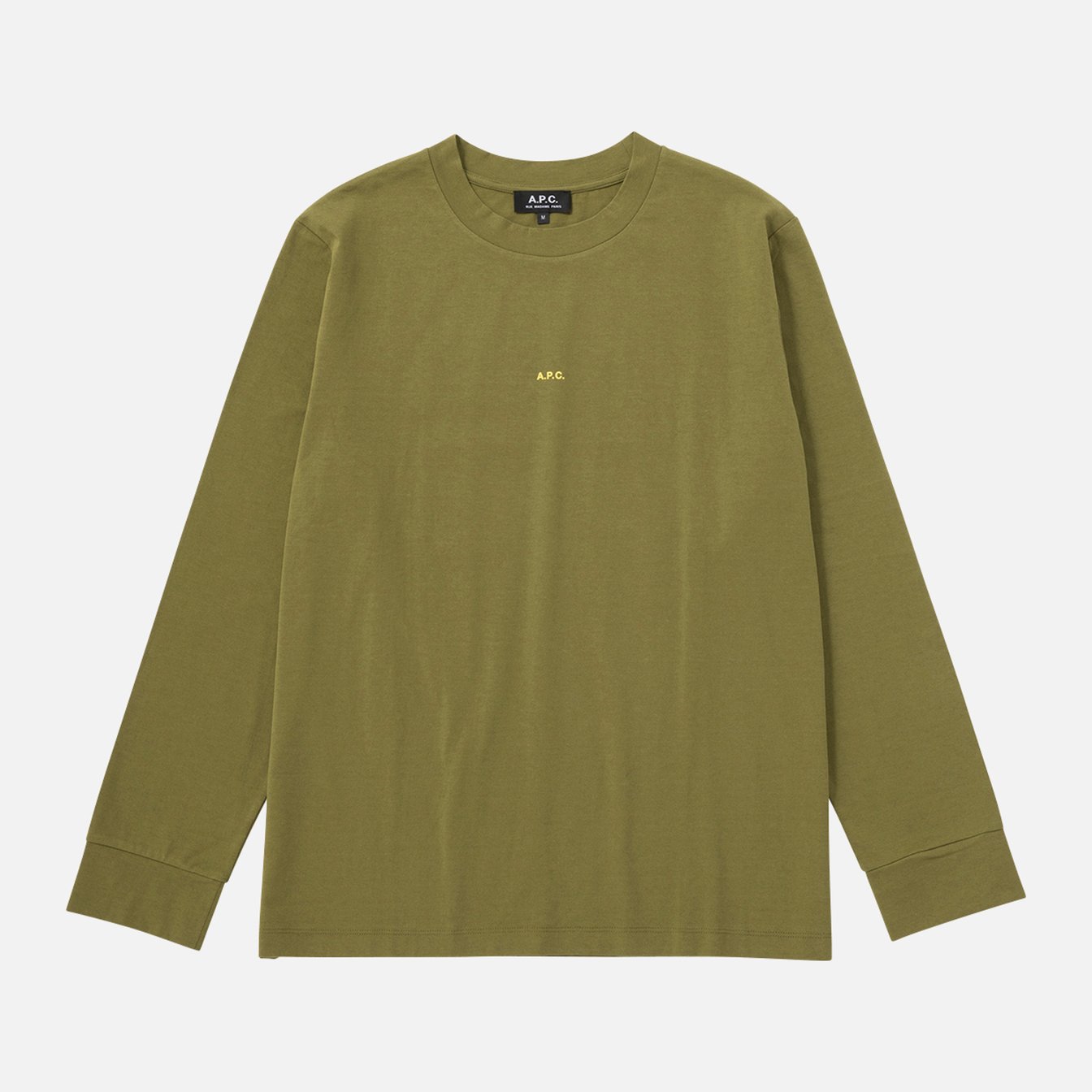 「アー?ペー?セー(A.P.C.)」では、カーキベースにイエローのマイクロロゴがポイントの新作ロングTシャツの別注カラーを販売。綿100%の肌触りのいい素材感も特徴。価格は1万4000円。