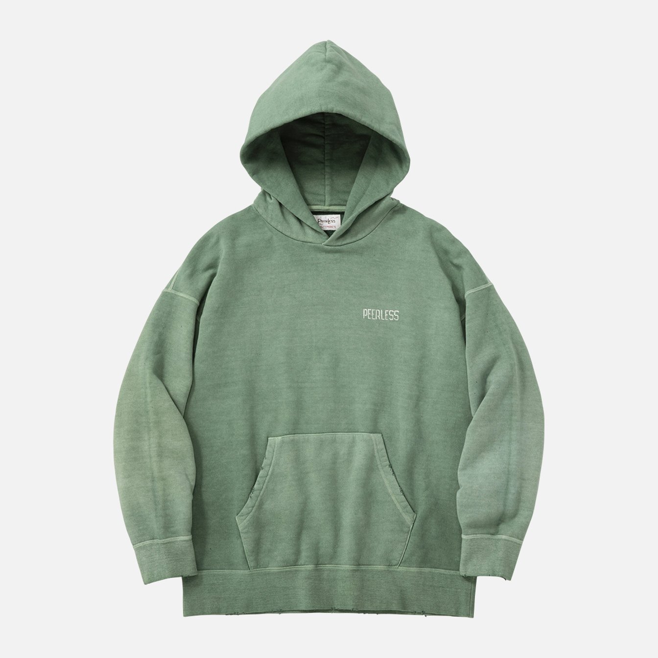 表面の自然なムラ感とドライタッチで油が抜けたような風合いと、裏側の上質で滑らかな肌触りが特徴の「ピアレス(PEERLESS)」のジャンボフーディー。特殊な染色を施し、一点一点ムラや色目が異なるのもポイントです。価格は5万1000円。