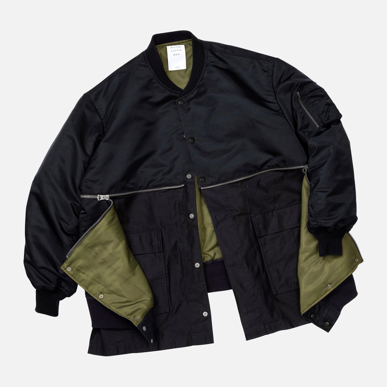 「ミスター?ジェントルマン(MISTERGENTLEMAN)」は、ファスナーを開閉することで着こなしを変えることができるオーバーレイZIPジャケットをMA-1にアレンジして限定発売。価格は6万2000円。