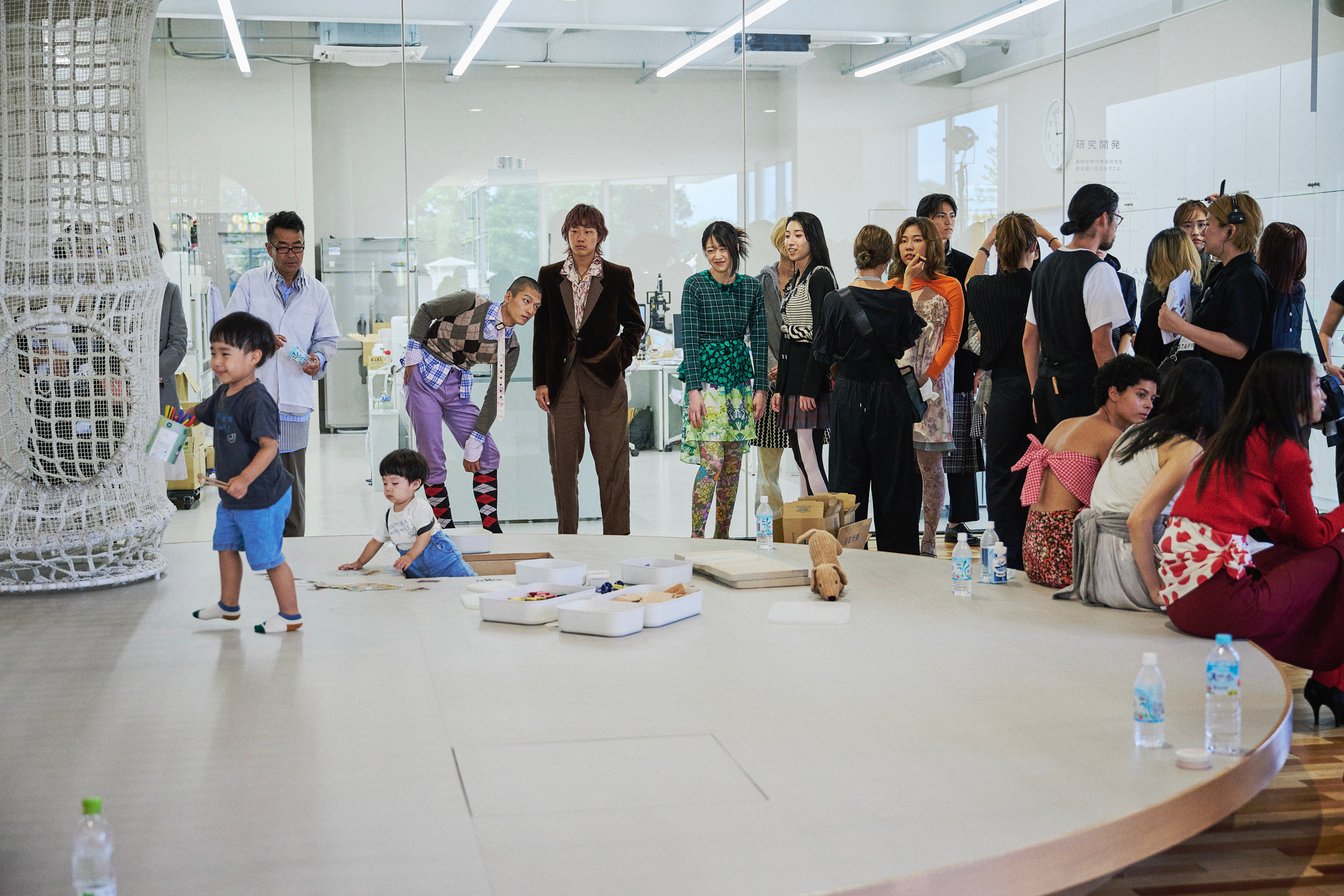 印象的だったのは、ヘアメイクの調整やリハーサルが行われている側で親子連れが遊んでいたり、工場スタッフが働いていたりと、日常の光景と非日常が溶け合った空間。"開かれた工場"という施設のコンセプトと呼応し、またリユースを身近に感じることができる機会となった。ショーの終了後には屋外の広場に舞台を移し、来場客やモデル、スタッフも交えて「みんなの盆踊り」が開催され、子どもから大人まで夏ならではのひとときを楽しんだ。