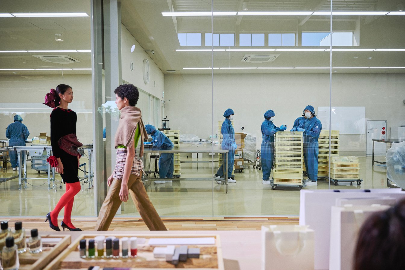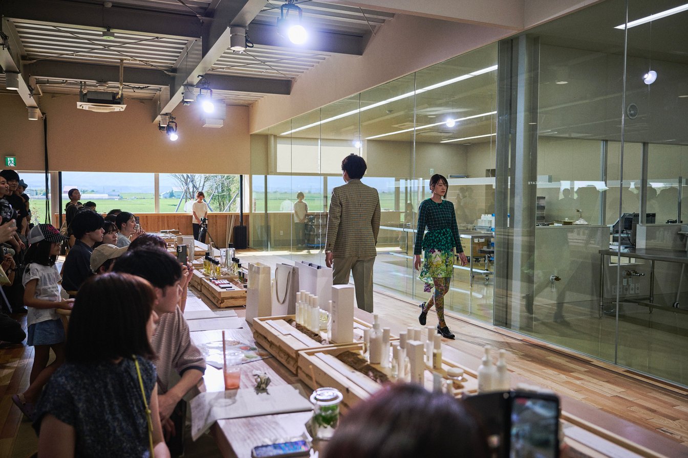リユースファッションショーは、施設内のフロアを利用して行われた。キッズスペースがモデルの待機場所となり、工場の様子がガラス越しに見えるメインフロア全体がランウェイに。総合演出は小松隆宏、スタイリストは山口翔太郎と、国内外で活躍するファッション界のプロが集結し、シロの製品を使ったヘアメイクは北海道を拠点に活動する伊藤智亜希を起用した。