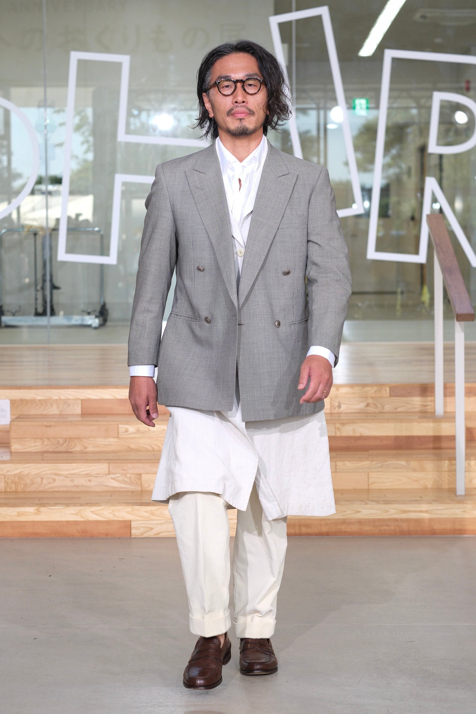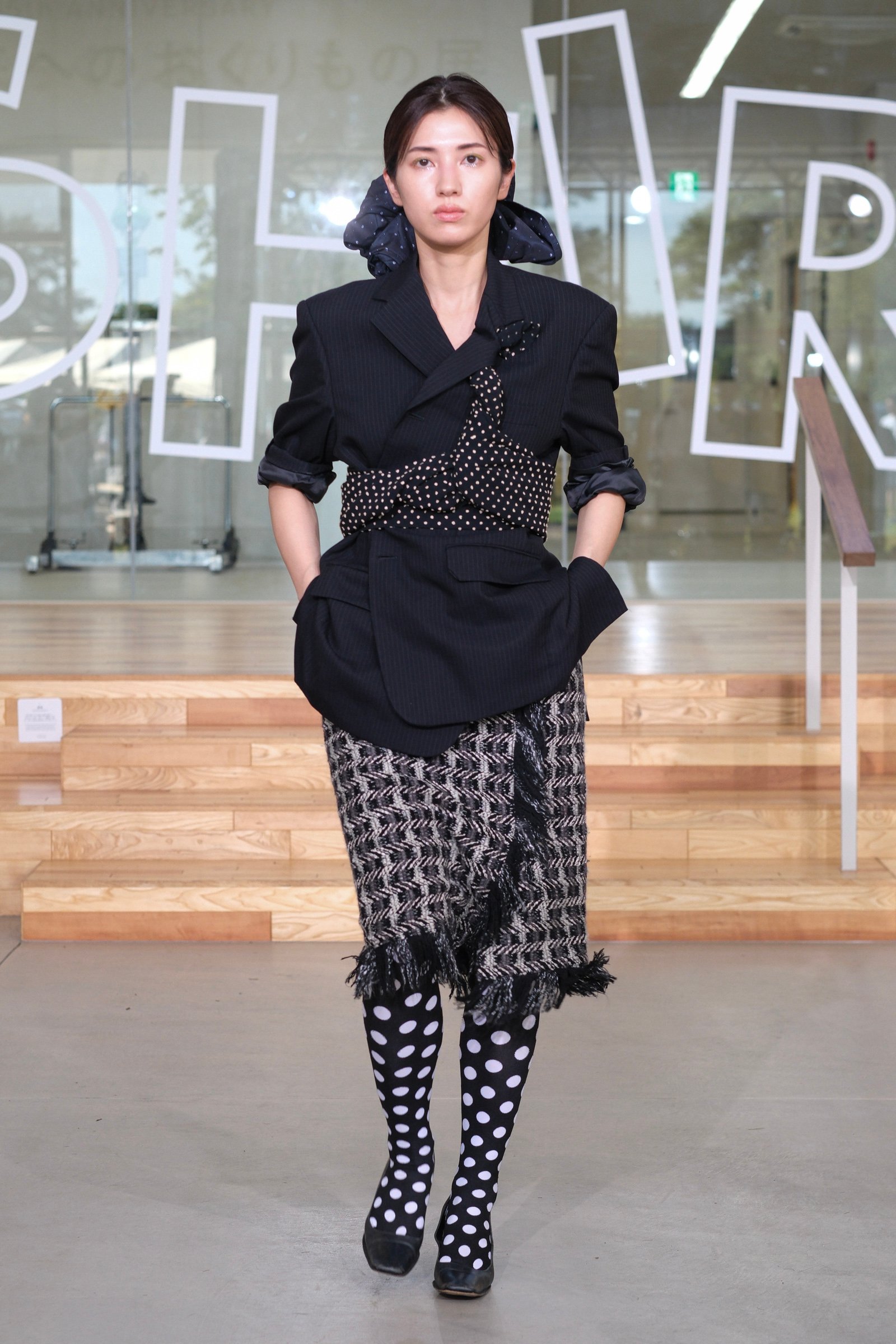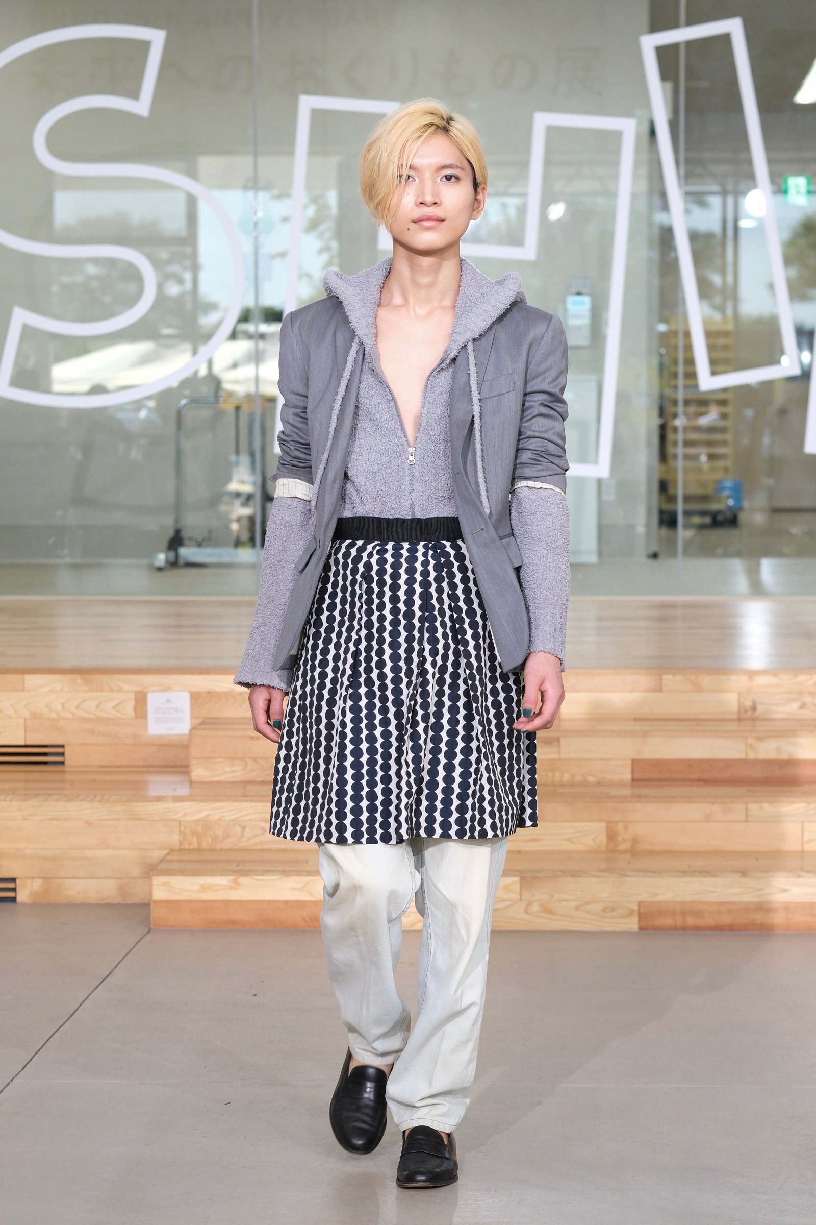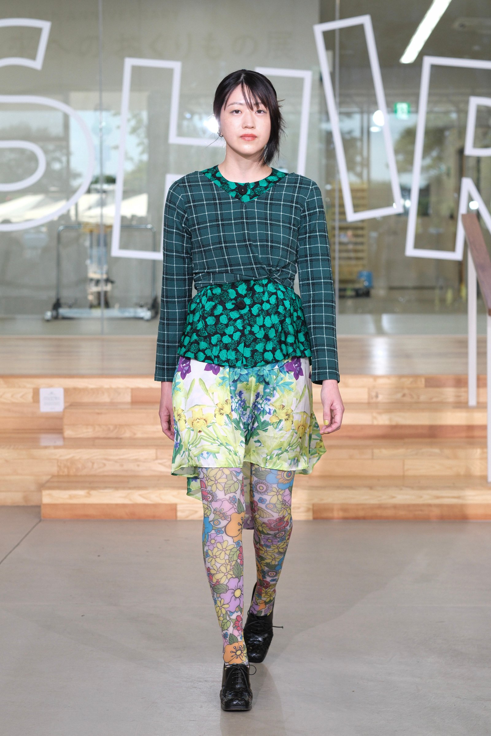 ランウェイモデルは、東京と北海道を拠点とするプロモデルと、工場で働いているスタッフや友人、そしてシロの福永敬弘社長とエコミットの川野輝之社長を加えた総勢22人。身につけていたのは、エコミットが回収した古着。柄もサイズも不揃いだが、ハサミを入れたり縫い直したりせず、スカートをトップスに用いたり、シャツやパンツを何着か重ねたり、ブラウスをヘアアクセに変えたりと新鮮なスタイリングで、捨てられた服に新たな命が吹き込まれた。