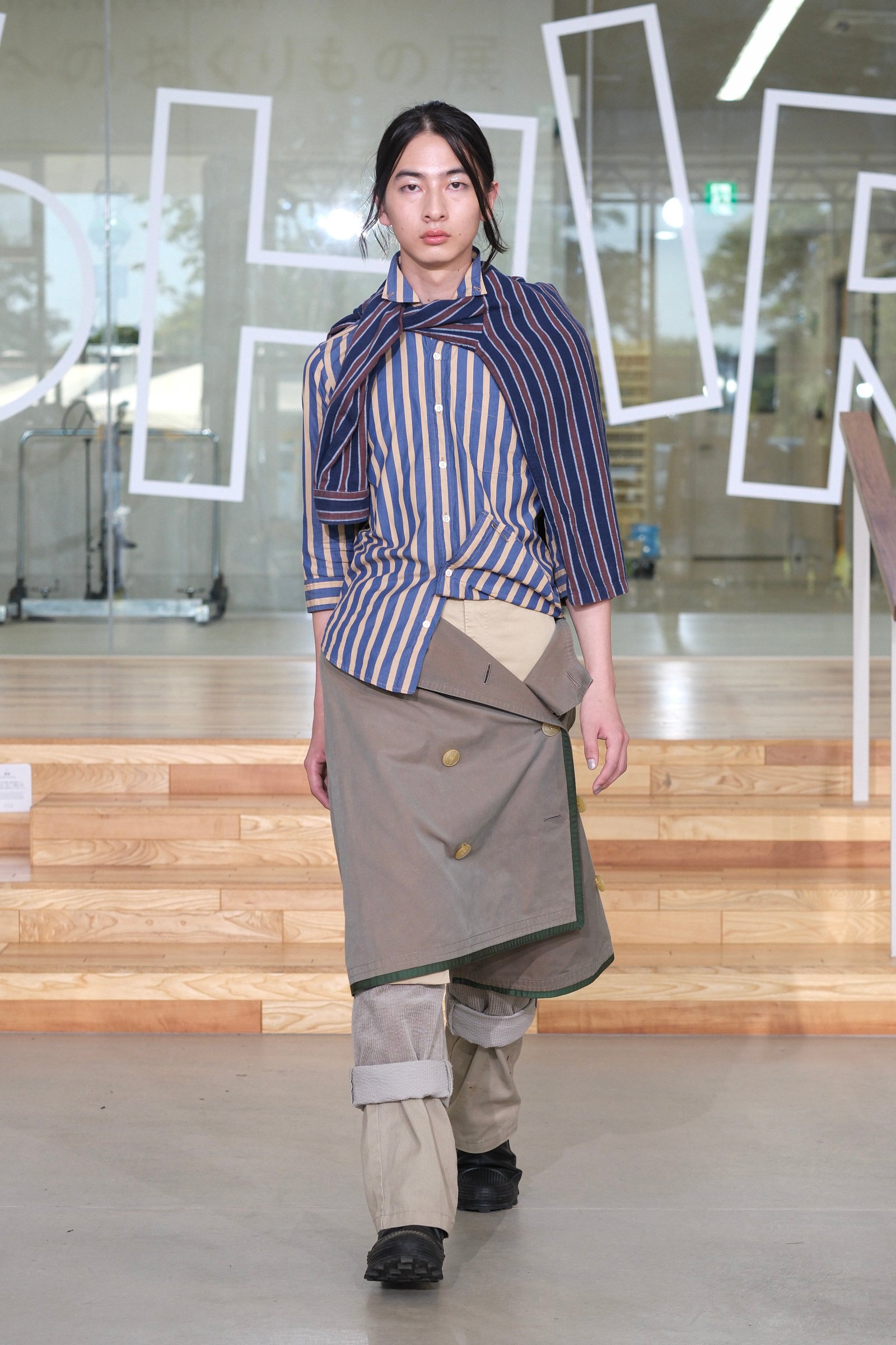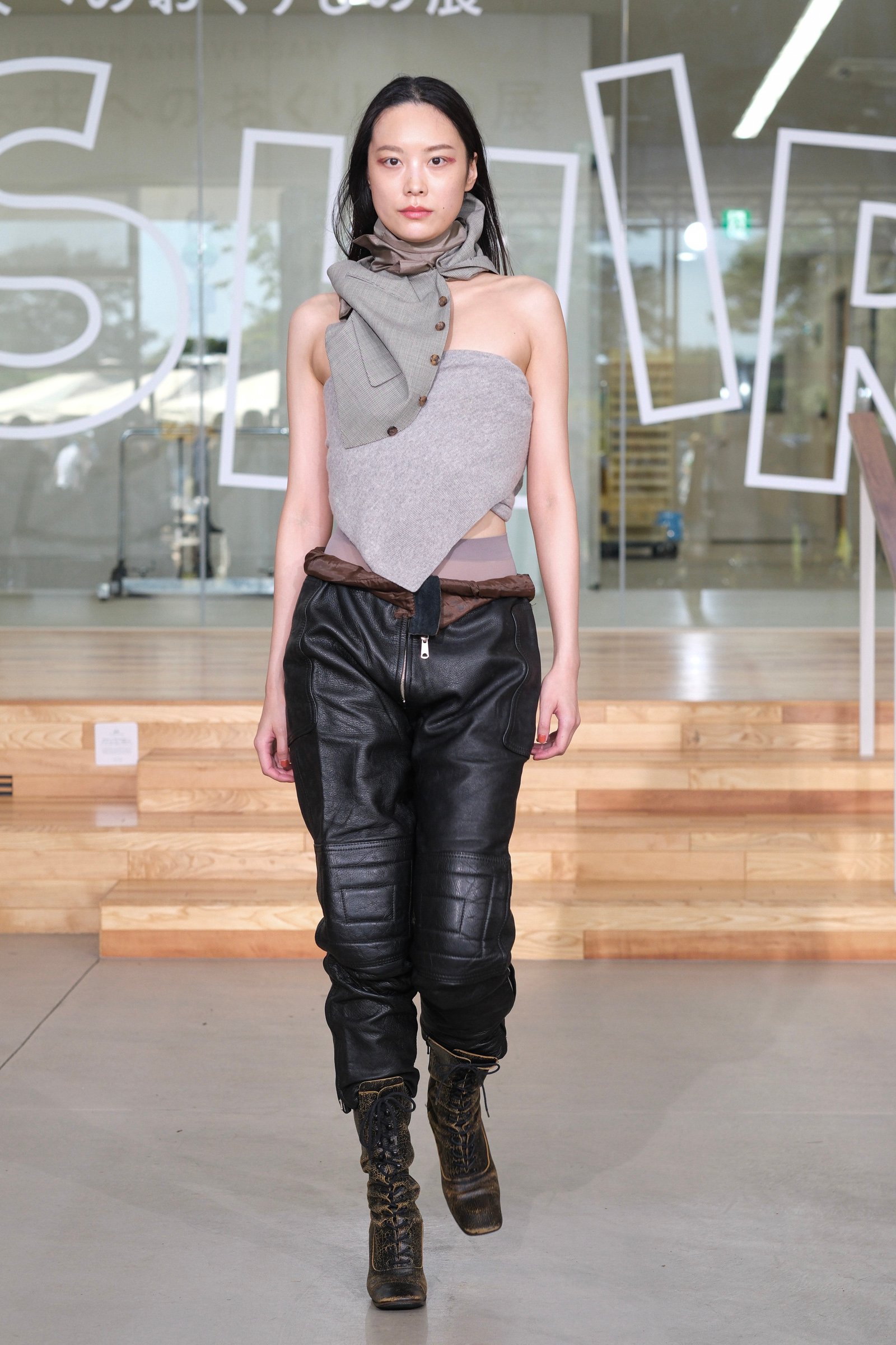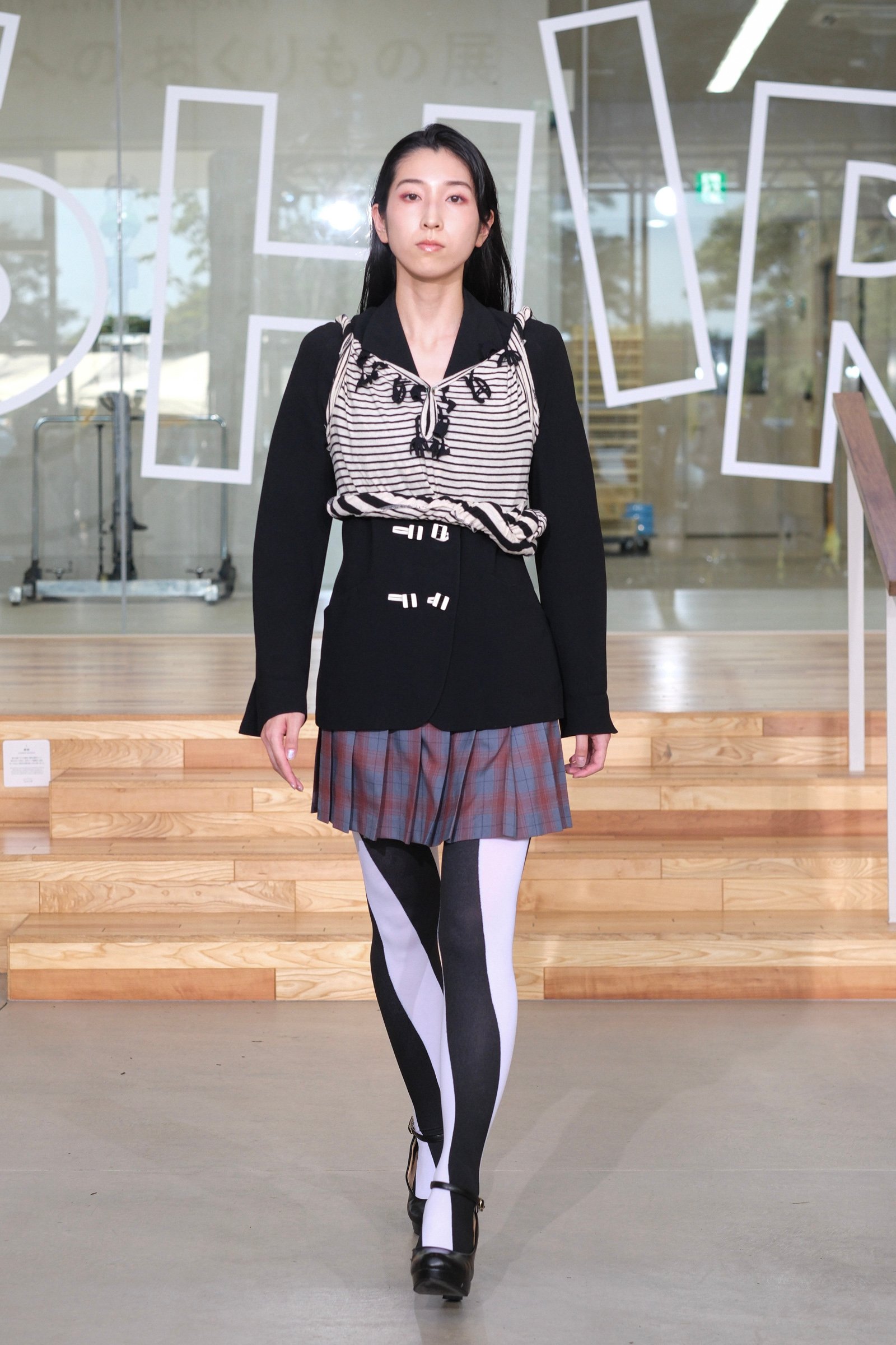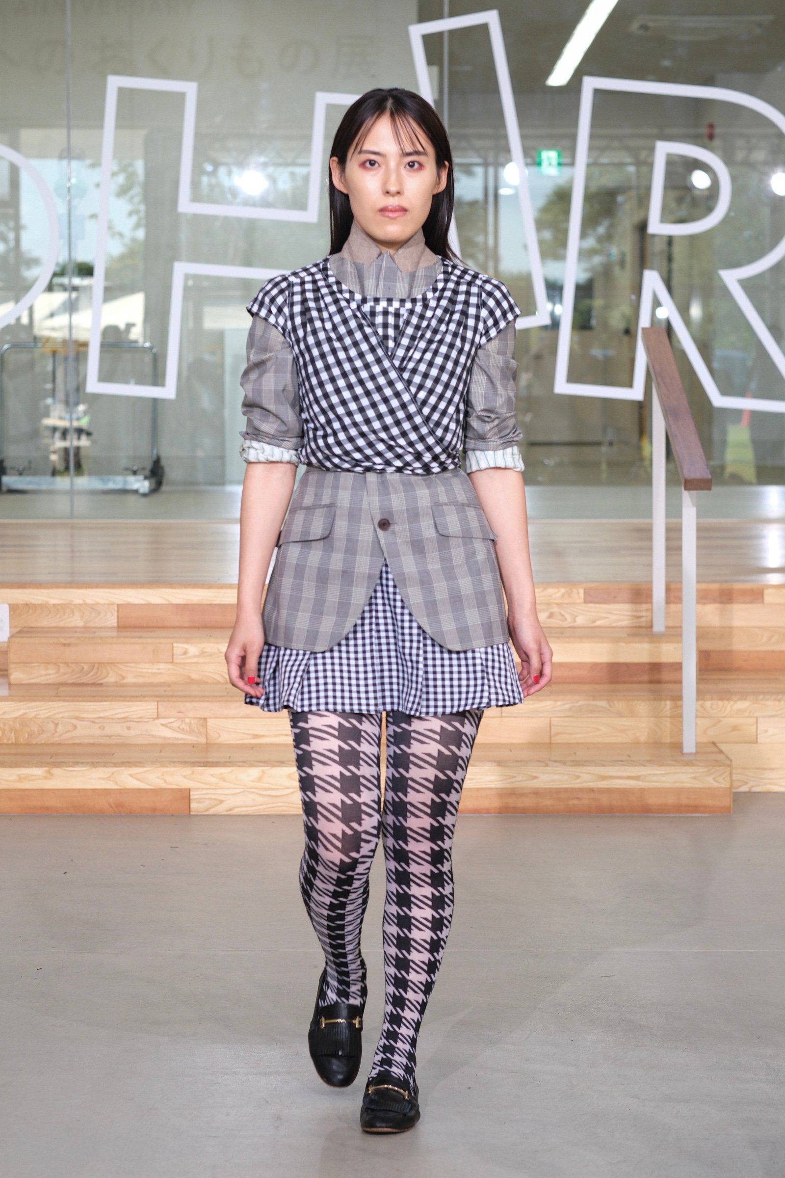 ランウェイモデルは、東京と北海道を拠点とするプロモデルと、工場で働いているスタッフや友人、そしてシロの福永敬弘社長とエコミットの川野輝之社長を加えた総勢22人。身につけていたのは、エコミットが回収した古着。柄もサイズも不揃いだが、ハサミを入れたり縫い直したりせず、スカートをトップスに用いたり、シャツやパンツを何着か重ねたり、ブラウスをヘアアクセに変えたりと新鮮なスタイリングで、捨てられた服に新たな命が吹き込まれた。