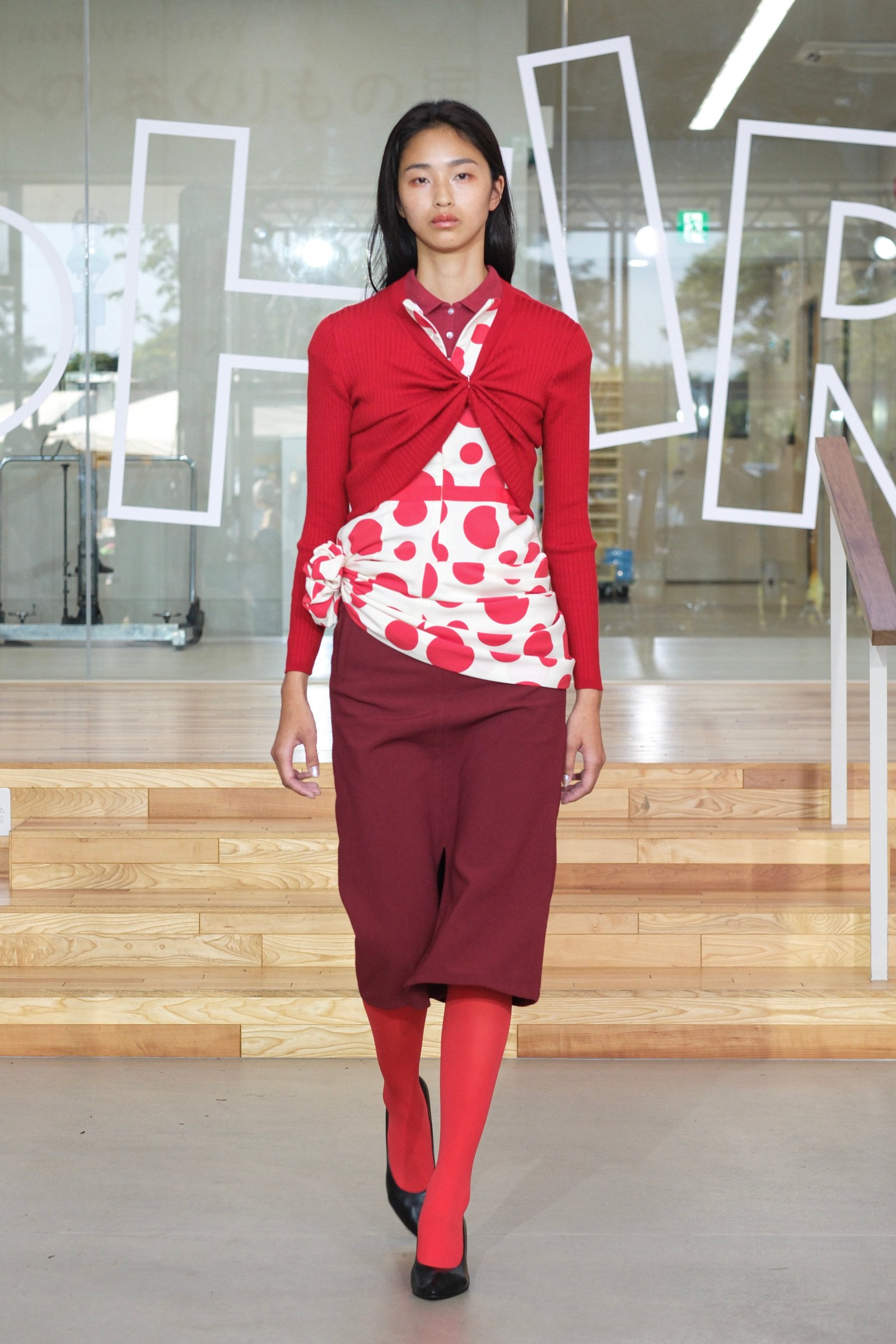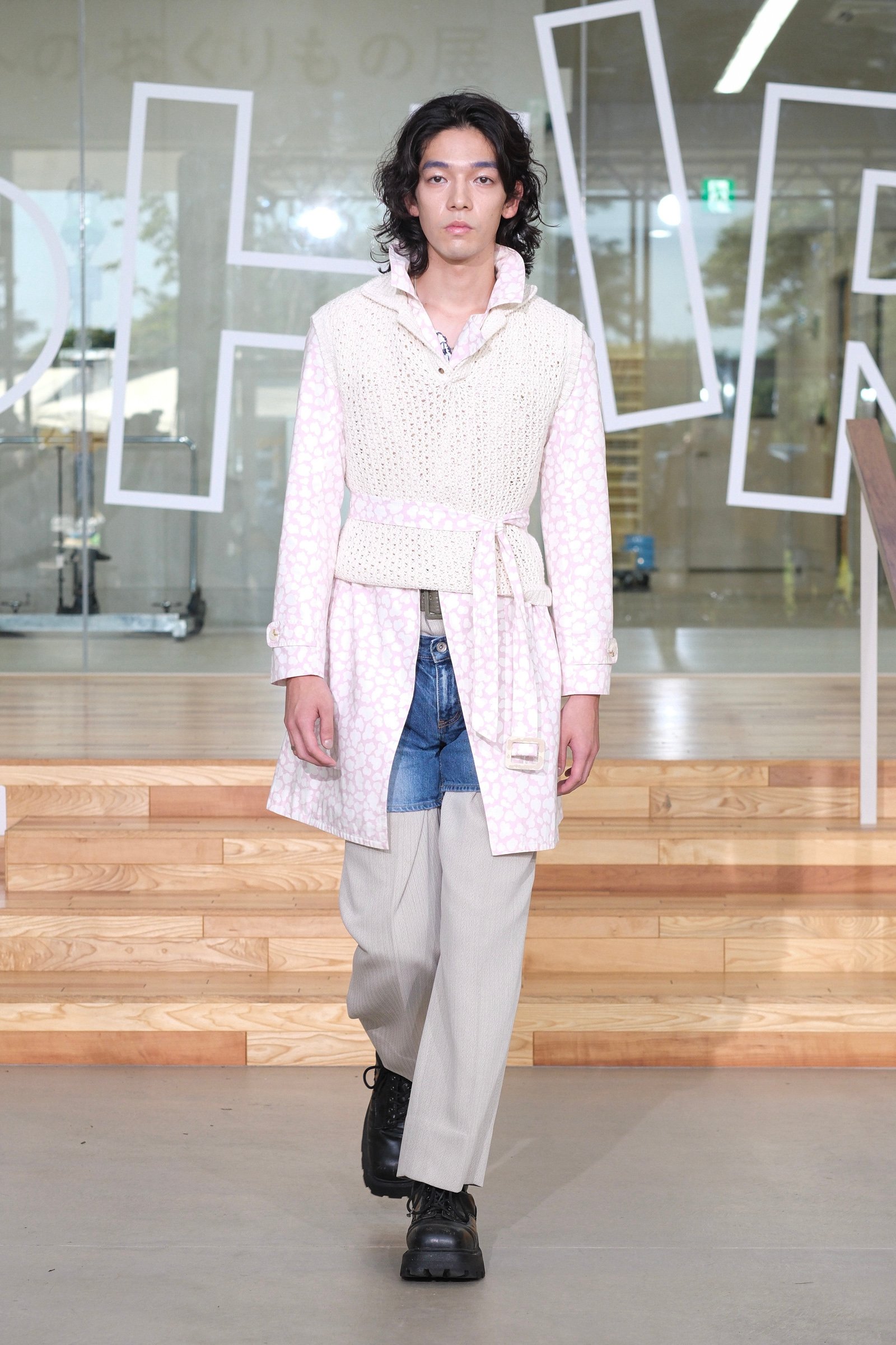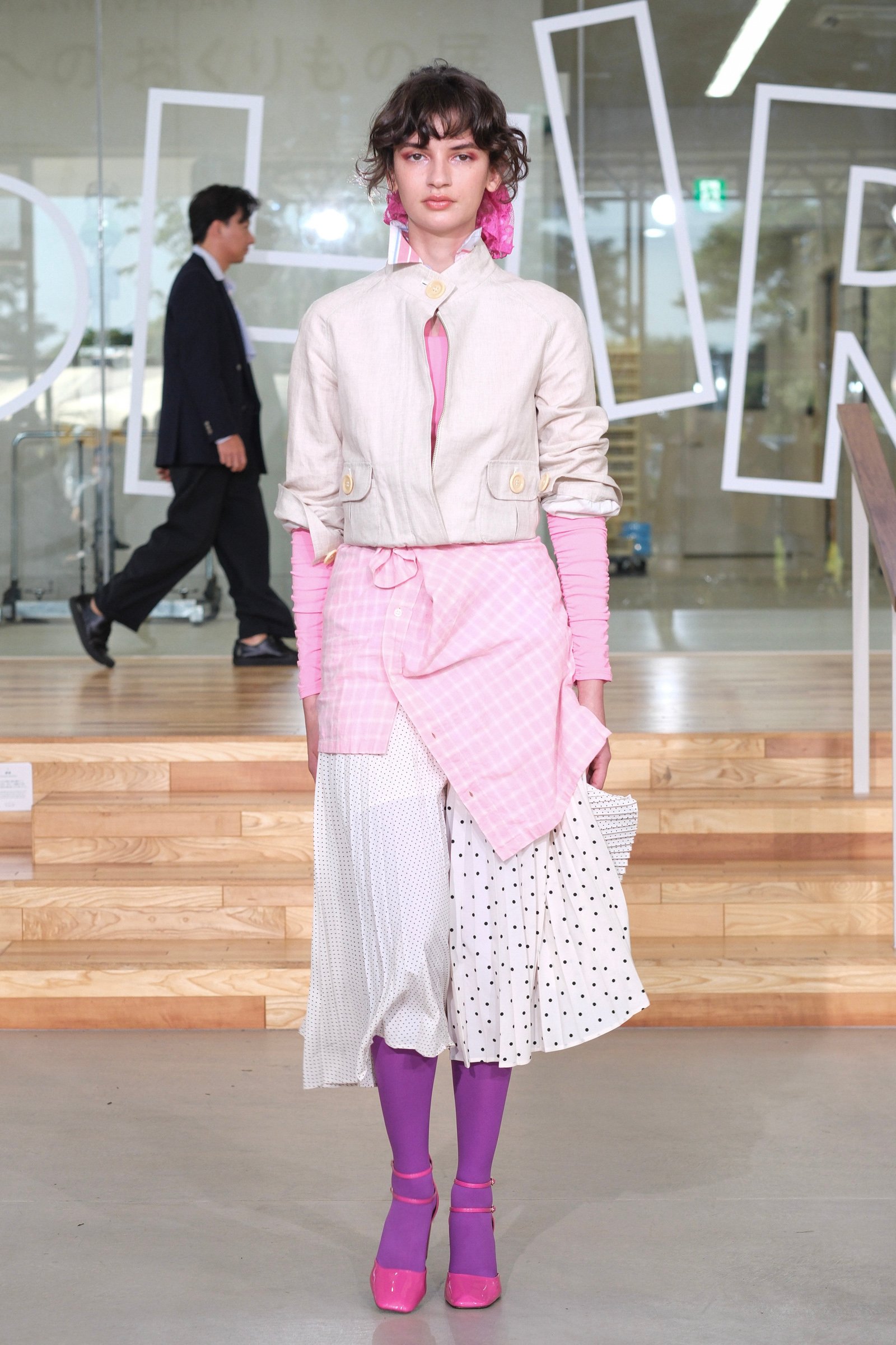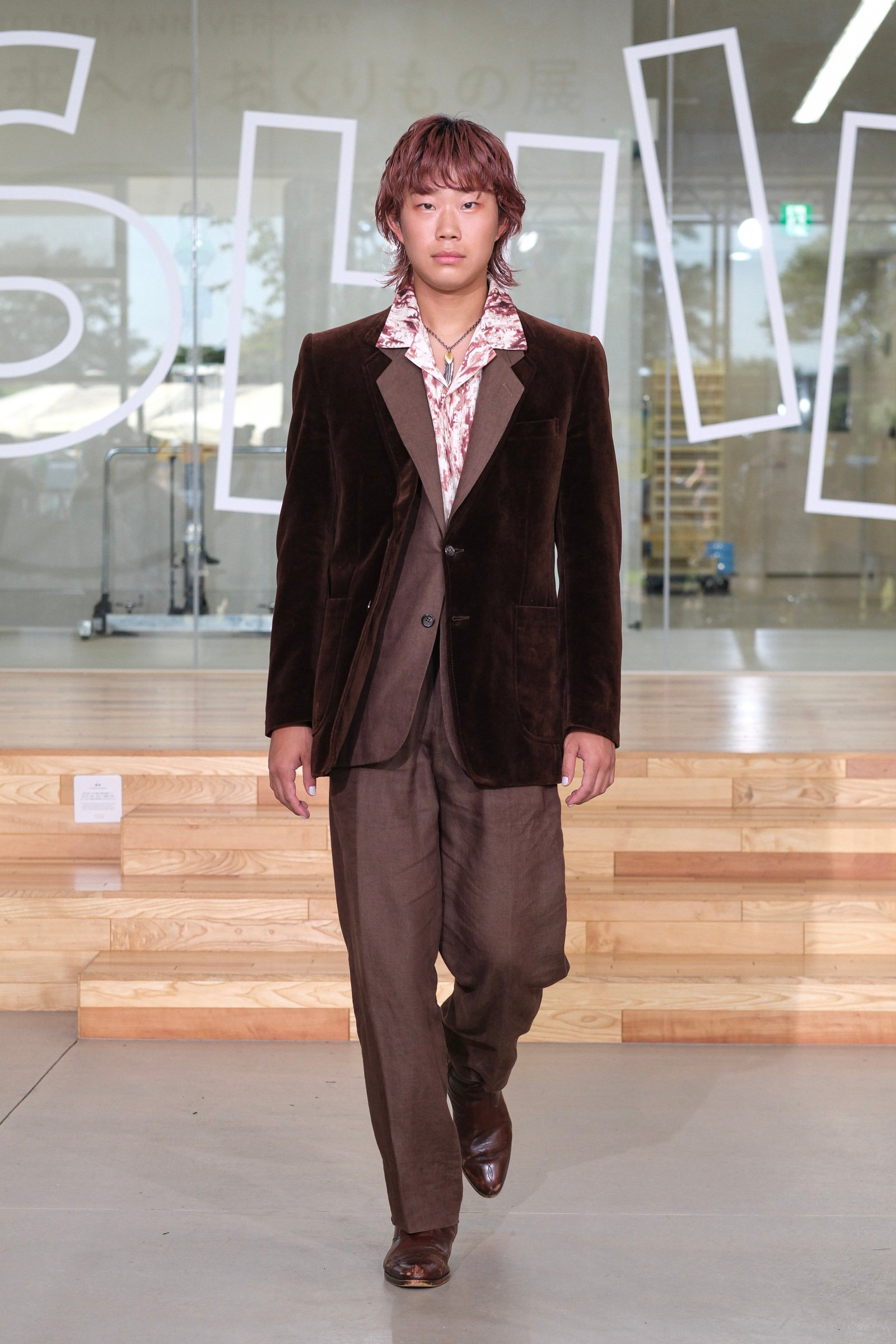 ランウェイモデルは、東京と北海道を拠点とするプロモデルと、工場で働いているスタッフや友人、そしてシロの福永敬弘社長とエコミットの川野輝之社長を加えた総勢22人。身につけていたのは、エコミットが回収した古着。柄もサイズも不揃いだが、ハサミを入れたり縫い直したりせず、スカートをトップスに用いたり、シャツやパンツを何着か重ねたり、ブラウスをヘアアクセに変えたりと新鮮なスタイリングで、捨てられた服に新たな命が吹き込まれた。