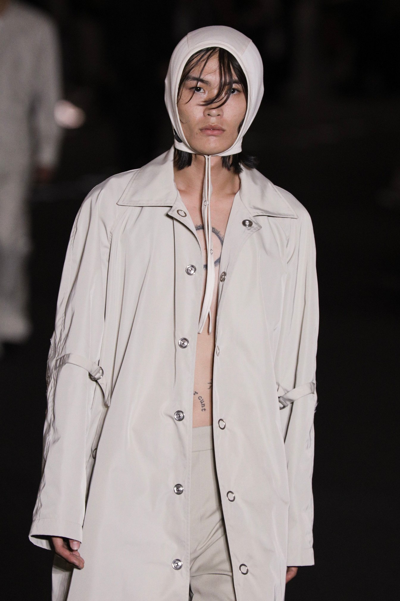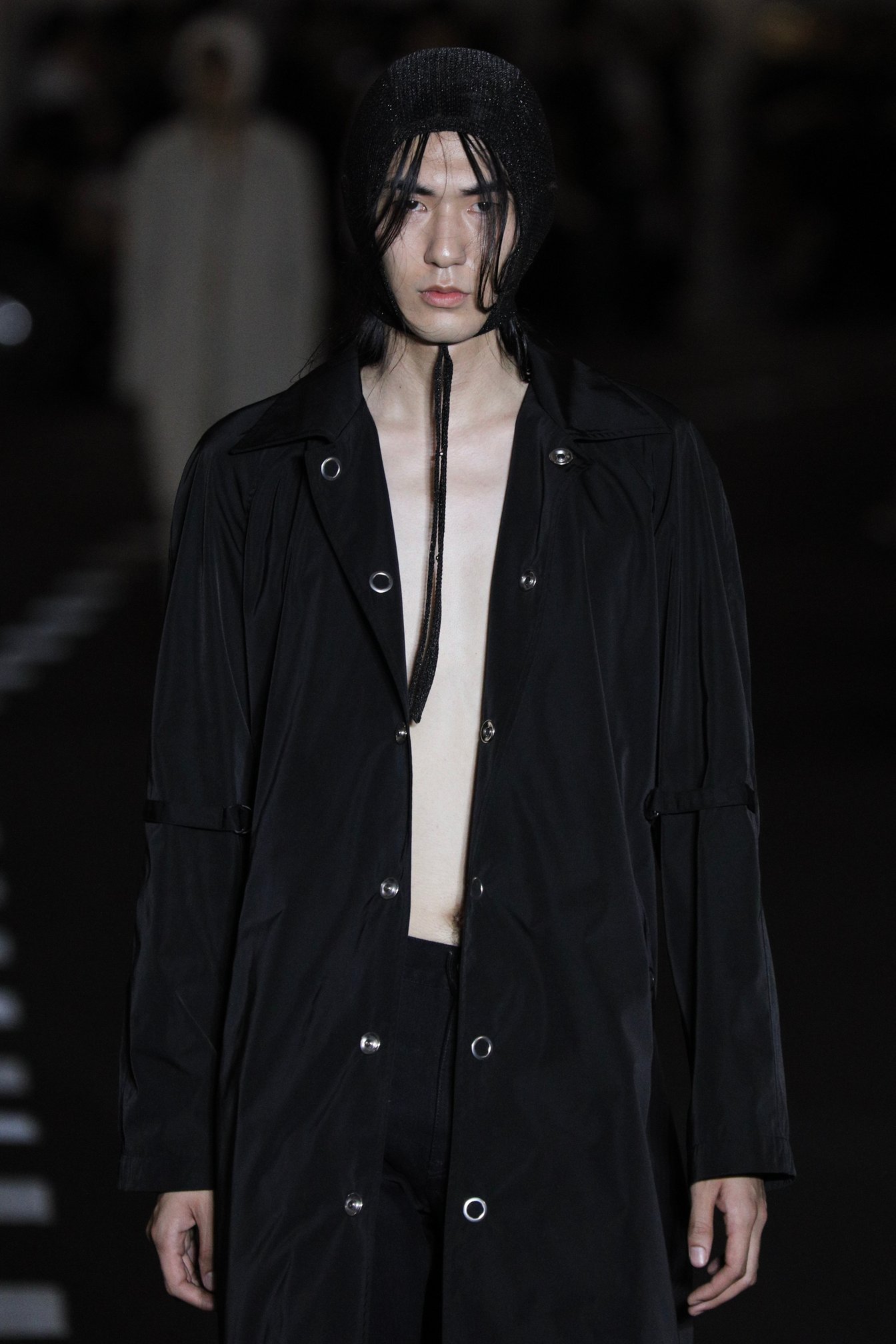 ファーストルックから3体続くテーラードスタイルのルックの、洗練されたシルエット、しなやかで光沢感のある生地、絶妙なグレートーンは、シュープらしさを変わらずに提示しながらも完璧にその薄暗く湿度の高い空間に似合う。東京の空気を通して見たビル街の黒、グレー、ベージュ、白、豊かな緑の色彩は馴染み深く安心感を覚えるような美しさがある。