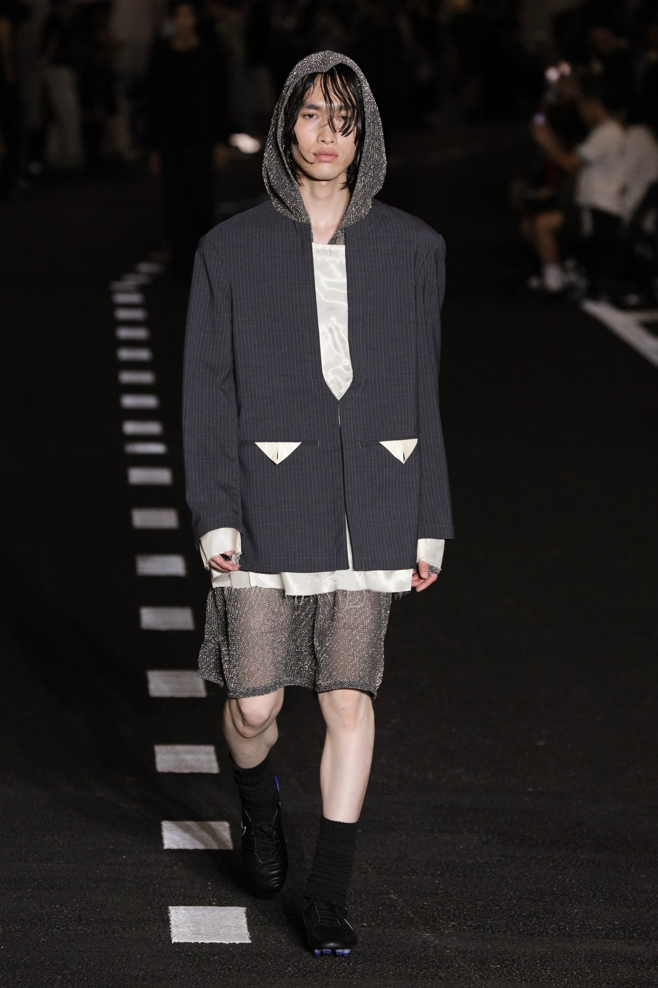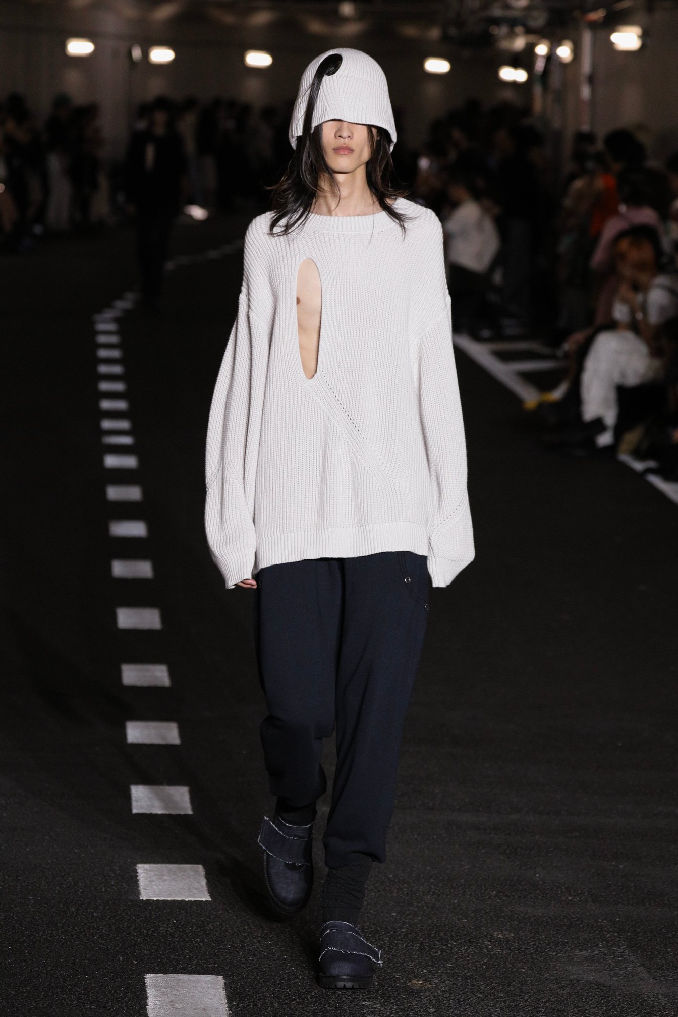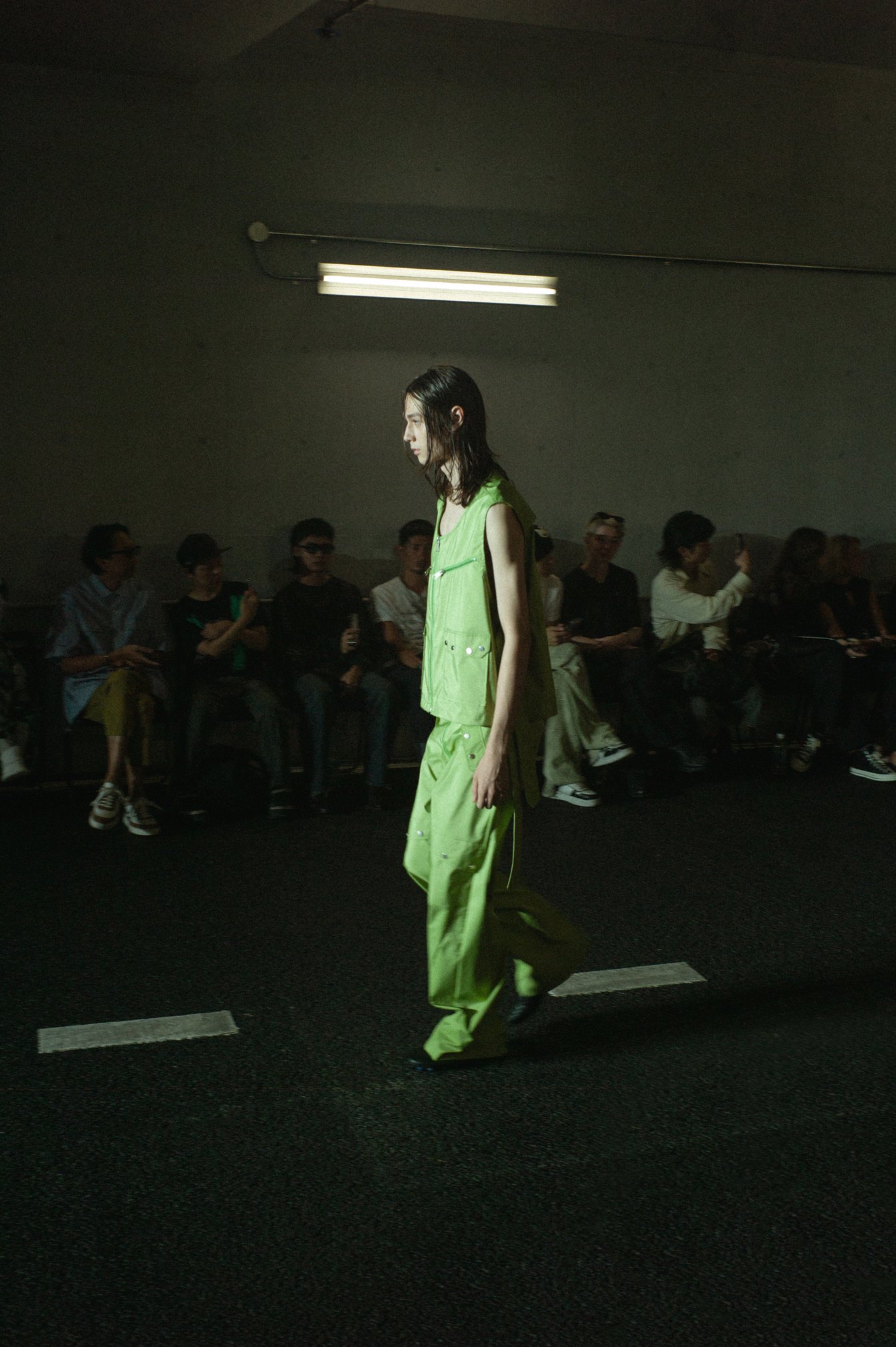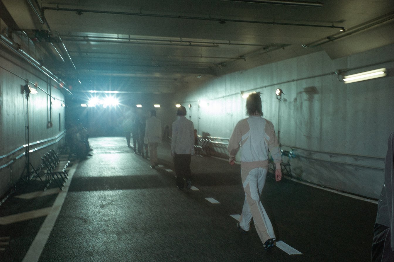 ショー会場である国立競技場の薄暗く長いアスリートスロープを降りていくと、地下では蝉が鳴いていた。ランウェイとなるスロープの脇に4脚ずつ島にされた椅子に着く。ショーの開始を待ちながら、日差しがなくとも蒸し暑い会場で、観客たちは汗をかき、まるで道路のような白線が引かれたスロープを眺める。蝉の声と山手線のホームアナウンスが交互に流れる客入れ音楽に耳を傾けていると、夏の駅のホームでベンチに座っているような、公園のベンチに座っているような気分になった。