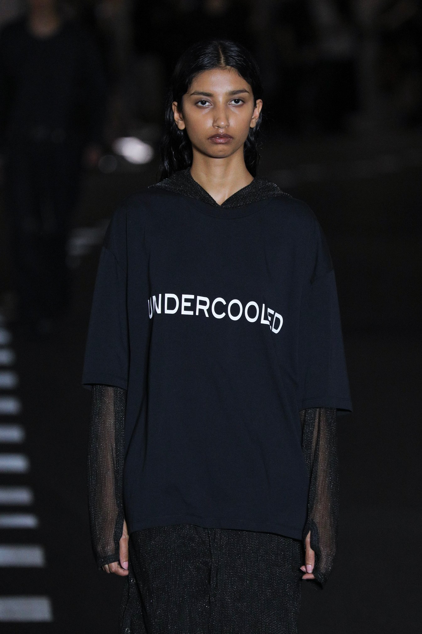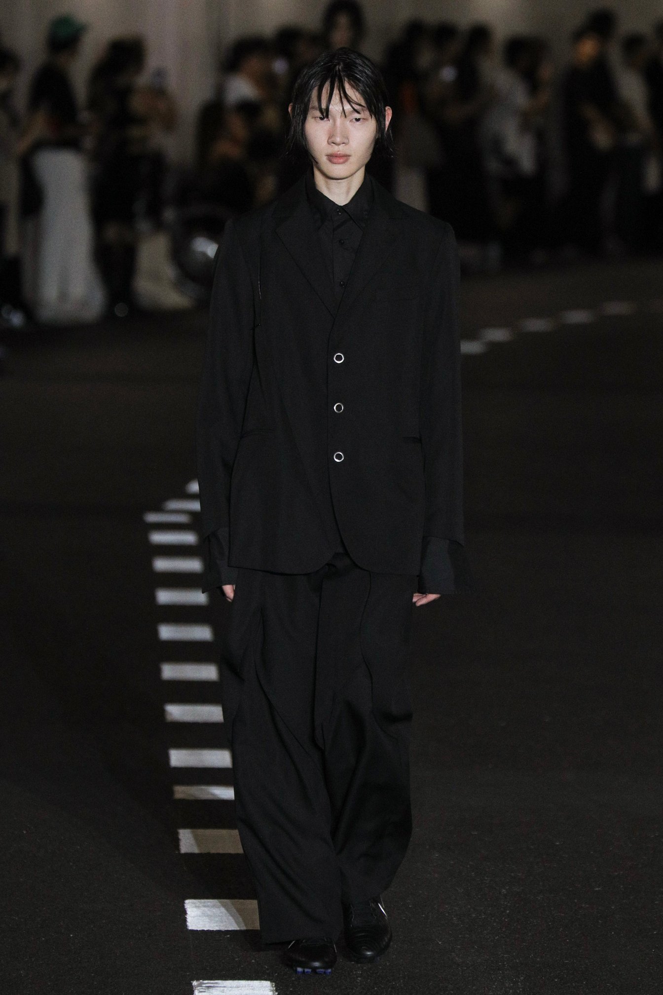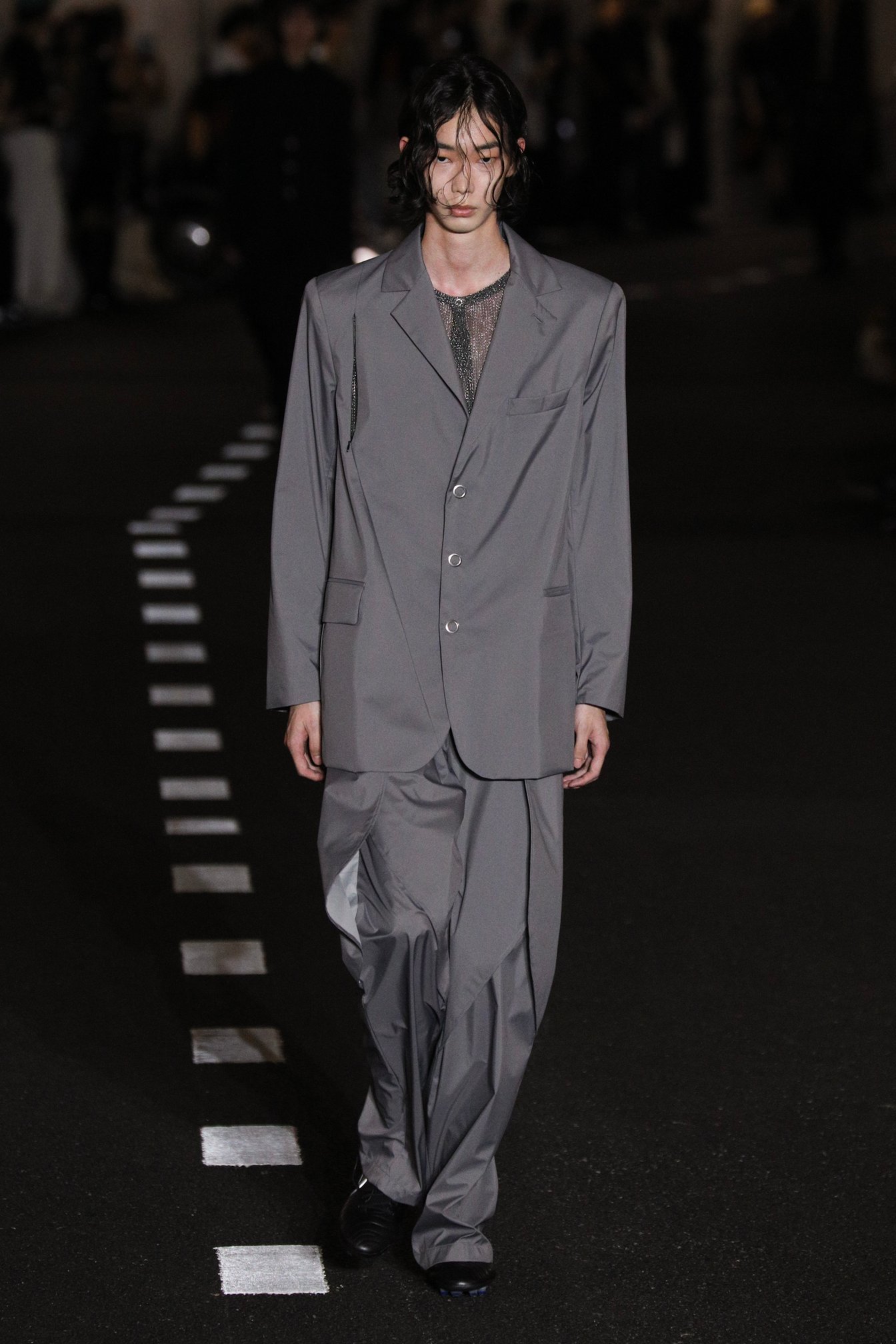 ショー会場である国立競技場の薄暗く長いアスリートスロープを降りていくと、地下では蝉が鳴いていた。ランウェイとなるスロープの脇に4脚ずつ島にされた椅子に着く。ショーの開始を待ちながら、日差しがなくとも蒸し暑い会場で、観客たちは汗をかき、まるで道路のような白線が引かれたスロープを眺める。蝉の声と山手線のホームアナウンスが交互に流れる客入れ音楽に耳を傾けていると、夏の駅のホームでベンチに座っているような、公園のベンチに座っているような気分になった。