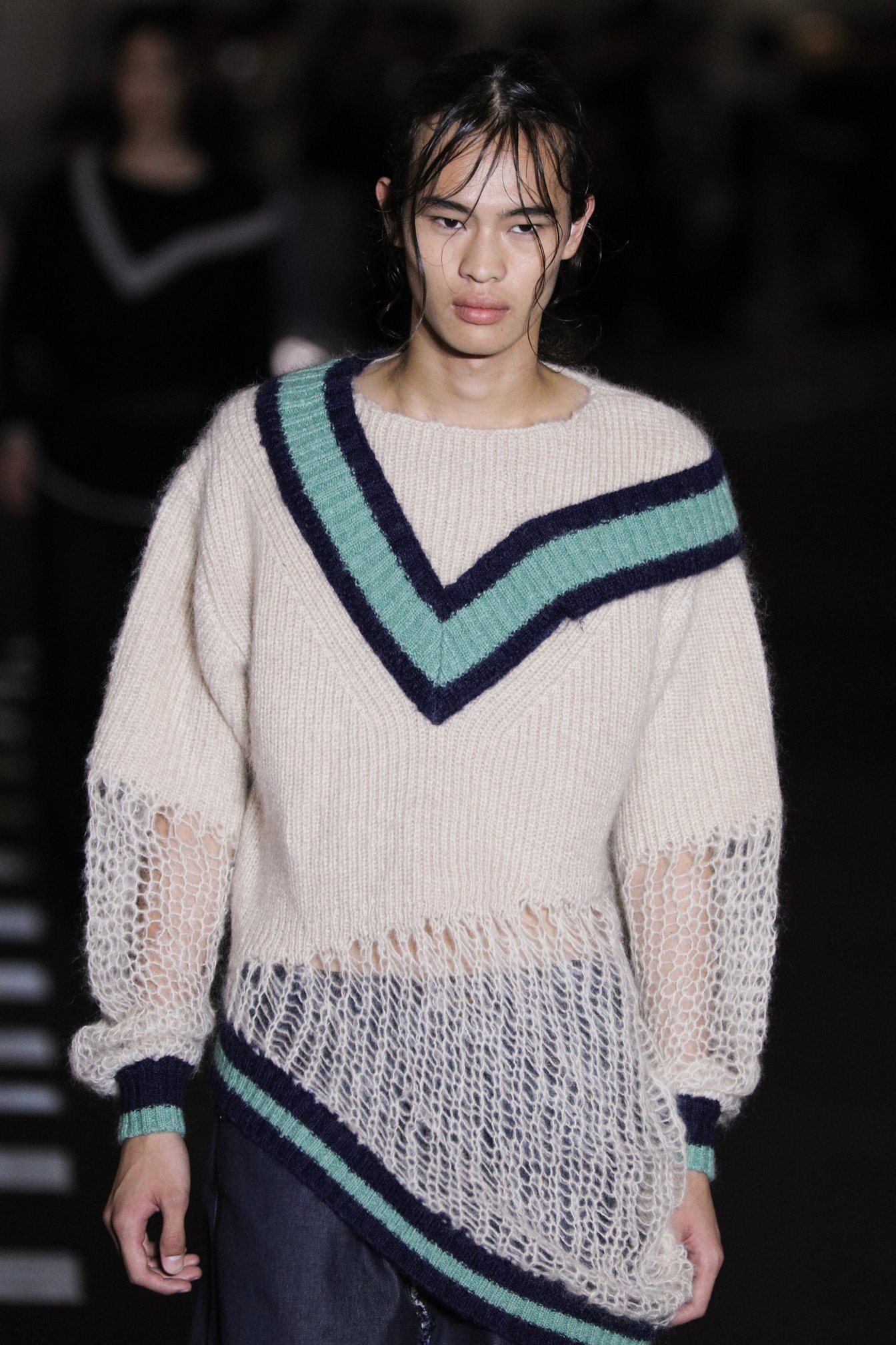 洗練され純粋化した意匠に共通して用いられたのは「空洞」。大きな穴の空いたニットや途中で溶けたように編み目が解け襟元のラインがずれたニットは、暑さで溶けてしまったようにも見えるが、どんな環境でも平静を保ち暮らす東京の人のようで佇まいに愛嬌がある。肩にスリットの入ったトラックジャケットやシースルーのニットなど、硬質さの中にも透け感や抜けがあり、軽やかさが加わる。