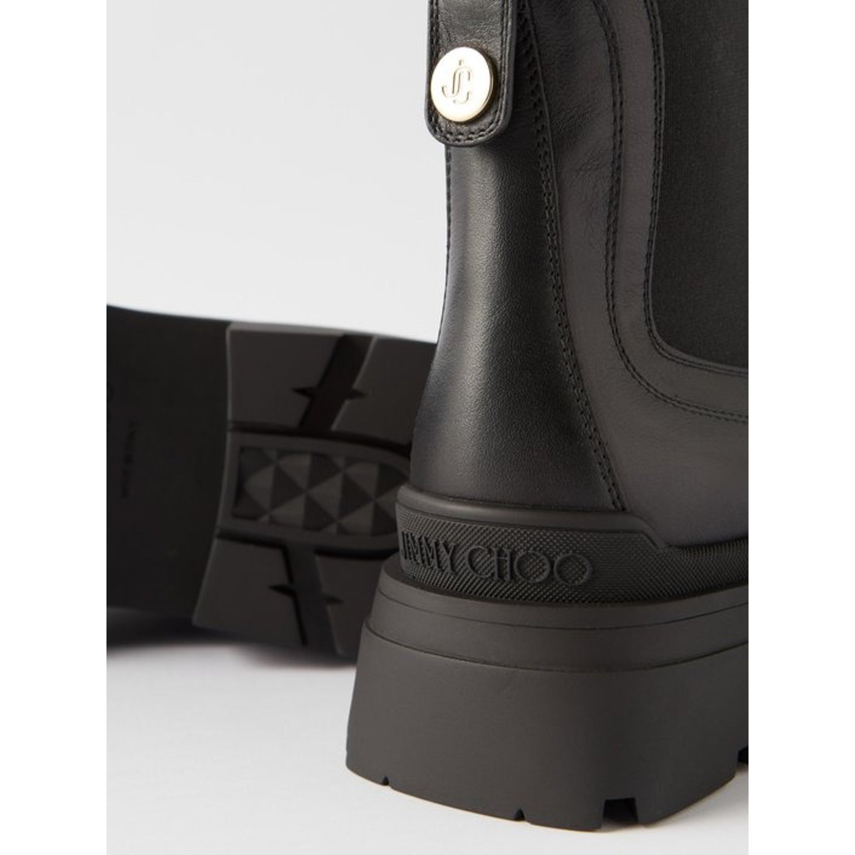 「ジミーチュー(JIMMY CHOO)」のアンクルブーツはボリュームのあるソールと、シルバーロゴがついたタブがアクセント。はき口がゴム仕様で、足にあたる部分が痛くならず快適な履き心地。