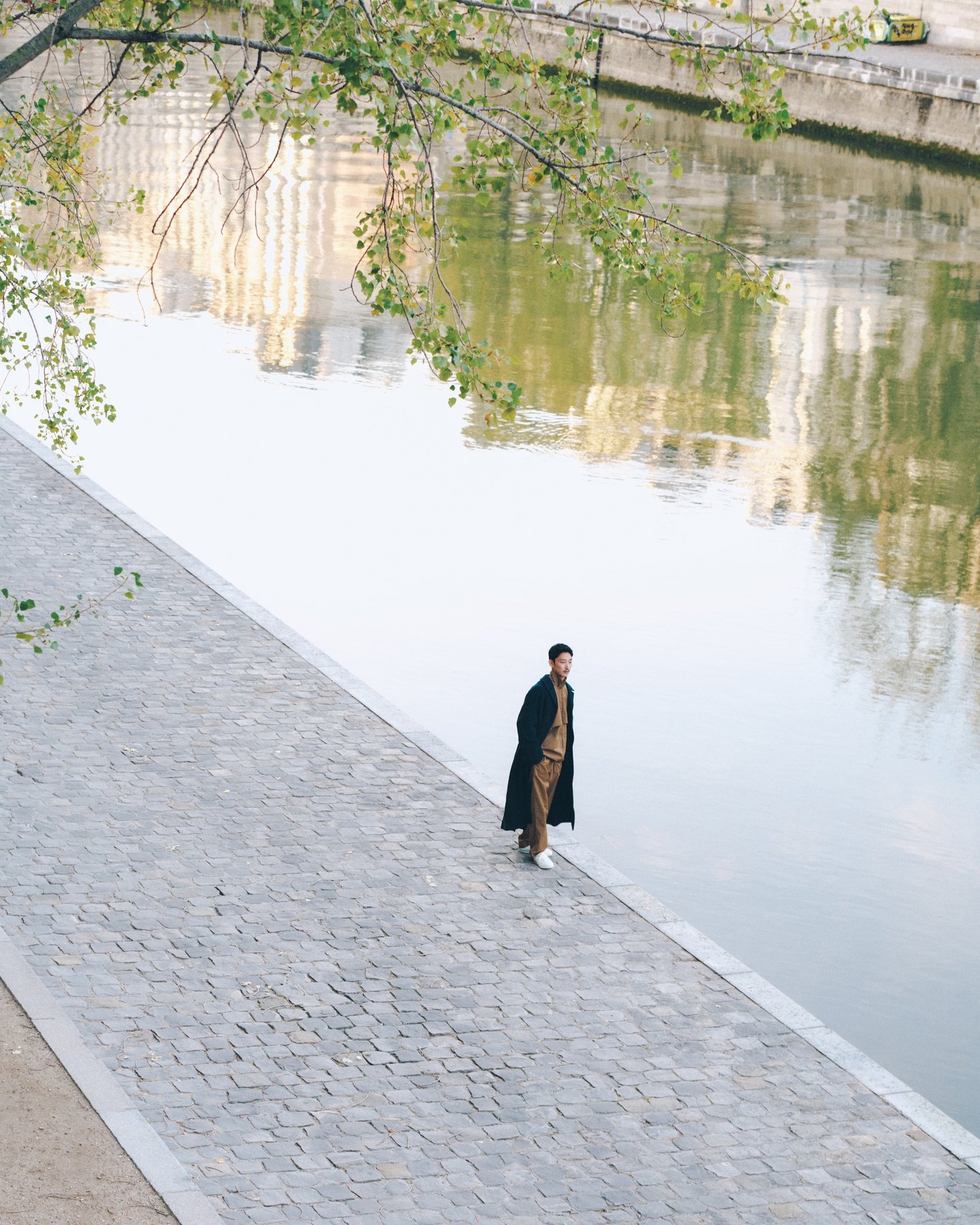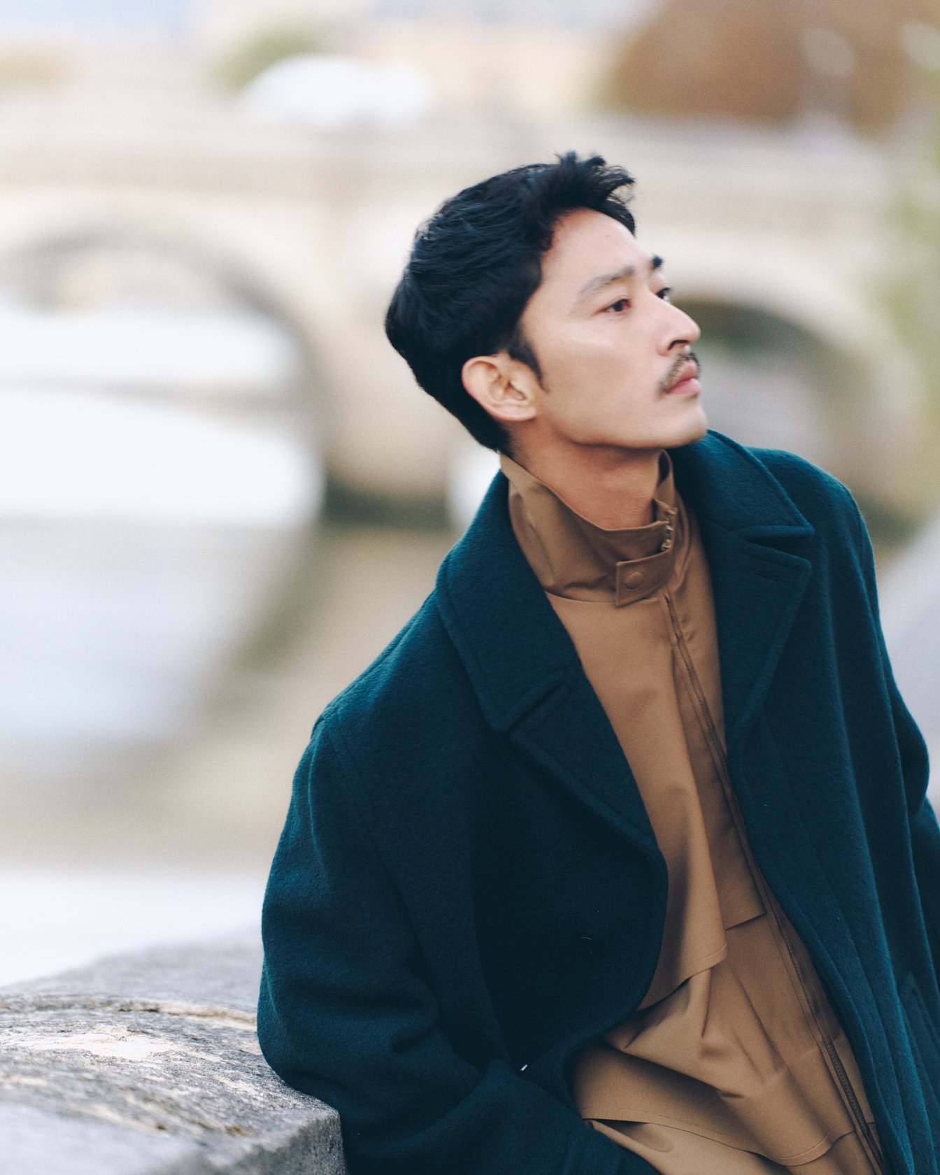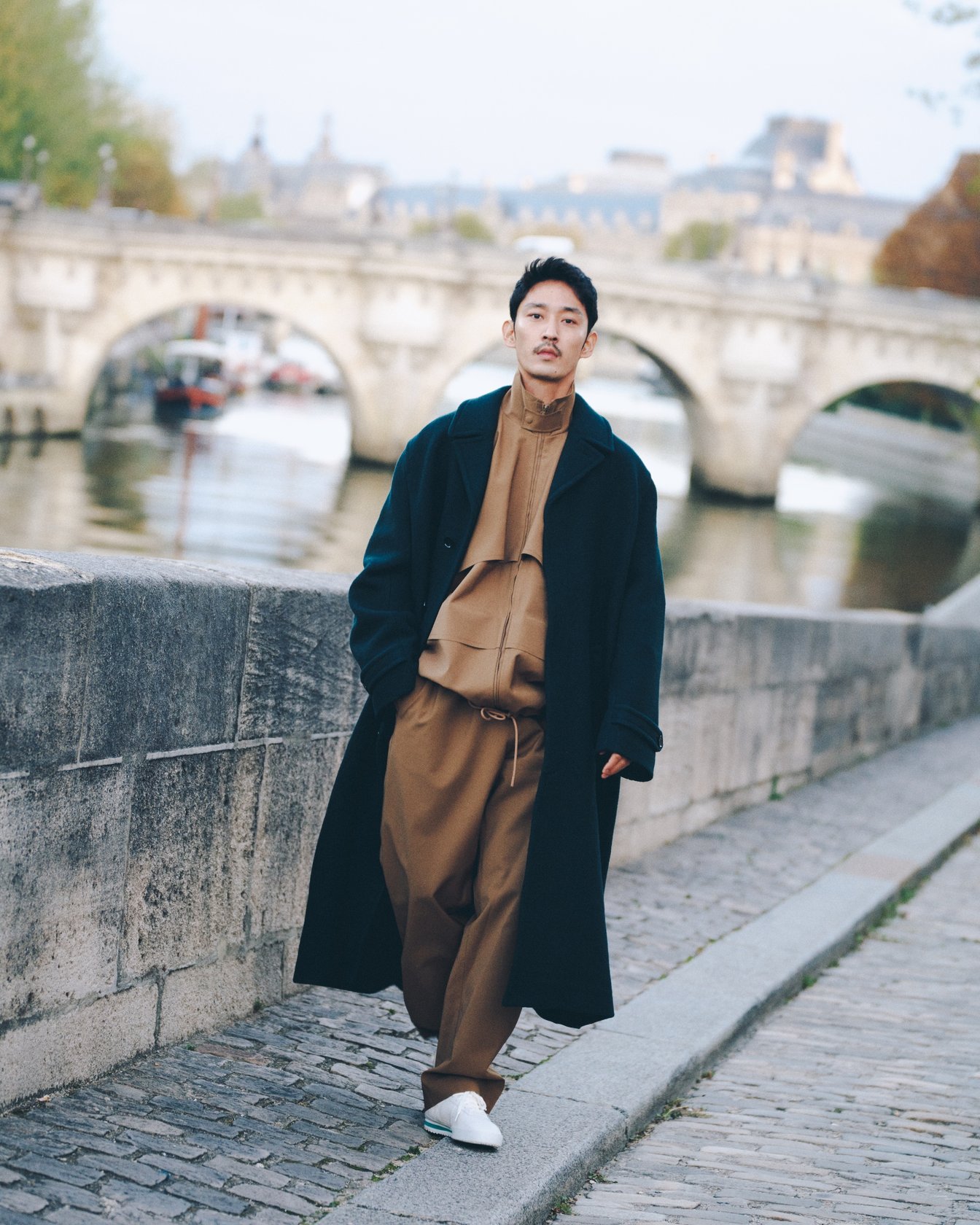 セーヌ川沿いを歩く上杉さんが纏うのは、深いグリーンのコートとベージュのトラックスーツ。テニスをルーツに持つラコステが提案する、スポーツとエレガンスが融合したスタイルだ。「学生時代は私服の学校に通っていたので、ラコステのポロシャツを着て登校していました。当時は90年代ストリートの文脈で着ていましたが、年齢を重ねるごとに質の良さや素材感、上品さに気づいていきました」。