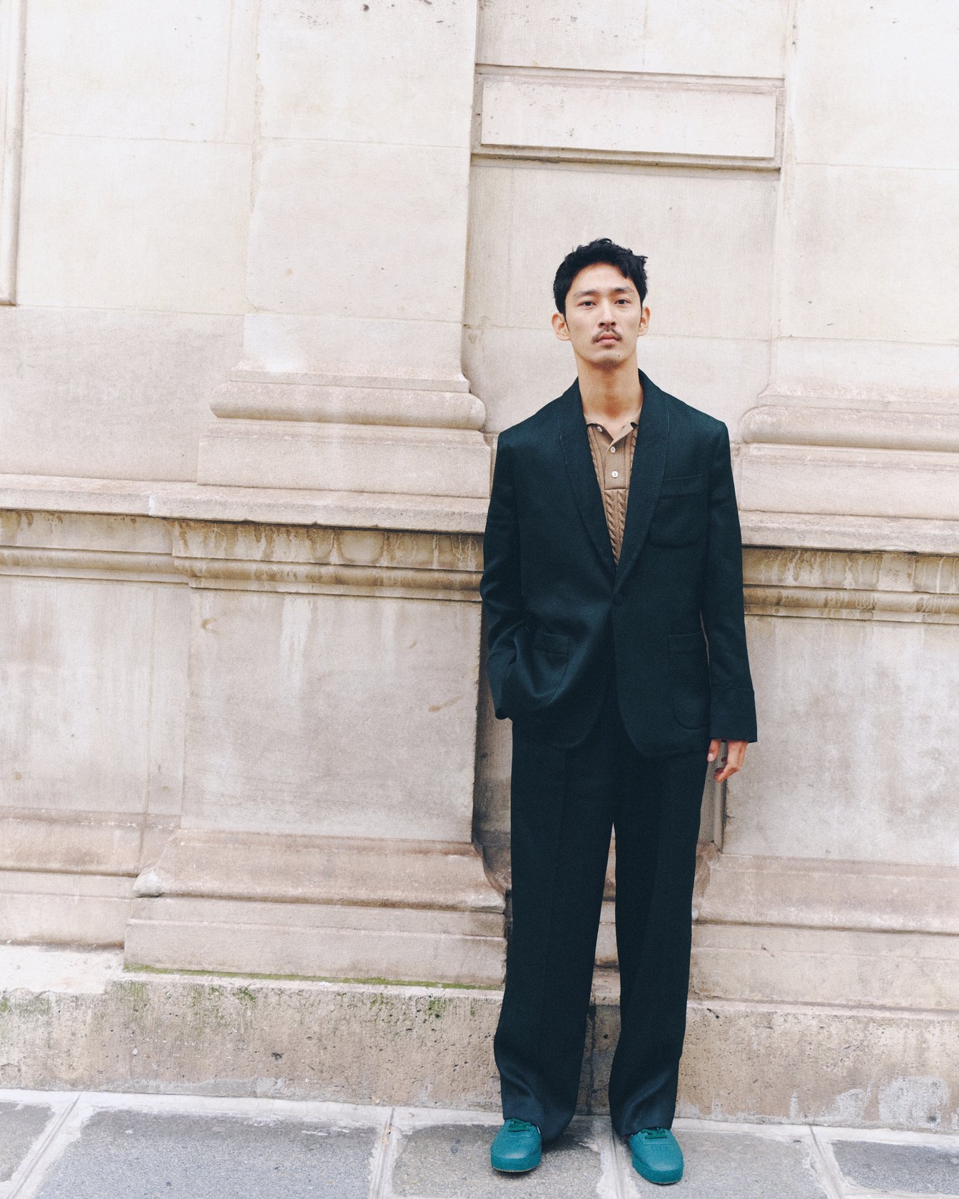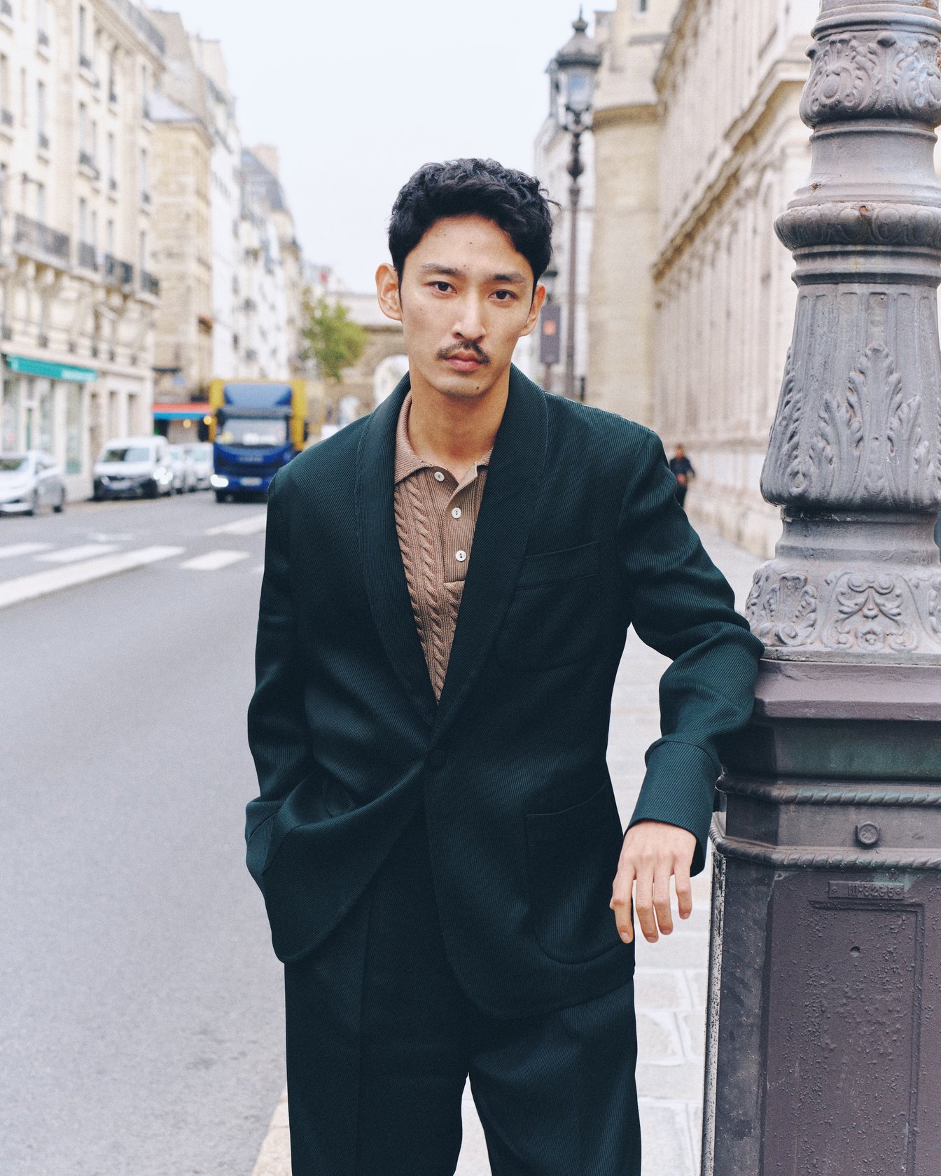 数百年前に建てられた歴史的建造物が並ぶパリの街並み。ダークグリーンのテーラードジャケットとパンツのセットアップ、ベージュのニットポロを合わせた上杉さんは、その風景に自然と調和する。「パリの街を歩いていると、グリーンを着ている人が多いんです。街並みにすごく馴染む色だなと感じました。日本でもグリーンは人気ですが、こうした深いトーンならさまざまなスタイルに合わせやすいですね」。今季のダークグリーンはラコステのアイコンのワニを思わせる、シックで落ち着いた色味。パリの建物の壁、石畳のニュアンスカラーとも呼応し、街の空気に溶け合う。
