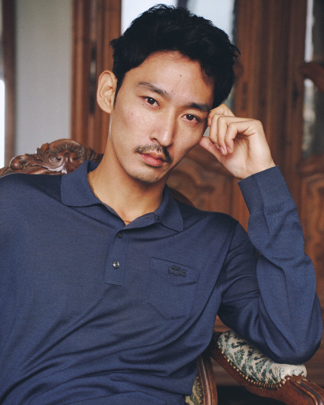 ラコステのアイコニックなロングスリーブのポロシャツは、左胸の同色エンブレムが特徴のなめらかでミニマルなデザイン。テニスプレイヤーからポロシャツを開発し、ブランドを成功に導いた創業者ルネ?ラコステの革新の精神が、モダンにアップデートされた一着だ。俳優?モデル業に限らず、YouTubeなどを通して個人の活動を発信し続ける上杉さん。多彩な表現者として活動する同氏とルネ?ラコステに通じるのは、既成概念にとらわれない革新への挑戦と、伝統を尊重する姿勢だ。「ラコステを着ていると、少し心に余裕ができるような感覚になります。ファッション性とアクティブな時のバランスがすごく取れるブランドで、自分のライフスタイルに近いと勝手に思っています」。