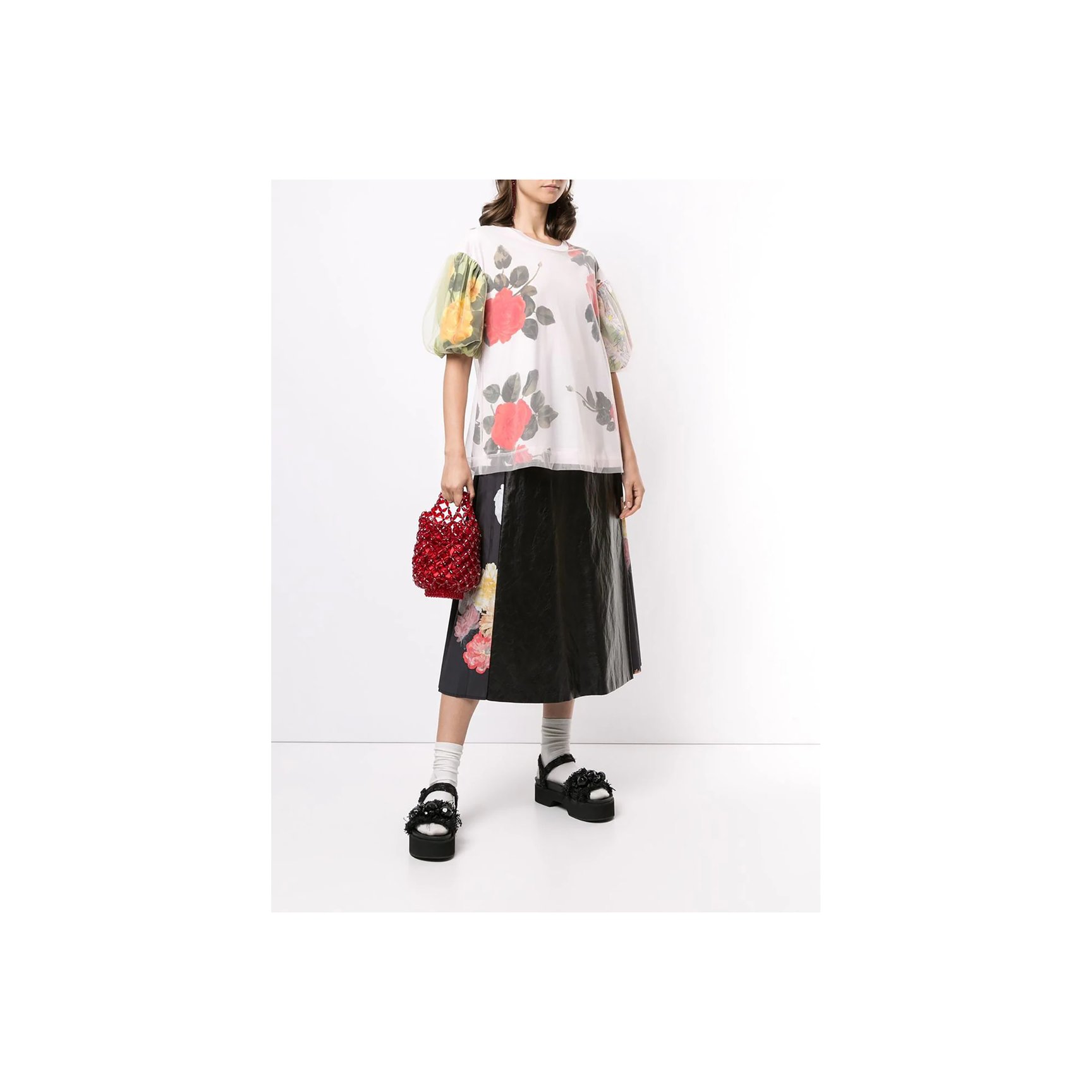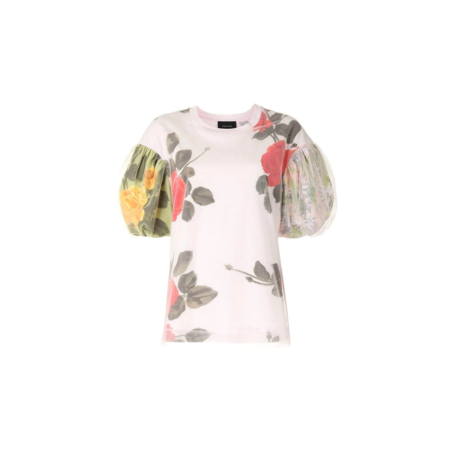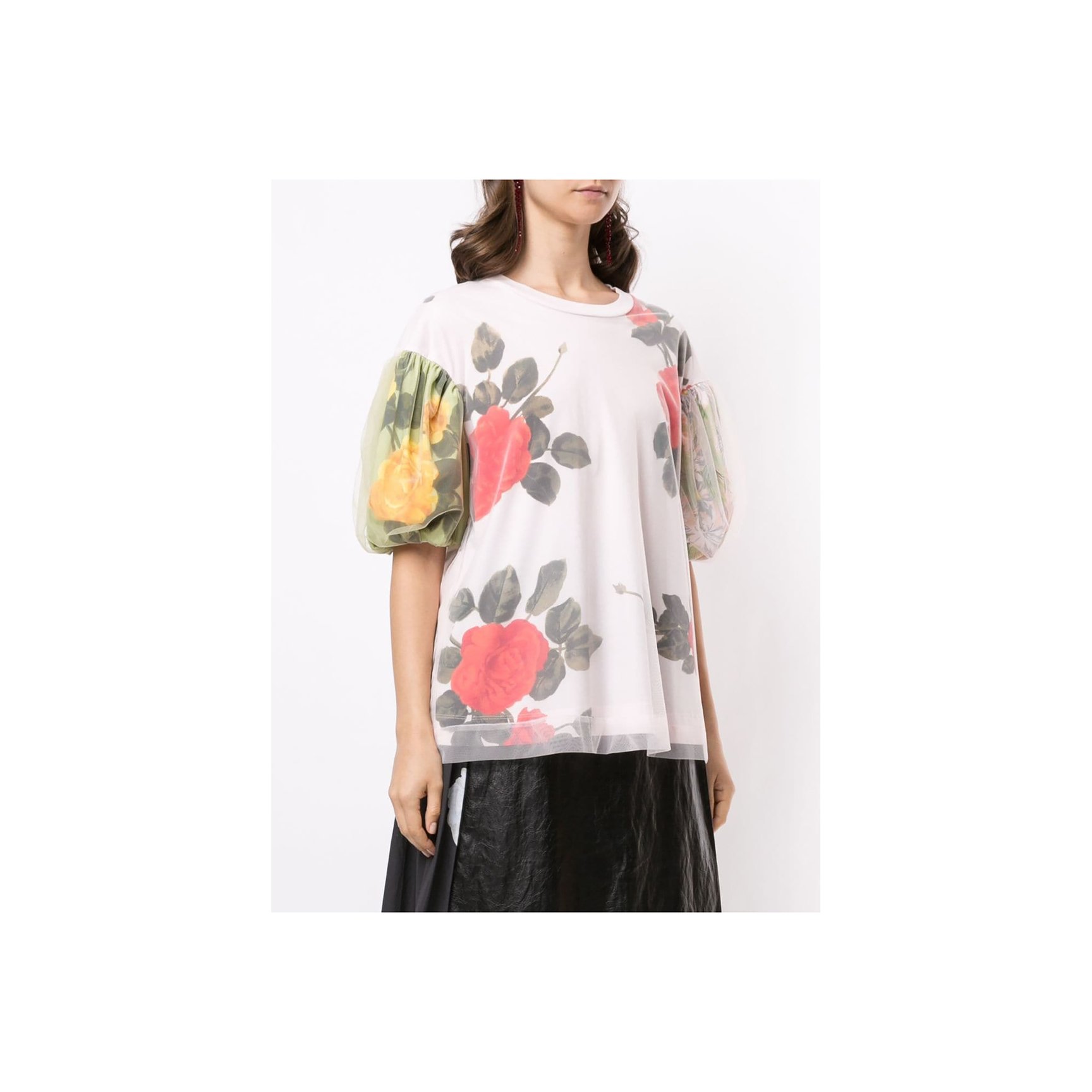 カジュアルアイテムのTシャツも、「シモーン?ロシャ」の解釈ならロマンチックな仕上がりに。ローズがプリントされたオーバーサイズのTシャツは、ふんわりとしたバルーンスリーブのフォルムを強調するチュールがあしらわれています。