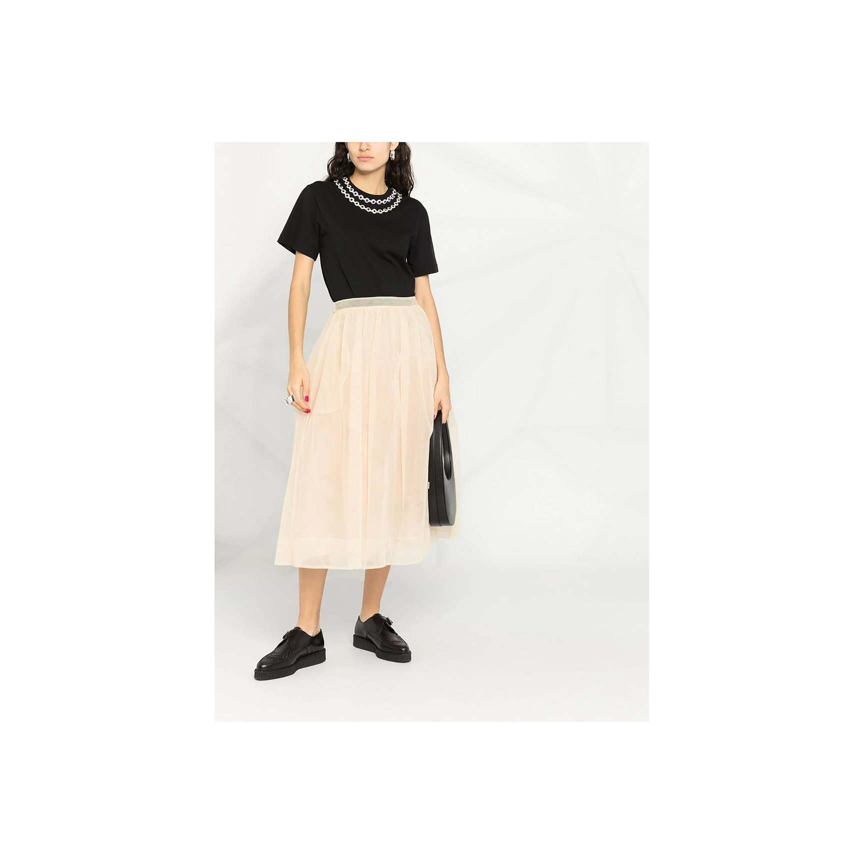 こちらもチュール使いが優美なTシャツですが、ウエスト部分できゅっとすぼまったシルエットに。袖や裾のボリューミーなディテールを引き立てていますね。