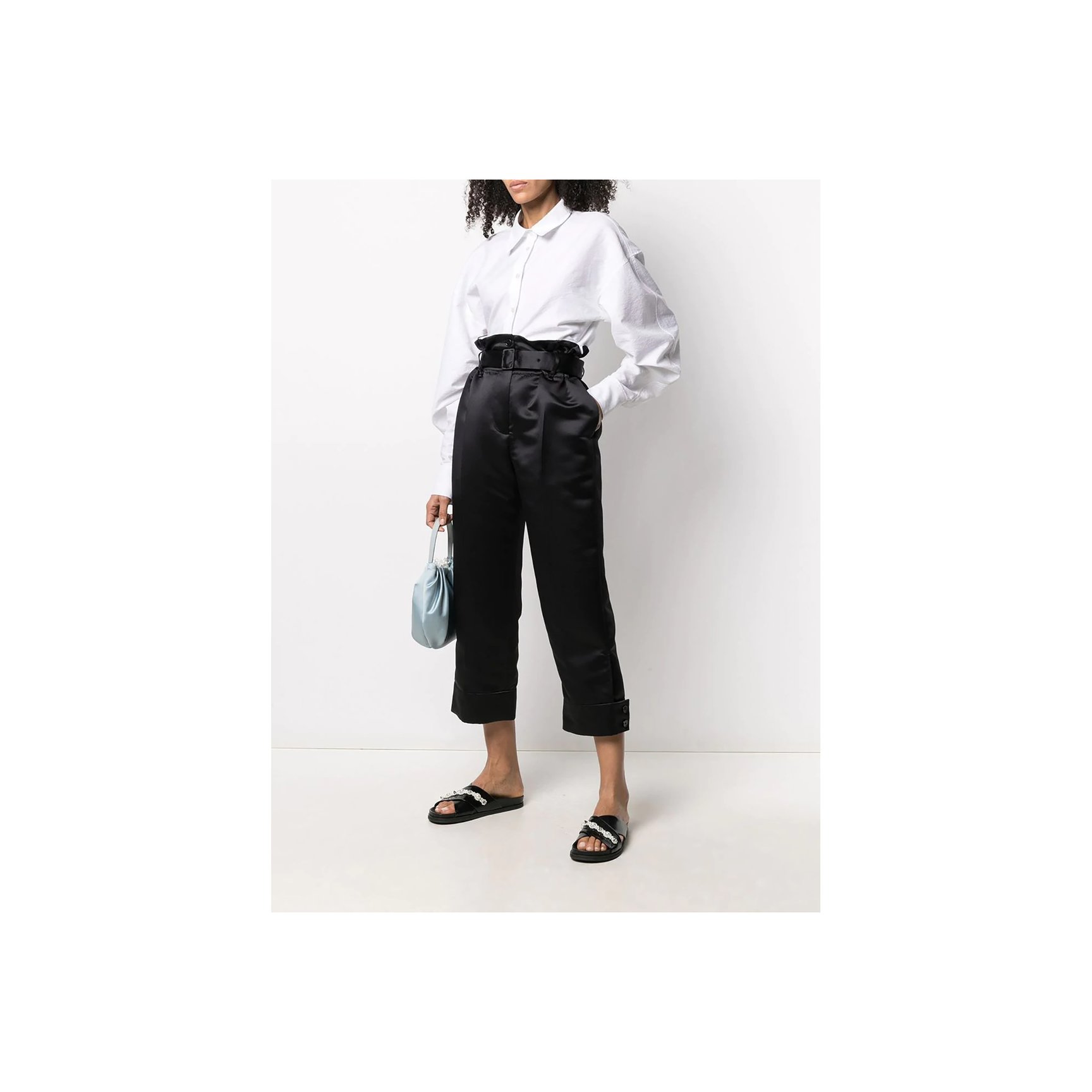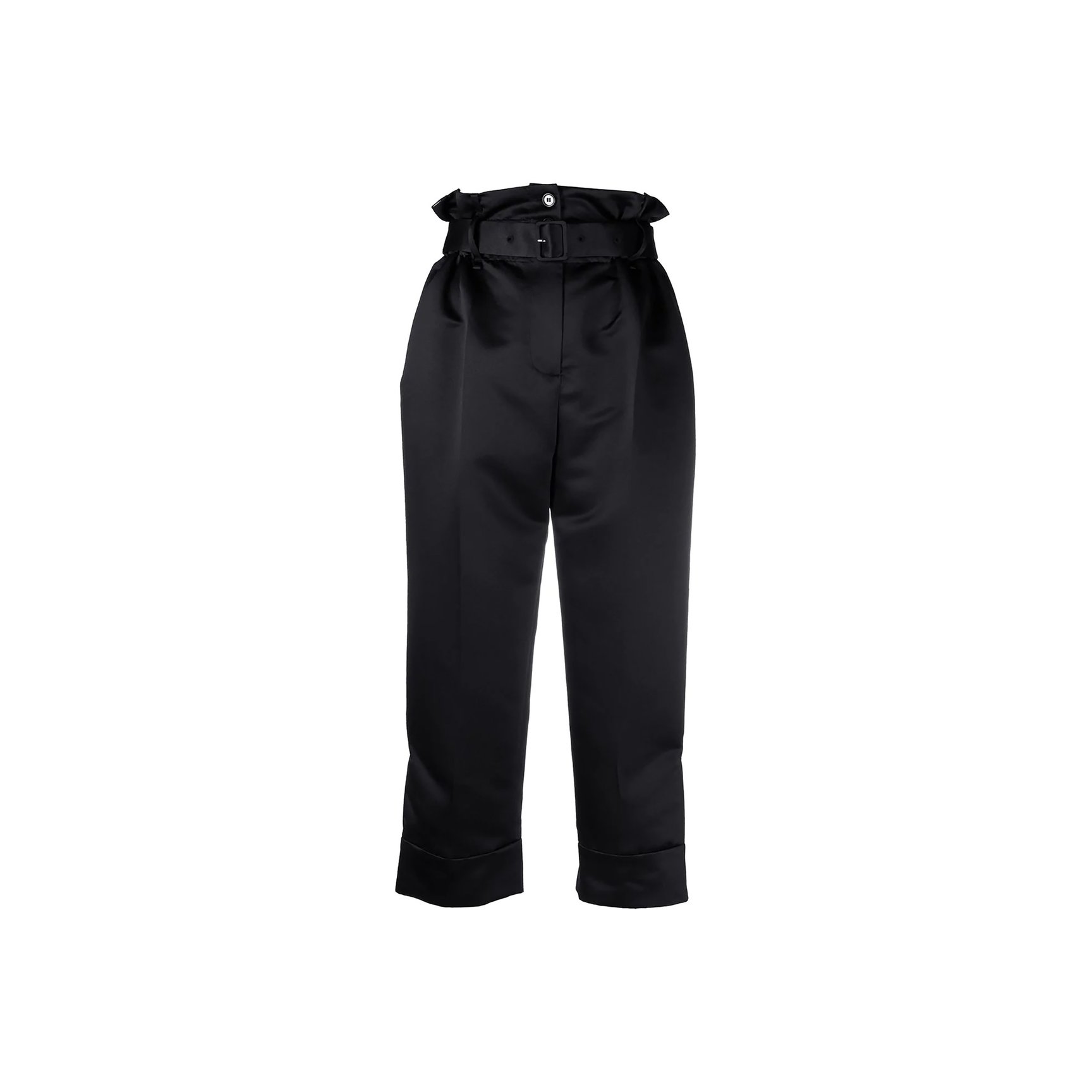ウエスト部分のベルトがアクセントになった、ペーパーバッグスタイルのクロップドパンツです。ややボーイッシュなテイストを、上質な素材で大人の女性の装いに格上げしてくれています。