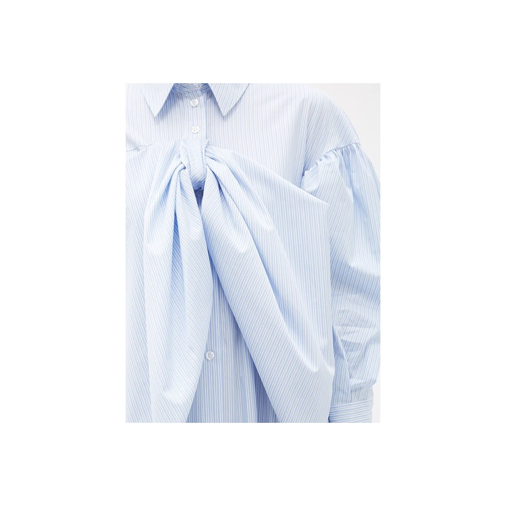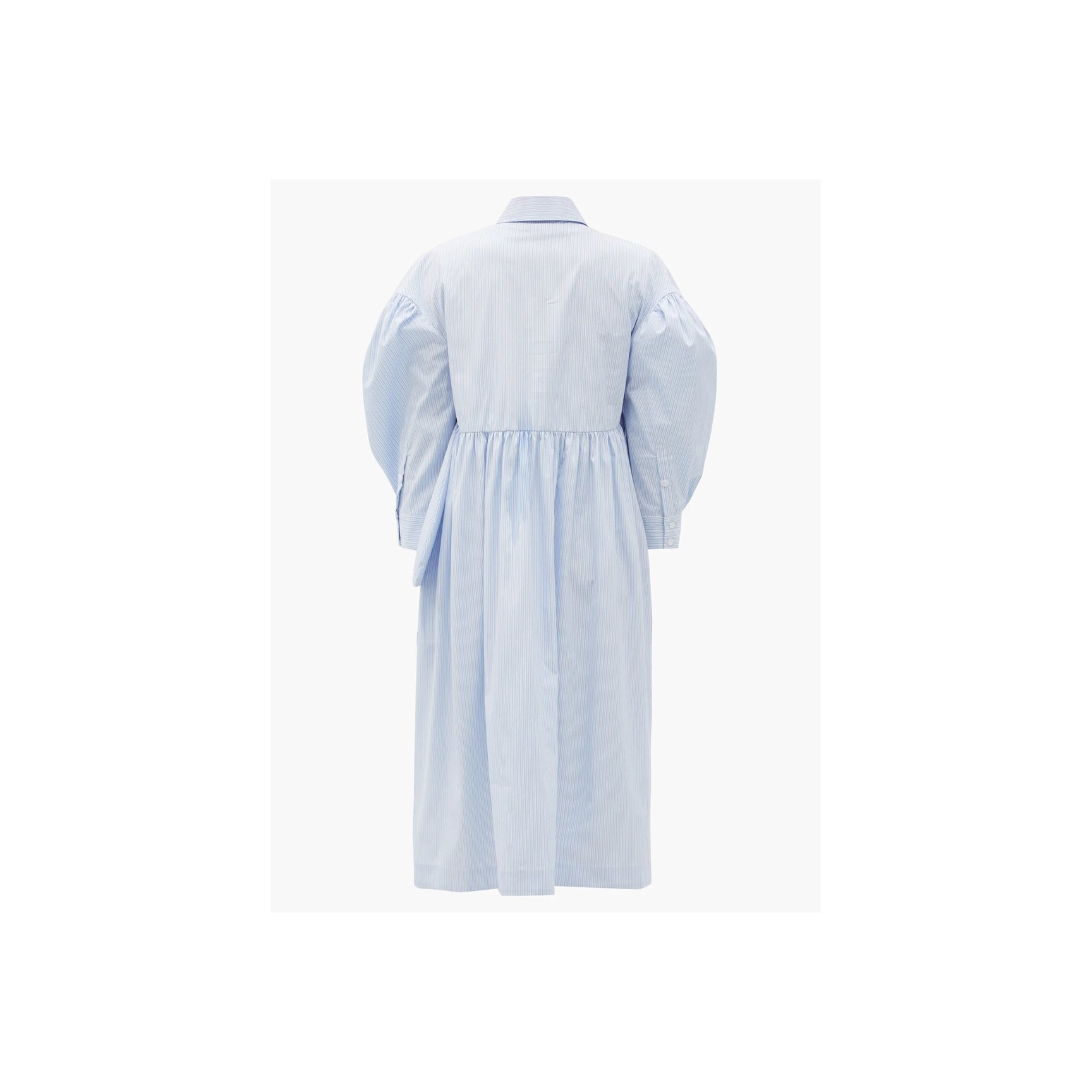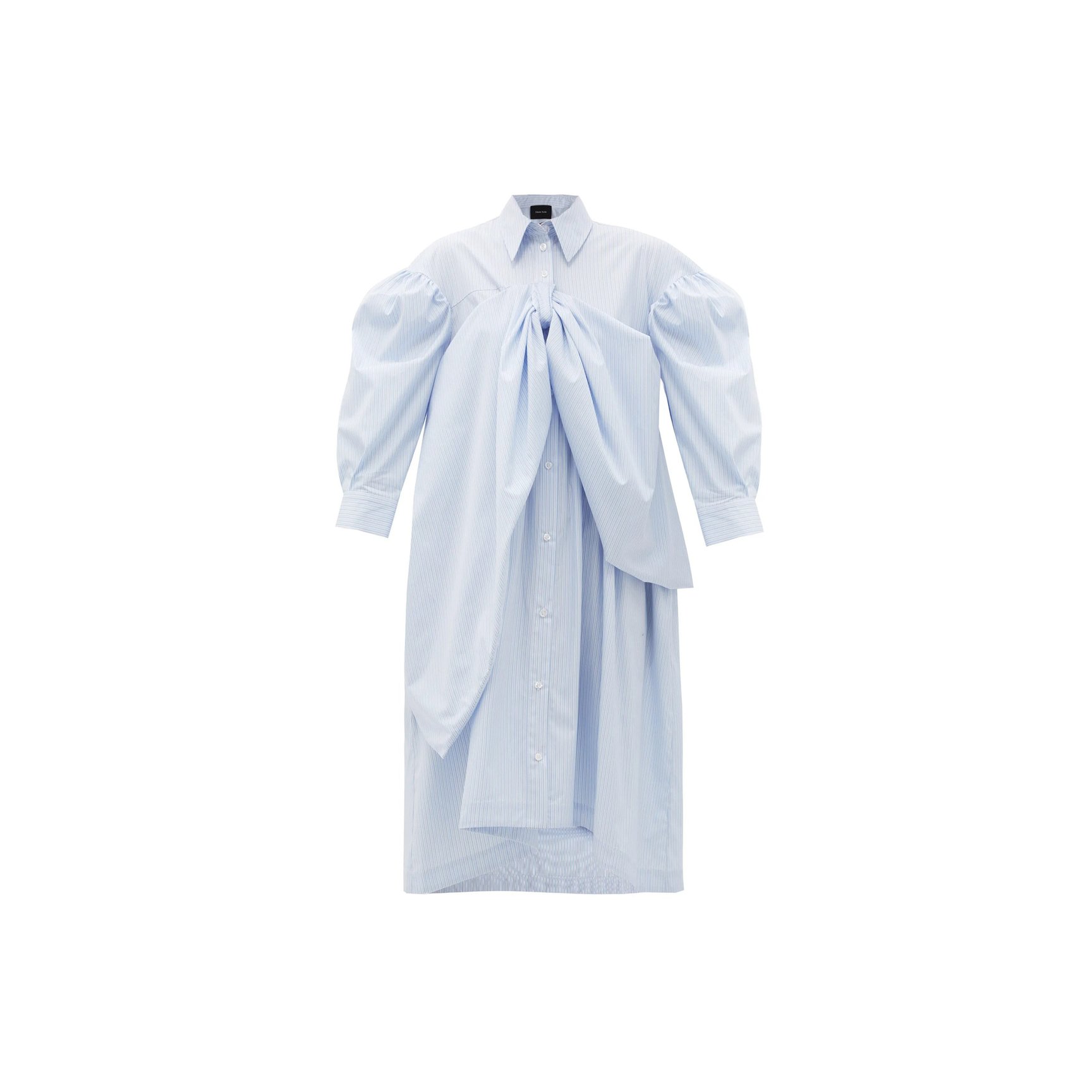 ポプリン素材とブルー×ホワイトのストライプの組み合わせのシャツドレスは数あれど、「シモーン?ロシャ」は立体的なシルエットで勝負。胸元を飾る超ビッグサイズのリボンとパフスリーブでひねりが加えられています。