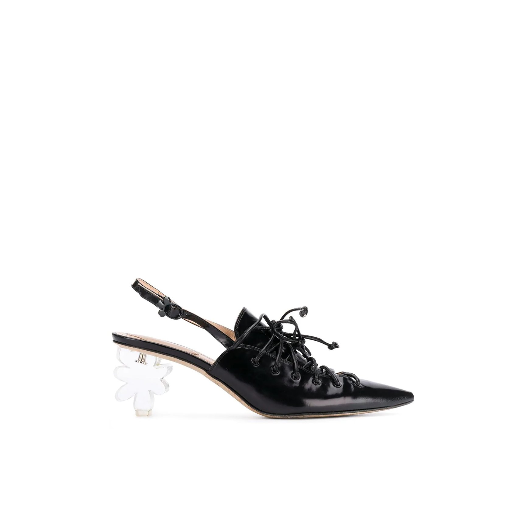 バックストラップのレースアップパンプスは、ポインテッドトゥがシャープな印象。芸術的なクリア素材のフローラルモチーフヒールが抜け感を演出してくれています。
