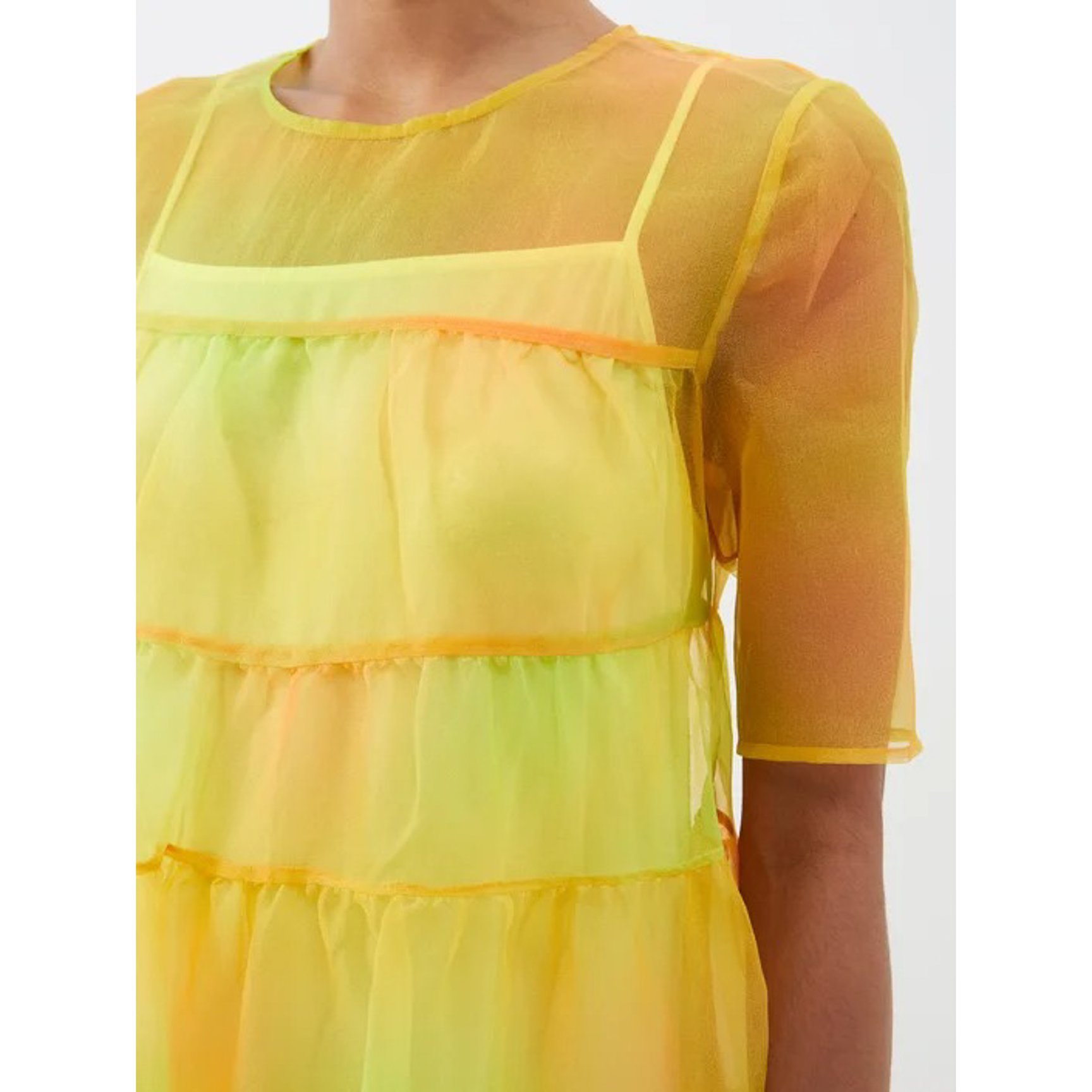 オーガンザ生地の透け感や、歩くたびにふわりとなびくボリューム感がどこかロマンチックな「スタウド(STAUD)」のワンピース。季節感のあるオレンジ×イエローのカラーリングがフレッシュな印象を演出。