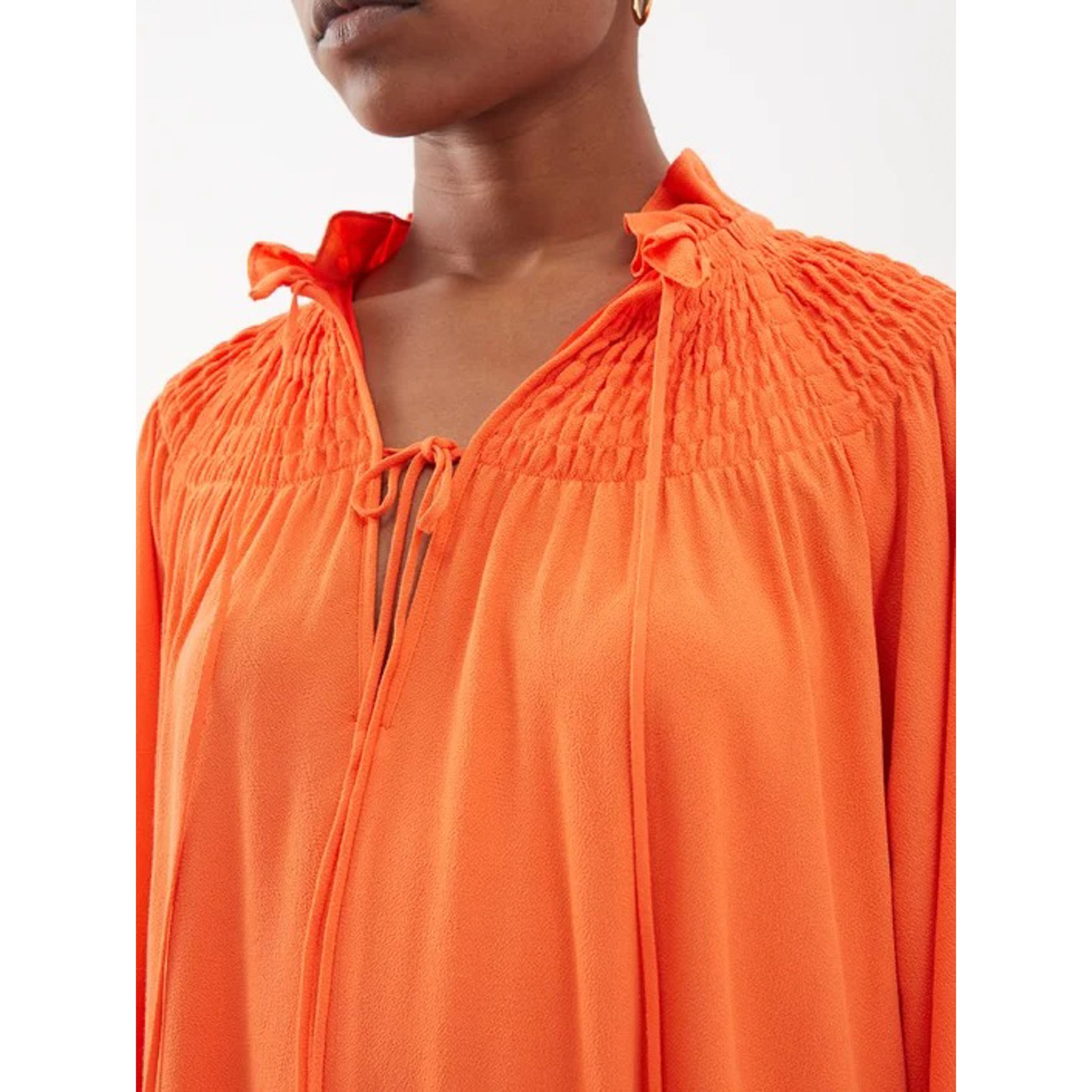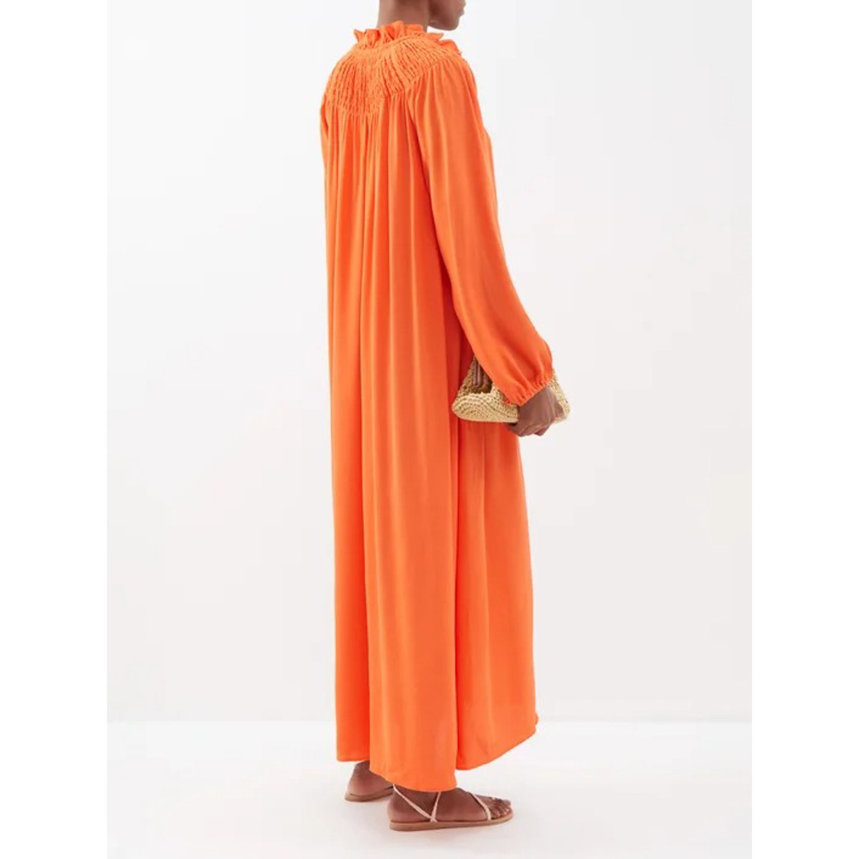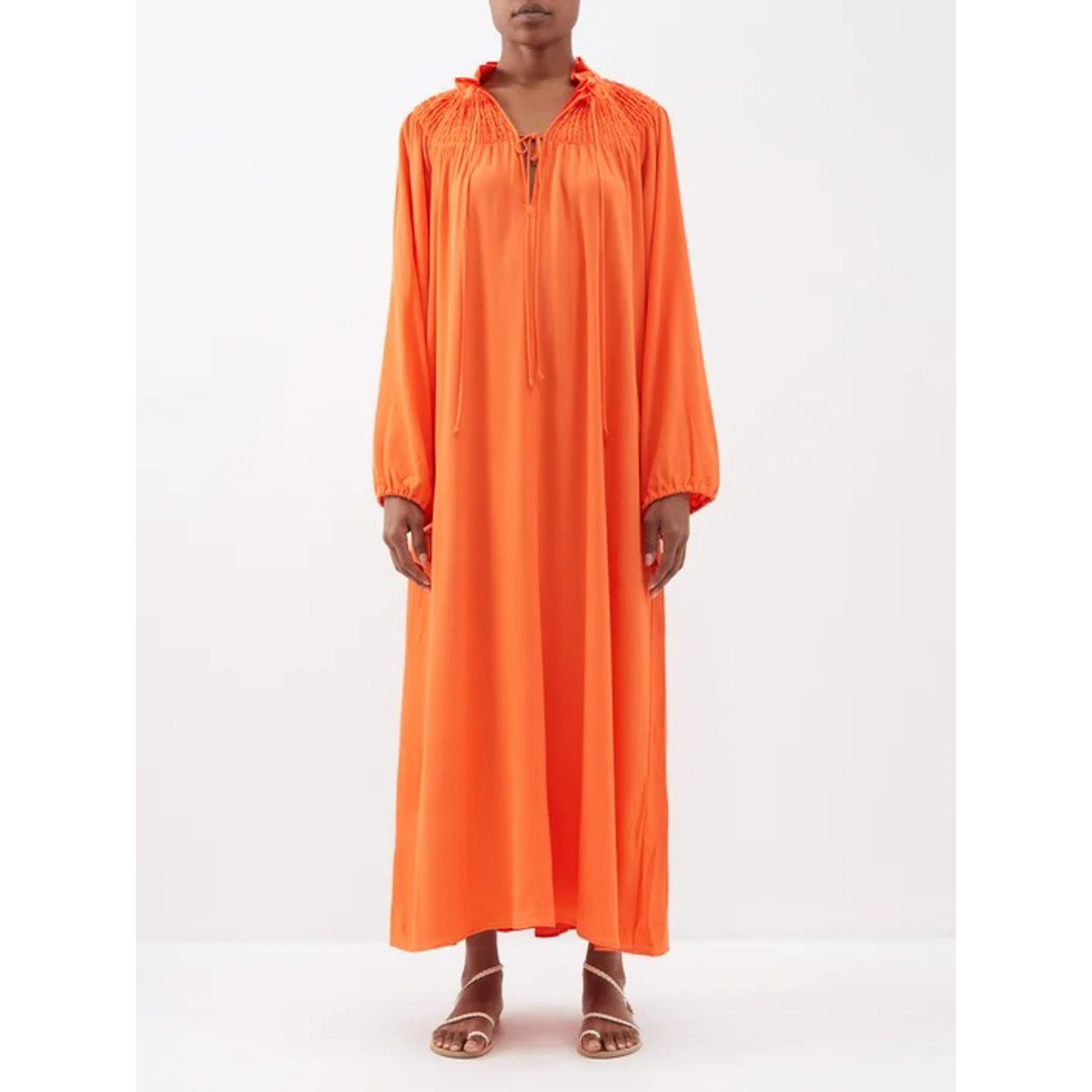 リラックス感のある「スリー?グレイス?ロンドン(THREE GRACES LONDON)」のスモックドレスは、ビーチで過ごす日にもぴったり。鮮やかなオレンジが夏の景色に映える1着です。