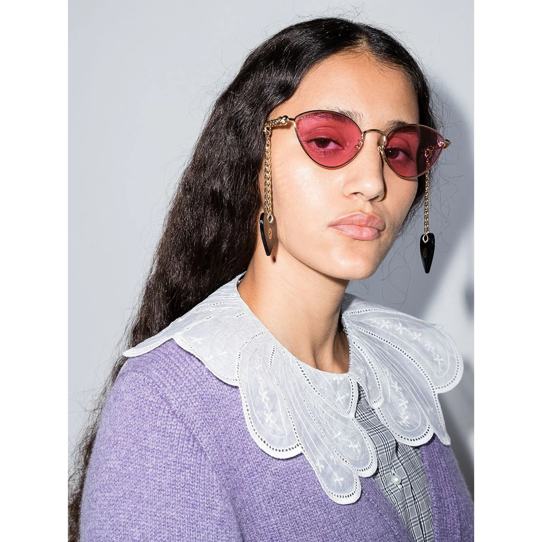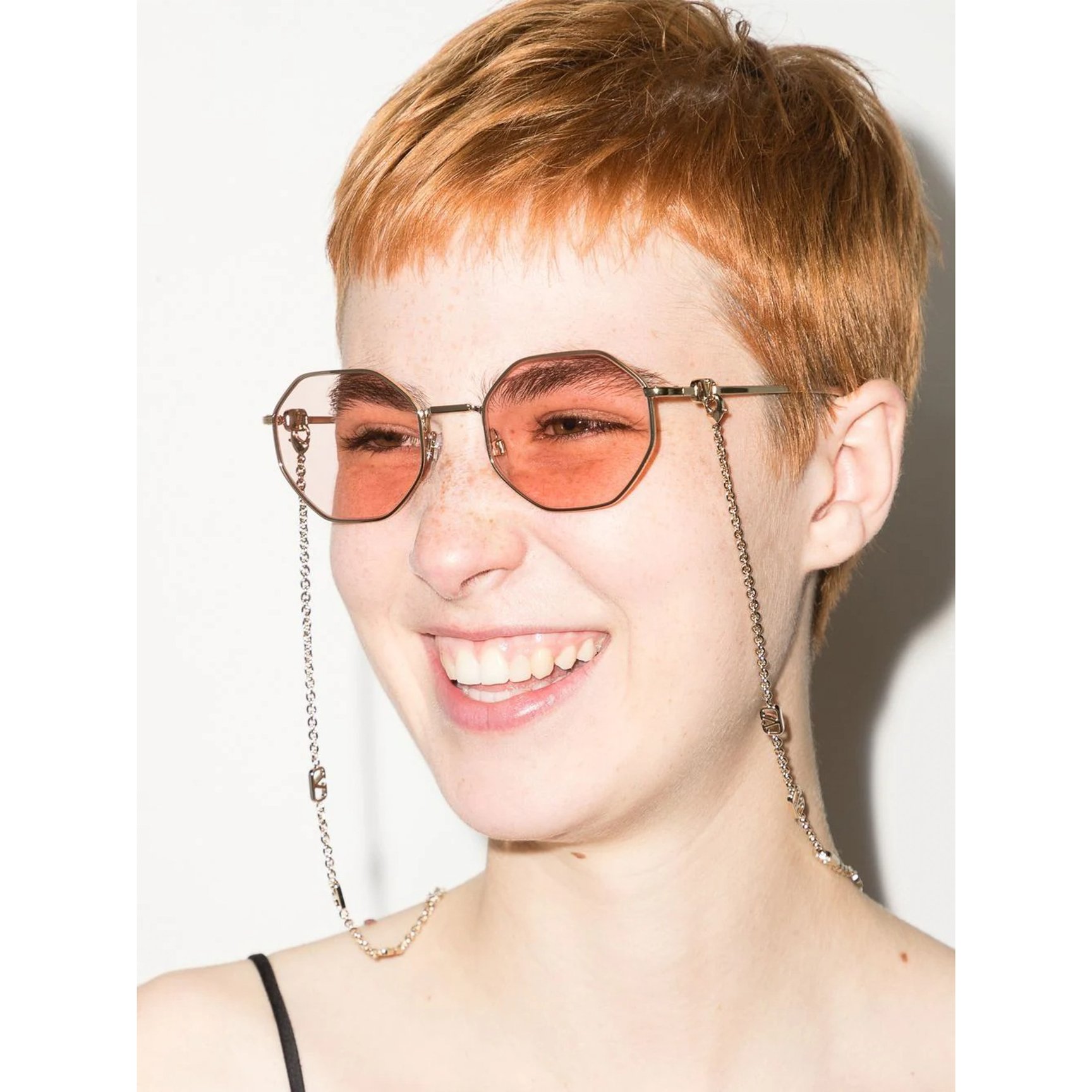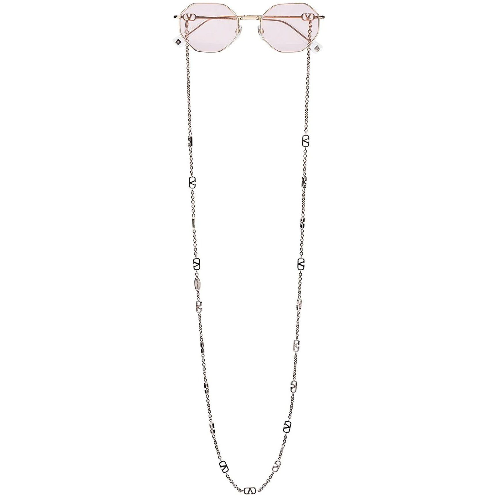 最後にご紹介するのは、ネックチェーンが揺れる「ヴァレンティノ(VALENTINO)」のサングラス。淡いピンクがやさしく目元を覆う、クラシカルな八角形のフレームがチャームポイント。色違いには、シックなグレーレンズなどもラインナップしています。