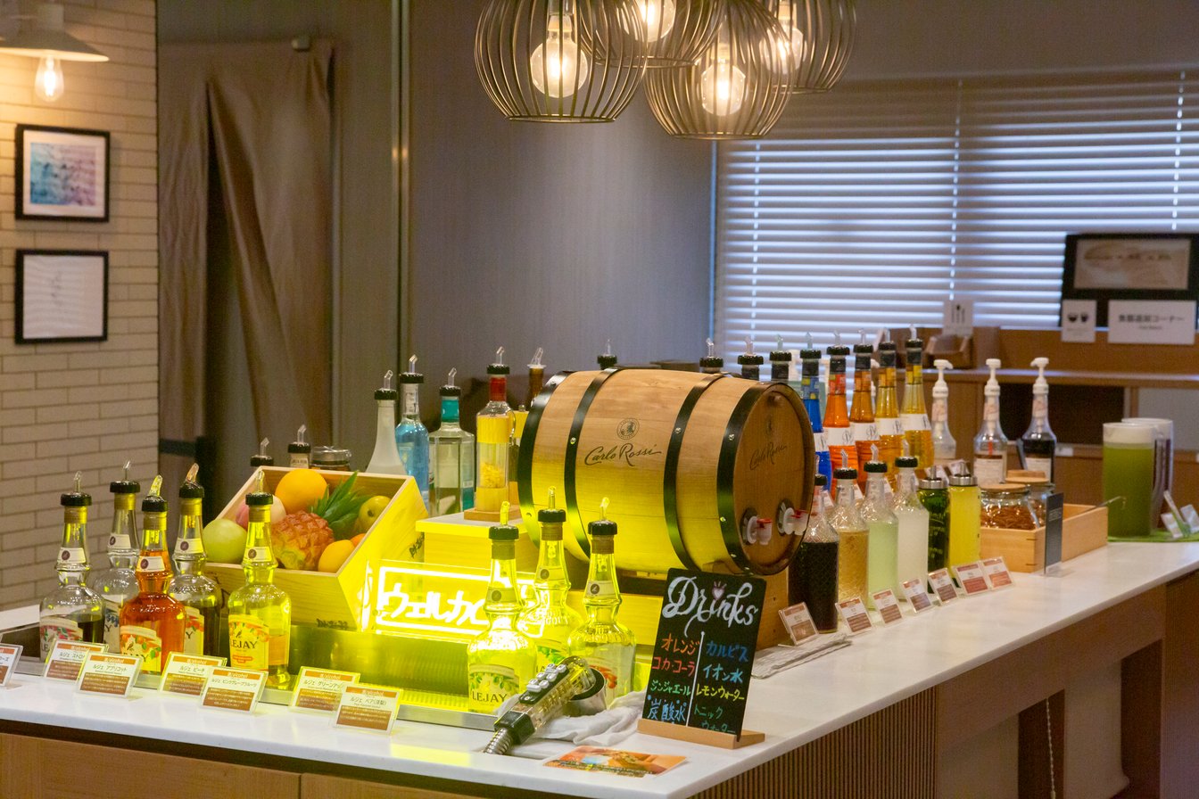 17時からはロビー奥のウェルカムラウンジに宿泊者限定ウェルカムバーがオープン。ここではウィスキー、焼酎、日本酒、ジン、リキュール、ウォッカ、ワインなど豊富なアルコール類とソフトドリンクを用意している。20時まで営業しているためチェックイン後の夕食前後や就寝前まで、リラックス目的で気軽に立ち寄れそうだ。