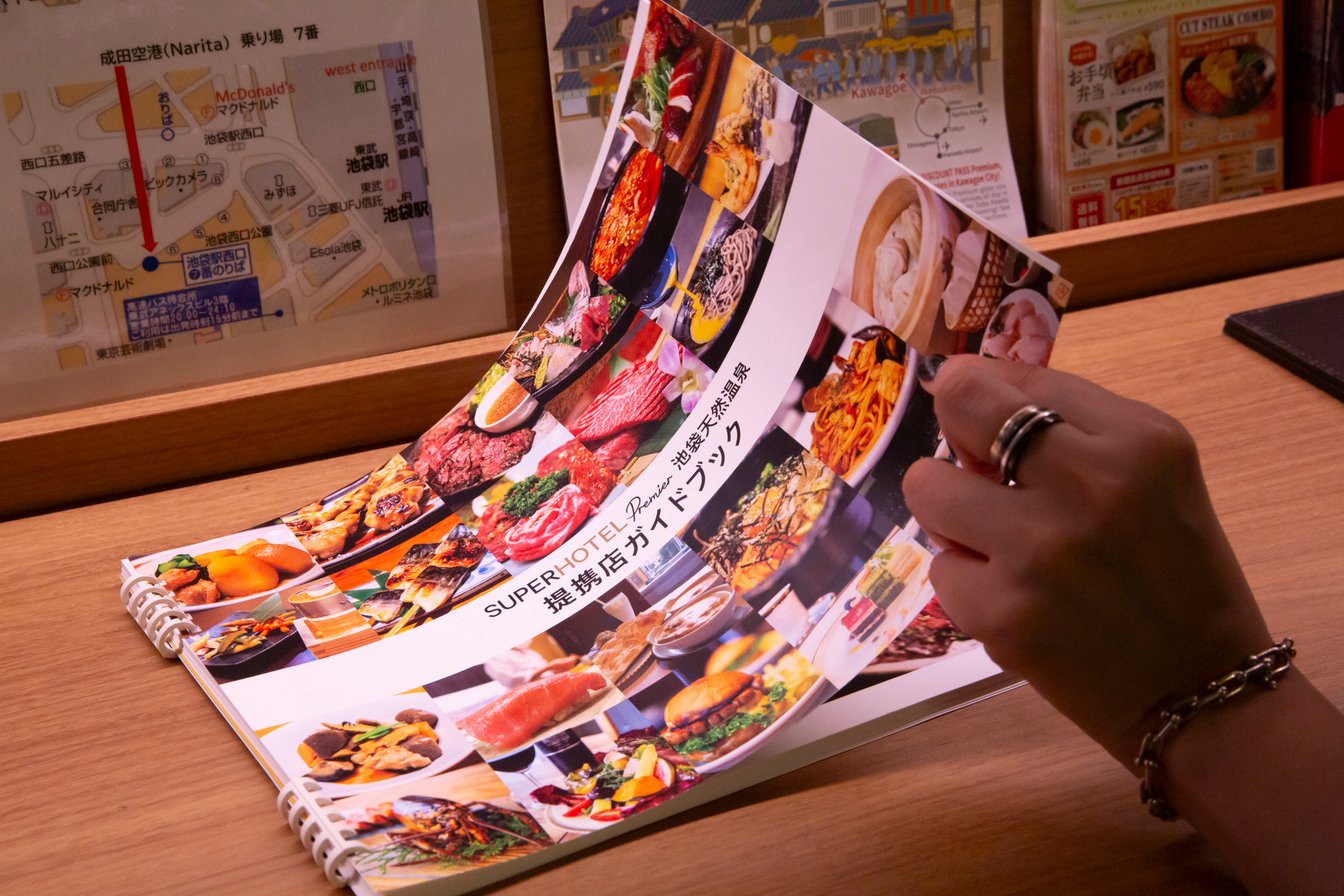 ウェルカムバーでほろ酔い気分になったらいよいよ夕食の時間。スーパーホテルでは地域貢献プロジェクトの一環として2020年から「ご当地結びスタ」を実施している。スタッフがホテル周辺の情報を収集し、オシャレなイタリアンやフレンチ、家族で楽しめるダイニングレストランまで和洋折衷おすすめの飲食店や観光スポットなどを紹介するプロジェクトだ。提携しているお店ではプランによって食事チケットを使用することもできる。さっそくロビーにある「提携店ガイドブック」をめくってみると、気になる居酒屋を発見。その名も「おつかれちゃん」。ホテルから徒歩1分の赤い看板が目印。はじめて池袋を訪れる人でも迷うことはなさそう。