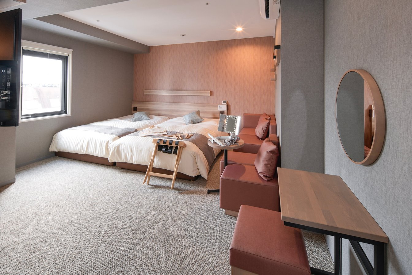 枕やアメニティをゲットしたらいよいよお部屋へ。今回宿泊したのは約18平方メートルのレディースツインルーム。140幅のダブルベット2台が設置され、2人でも充分な広さ。オリジナルマットレスはポケットコイル5ゾーン構造で、理想的な寝姿勢を保つことができる。絶妙な弾力性で心地よい眠りが満喫できそうだ。インテリアは女性スタッフの声を取り入れデザイン性を高め、モダンなピンクのソファーや快適な睡眠に適切な照明に設定できるペンダントライトなど、五感に訴えかける空間づくりを追求。館内には4階に女性専用フロアを設けるほか、13階にもレディースルームを備えている。