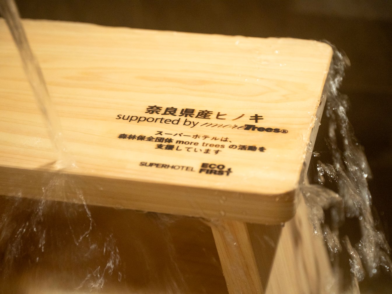 浴室のバスチェアには奈良県産のひのきを使用し、森の豊かさを守るmore treesの活動支援に役立てられている。スーパーホテルは2001年から環境保全活動に取り組み、ホテル業界で唯一、環境大臣からエコ?ファースト企業に認定されている。CO2フリー電力やカーボン?オフセット※1を活用した環境配慮型宿泊サービス「CO2実質ゼロ泊」で、排出されるCO2が実質ゼロに。クオリティの高い宿泊体験を楽しみながら、環境保全に貢献できるも醍醐味の一つ。
