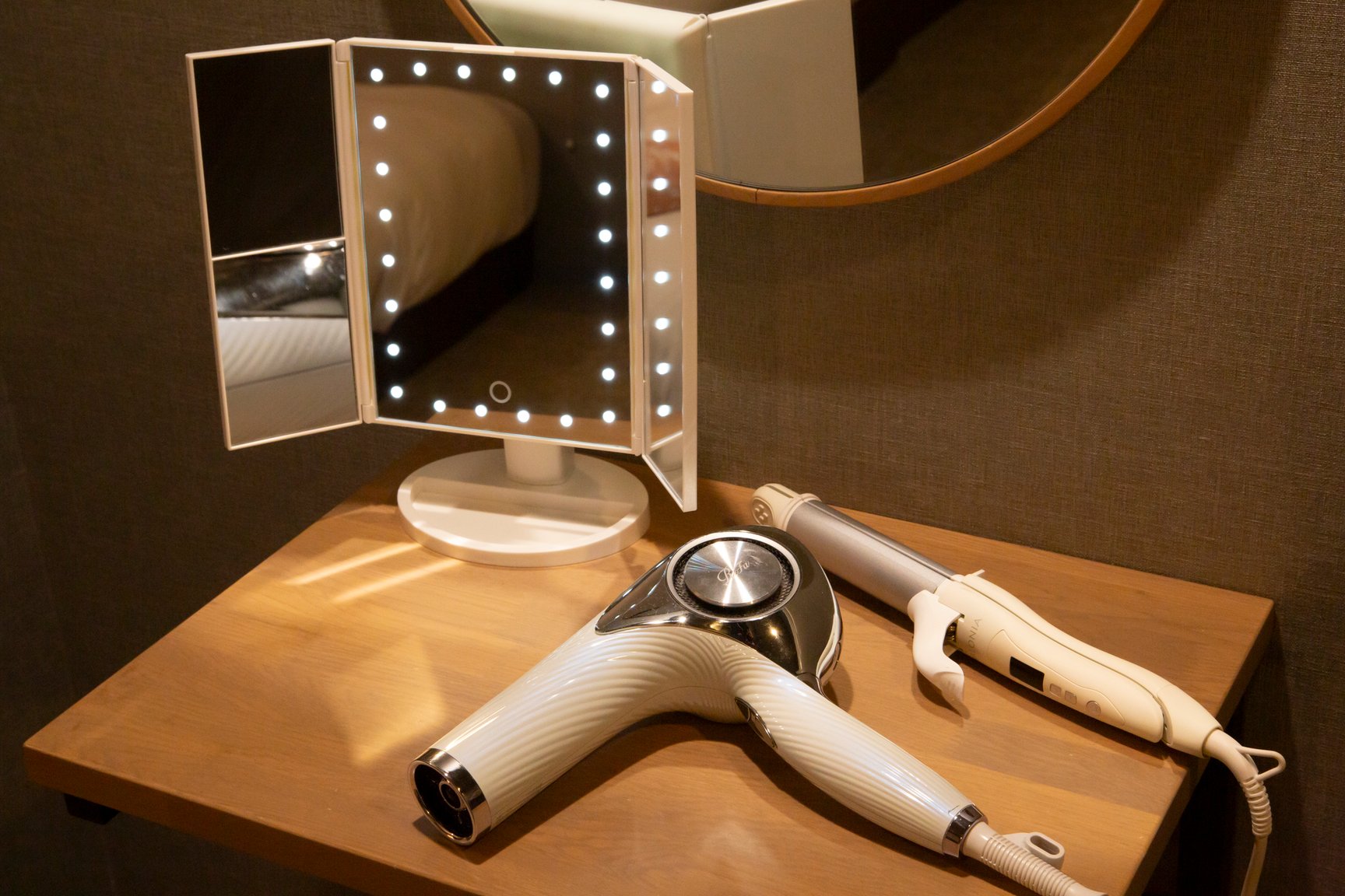 室内浴室のシャワーヘッドは「リファ(ReFa)」を導入し、「リファビューテック ドライヤー(ReFa BEAUTECH DRYER)」は全室に設けられている。女性への配慮はほかにも。荷物が多い時に使用するバゲージラックを設置するほか、ハンガーは女性の肩幅に合わせた小さめサイズに。また、メイクがしやすいよう女優ミラーやヘアアイロンも用意。