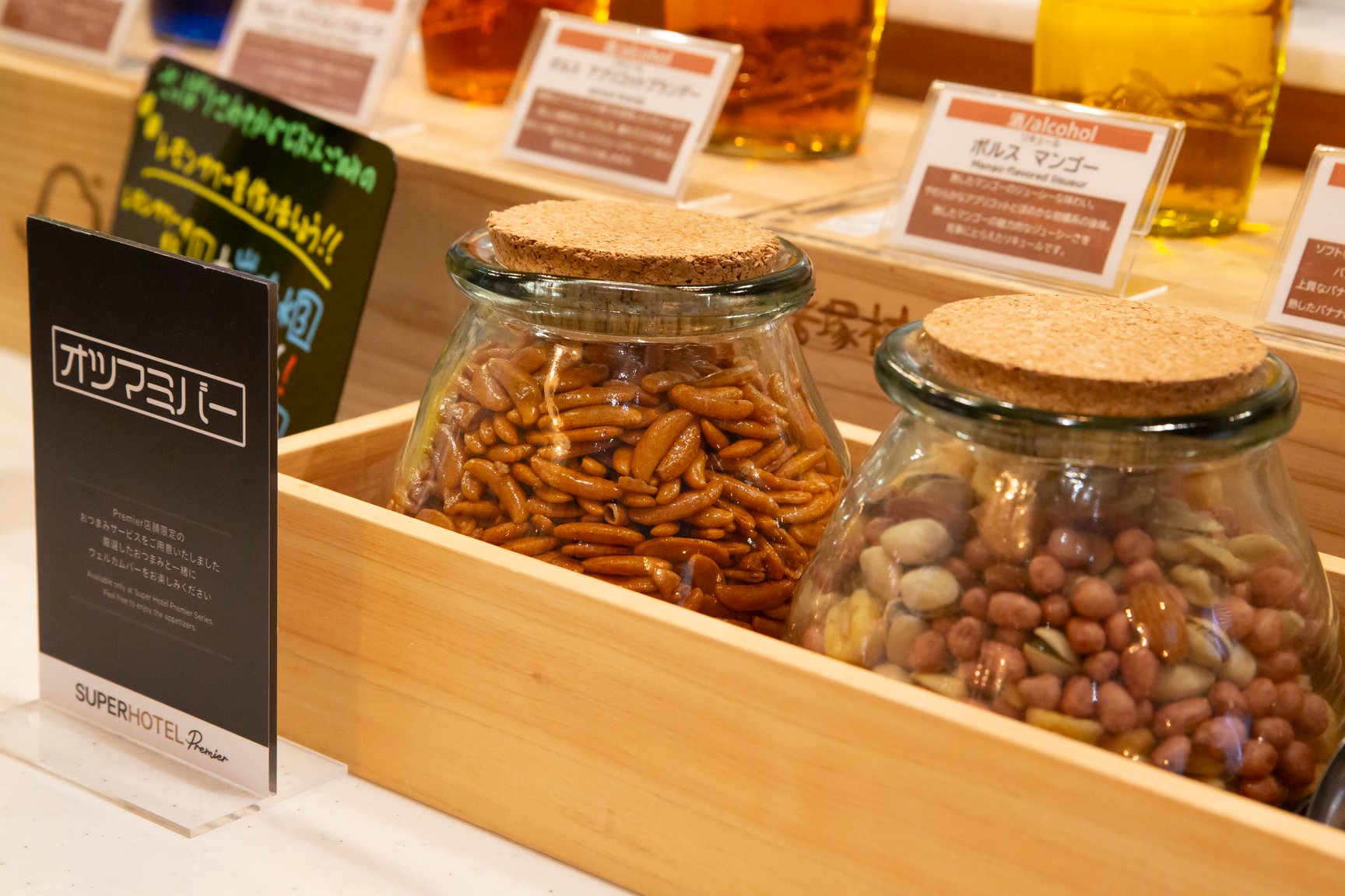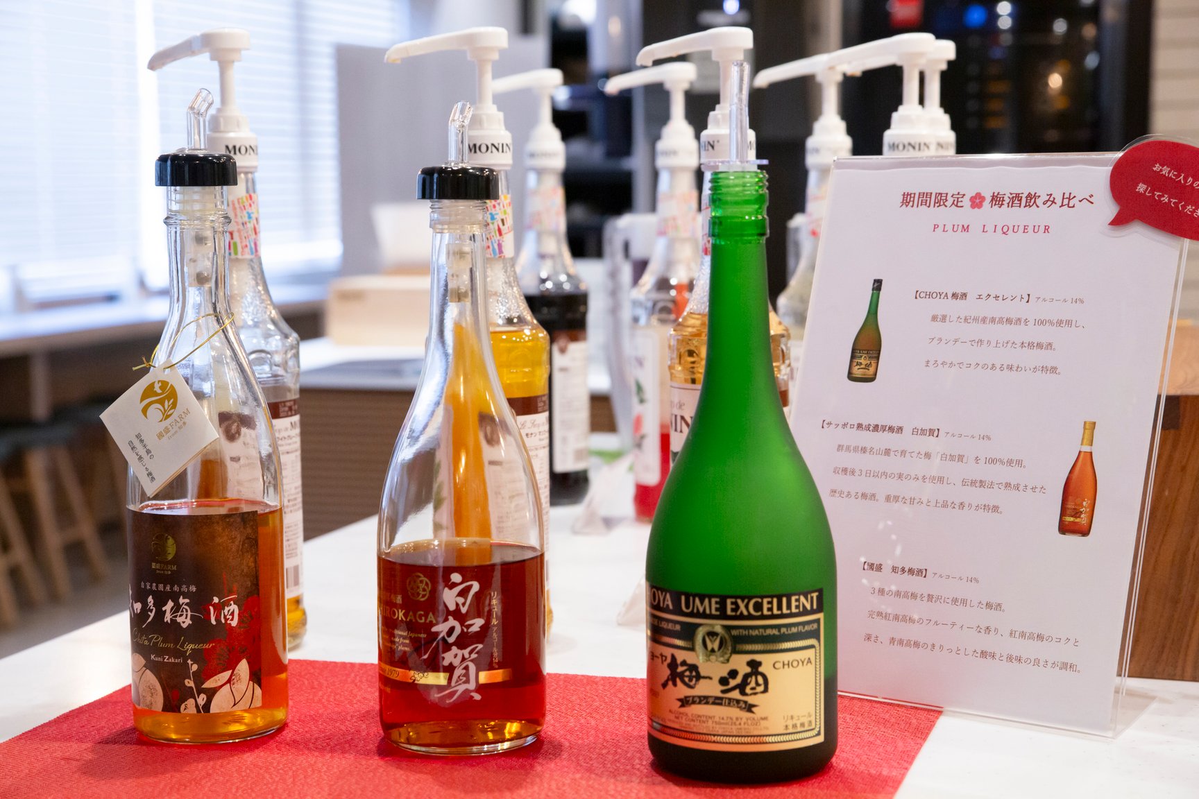 同館のウェルカムバーはカップで注ぐセルフサービススタイルで、お好みのリキュールを混ぜたオリジナルドリンクも人気。フランボワーズシロップリキュールは飲みやすく、ほんのりした甘酸っぱさと炭酸が心地よく溶け合い1日の疲れを癒していく。ナッツ類のおつまみにも好相性だ。アルコールが苦手な人はリキュールを使ったモクテル(ノンアルコールカクテル)やソフトドリンクもあり、大人から子どもまで楽しむことができる。このほか、東京蔵人や赤霧島、いいちこシルエットといった国産の酒類をセレクト。店舗ごとに異なるお酒を提供し、地元に根差した企画を行っている。期間限定の飲み比べも人気で、3月は梅酒の3種飲み比べを実施。紀州産高梅を100%使用した「CHOYA梅酒」と、群馬県榛名山麓で育てた白加賀梅100%使用のサッポロ熟成濃厚梅酒「白加賀」、3種の南高梅を贅沢に使用したフルーティな國盛「知多梅酒」の3種を提供。こちらは旬によって異なるため、訪れるたびに季節感を楽しむことができる。