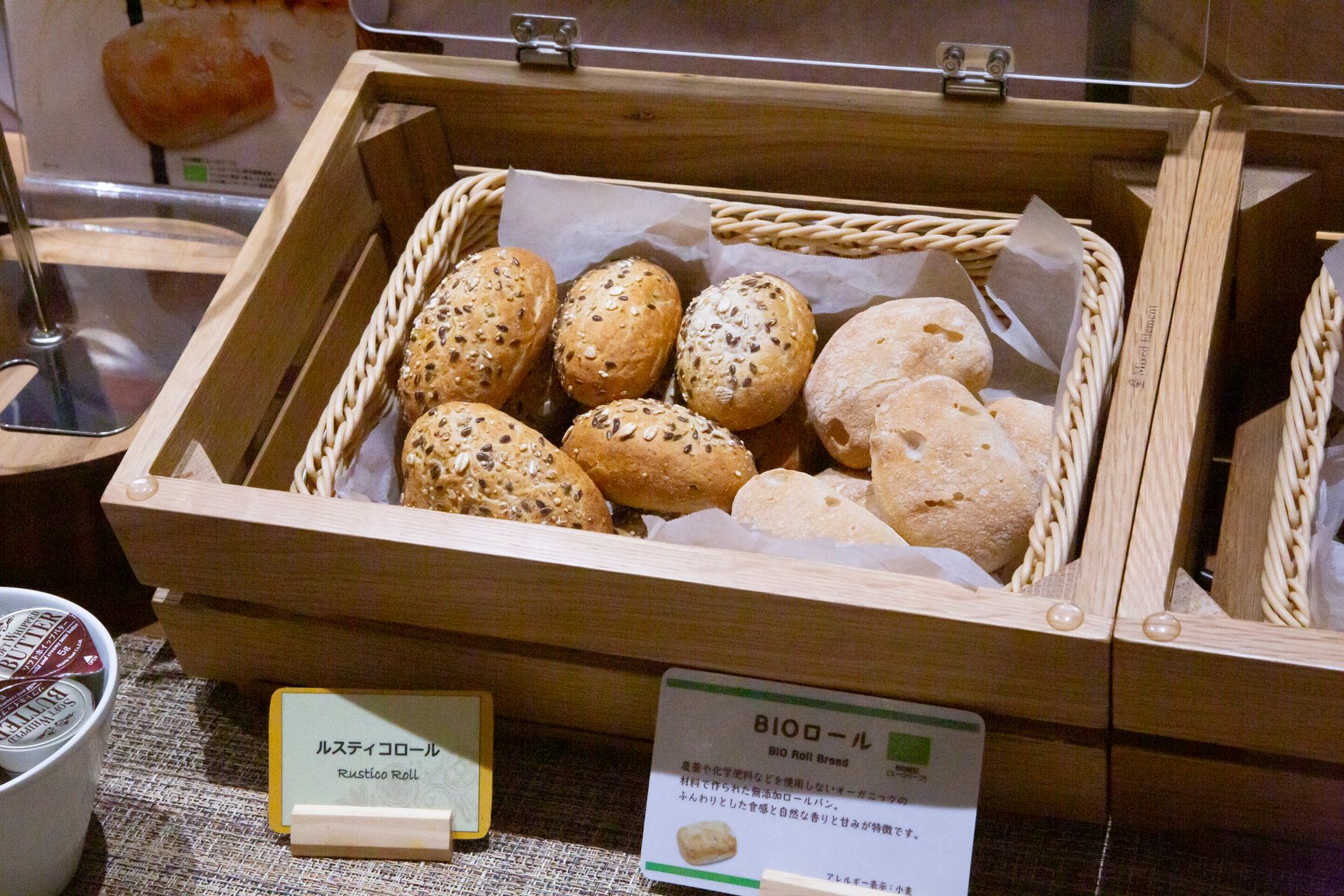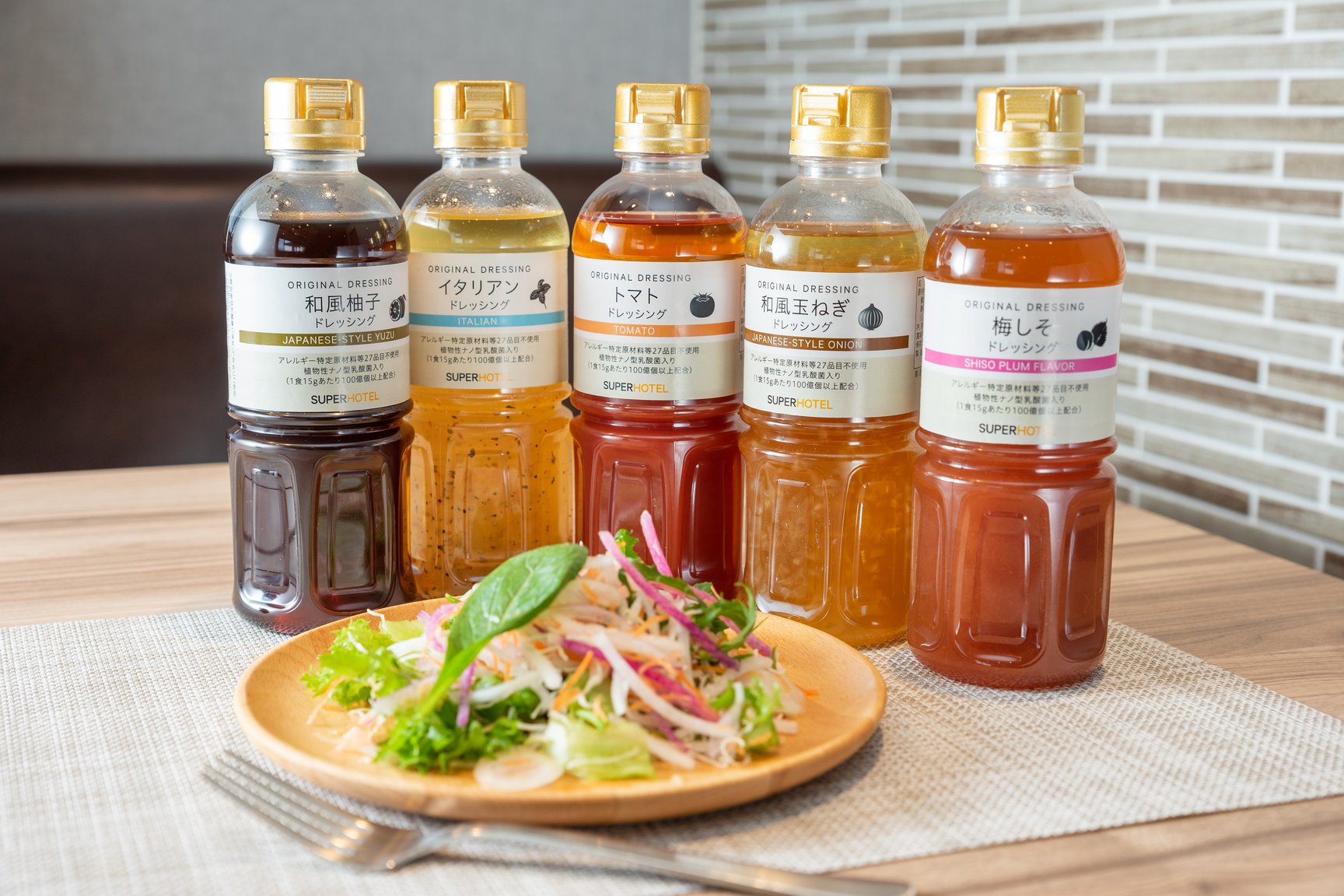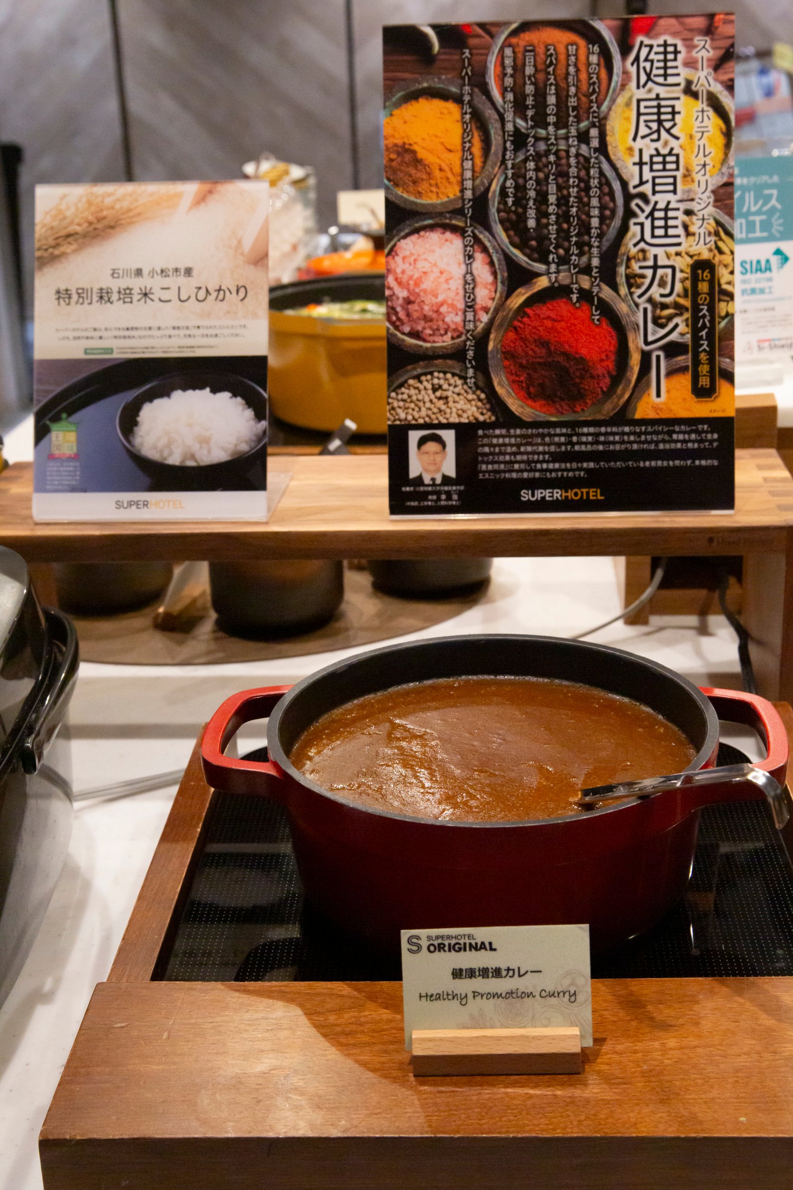 オーブンで焼き上げたサクサクの「BIOロール」は有機農法のBIO認証を受けたものでアレルゲンは小麦のみ。ヴィーガンの方でも安心していただくことができる(一部店舗)。特定原材料等28品目不使用のオリジナルドレッシングは植物性ナノ型乳酸菌入りで腸の動きをサポートしてくれる効果も。好みにあわせて5種類から選ぶことができる。16種類のスパイスを厳選したスーパーホテルオリジナルの健康増進カレーは身体のデトックスや冷え性改善、二日酔い、消化促進にも効果的なのだそう。メニューが多く何を食べるか戦略を考える際は真っ先にセレクトしたい。