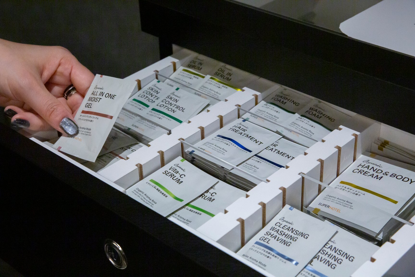 1日の疲れが溜まりやすい旅先や出張先ではできるだけスムーズに眠りにつきたいもの。しかし、普段と違う環境では寝付きが悪く、翌日のパフォーマンスに響いてしまう人も多いのではないだろうか。そんなニーズに合わせてホテル側が提供するのは、青パパイア発酵のサプリメント「リラエナ」。身体をリラックスさせ、質のよい睡眠を促し翌朝の活力を身体の内側から導いてくれる効果が期待されるのだそう。これに加えて、スーパーホテルの社員が中心となり企画?開発したオリジナルのオーガニックアメニティも。気分を和らげる香りを目指しつつ、肌や髪に優しいオーガニック認証の「ダマスクバラ花水」「ハイブリッドローズエキス」などのローズ成分を配合した洗顔フォームや、スキンコントロールローション、オールインワンゲル、洗い流さないトリートメントなどをラインナップ。1泊につき5点までゲットすることができる。