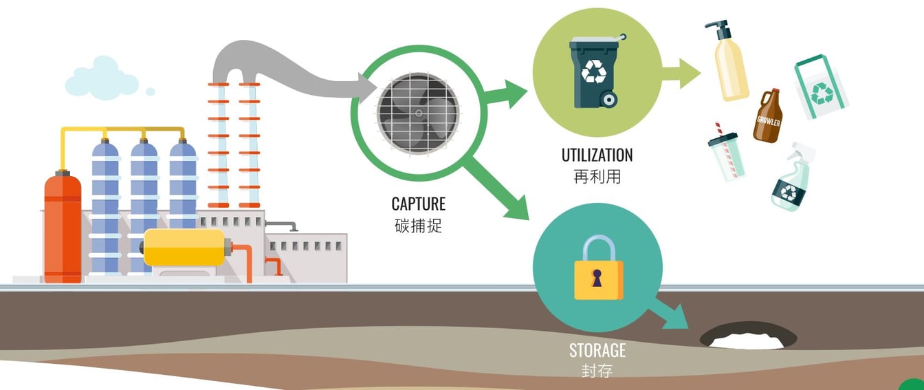 CCUSとは「カーボン?キャプチャ?ユーティリゼイション?ストレージ」の略。従来の繊維工場であれば、紡績にあたって生まれる炭素は煙突からそのまま排出されていたが、煙突に炭素をキャッチする回収技術を備える、それらをプラスチックボトルを作るための燃料として再利用する仕組みだ。また、燃料として使用されなかった炭素は、土の下にストレージすることも可能だ。