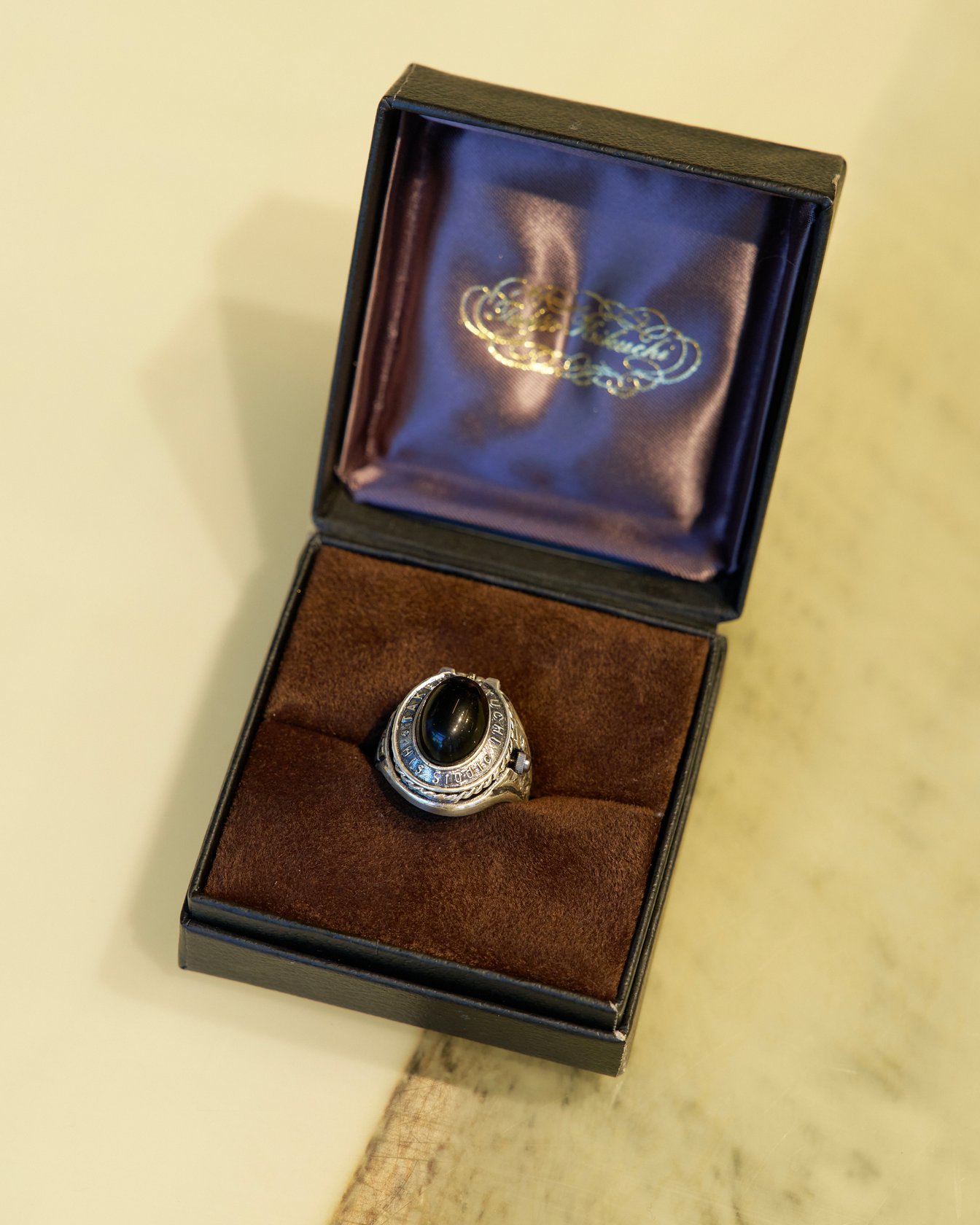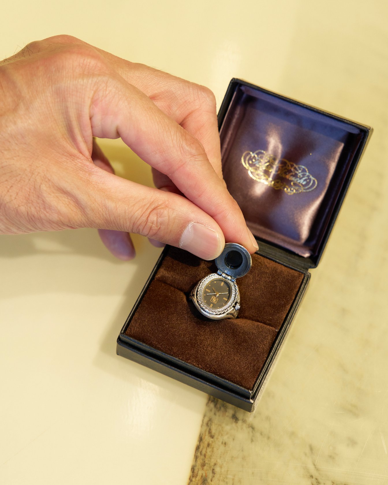 外見はカレッジリング。正面の蓋を開けると時計が現れるシークレットウォッチ仕様。