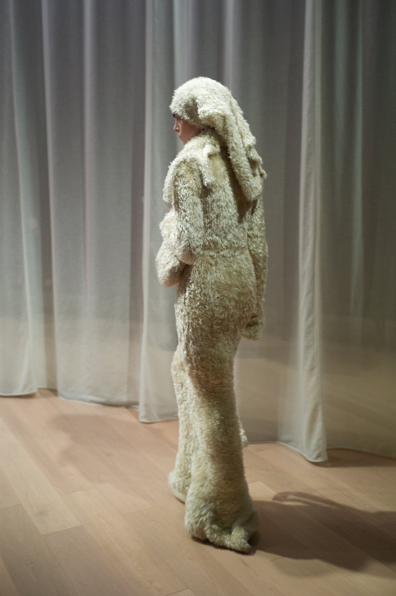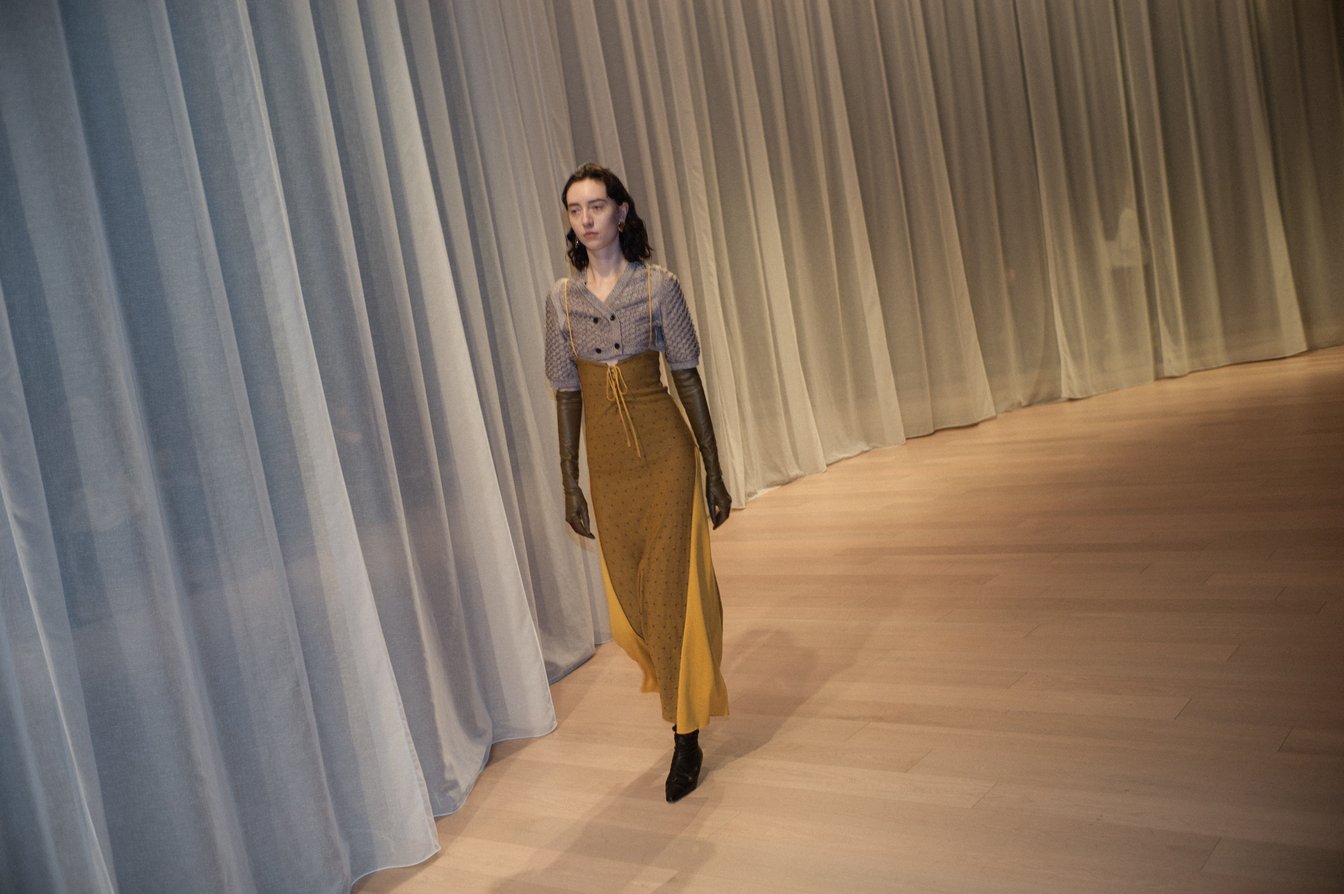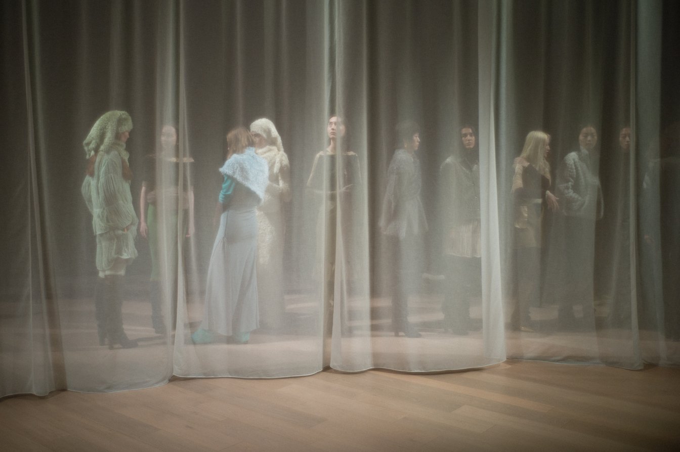会場は約35メートルのシアーカーテンで分断され、モデルがカーテン越しに透けて見えながら登場し、観客の元へ向かってくるという演出だった。これも、新たな命がヴェールを脱ぐように神秘的な印象を与えるものだった。