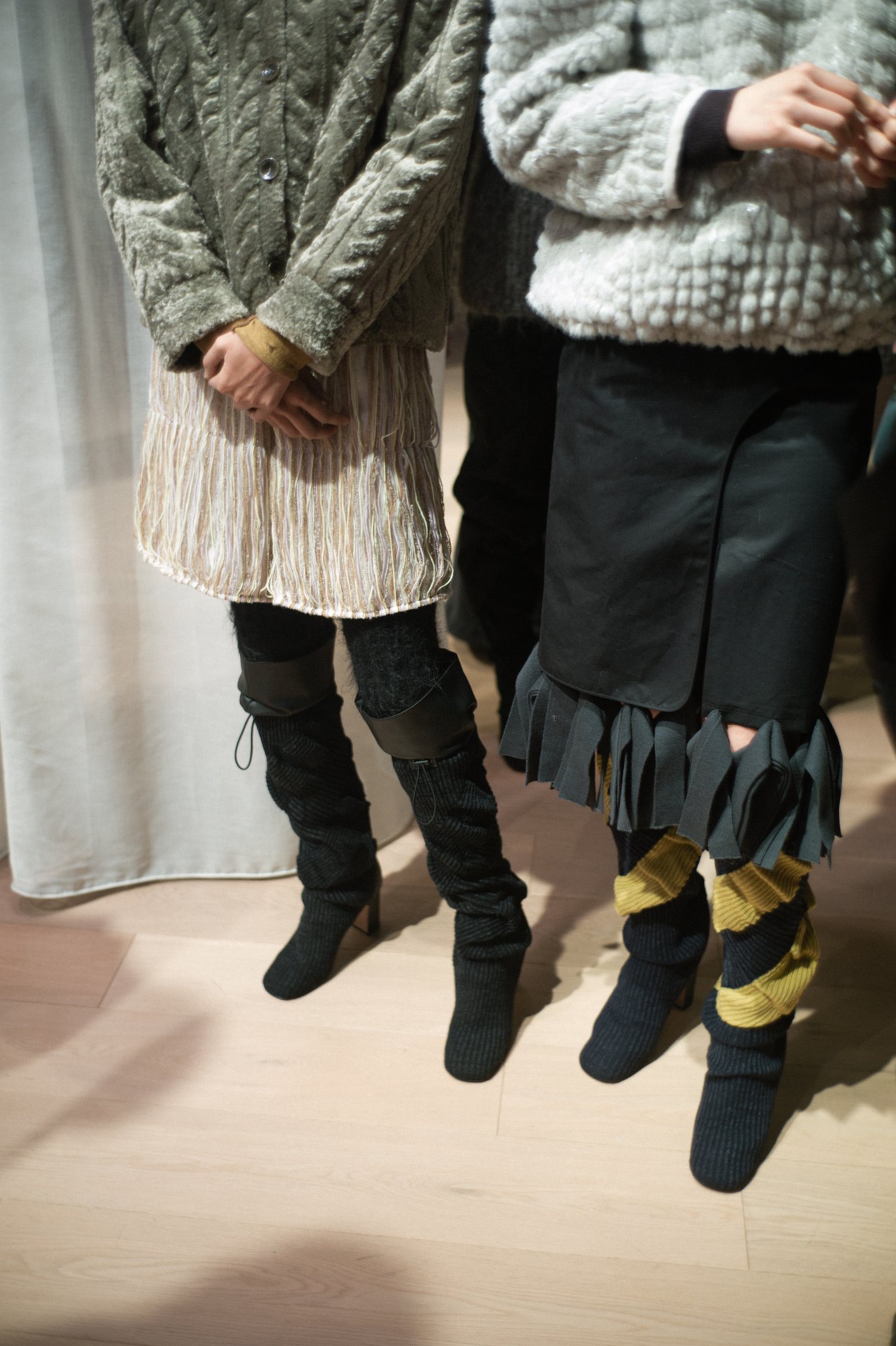 さらに、イタリアのシューズブランド「ペリーコ(PELLICO)」との初のコラボレーションがお目見え。日本で制作したニットのアッパーをイタリアで組み合わせたニットブーツは、足を螺旋状に包み込むようなリブ編みが、ブランドならではの洗練された遊び心を感じさせる。