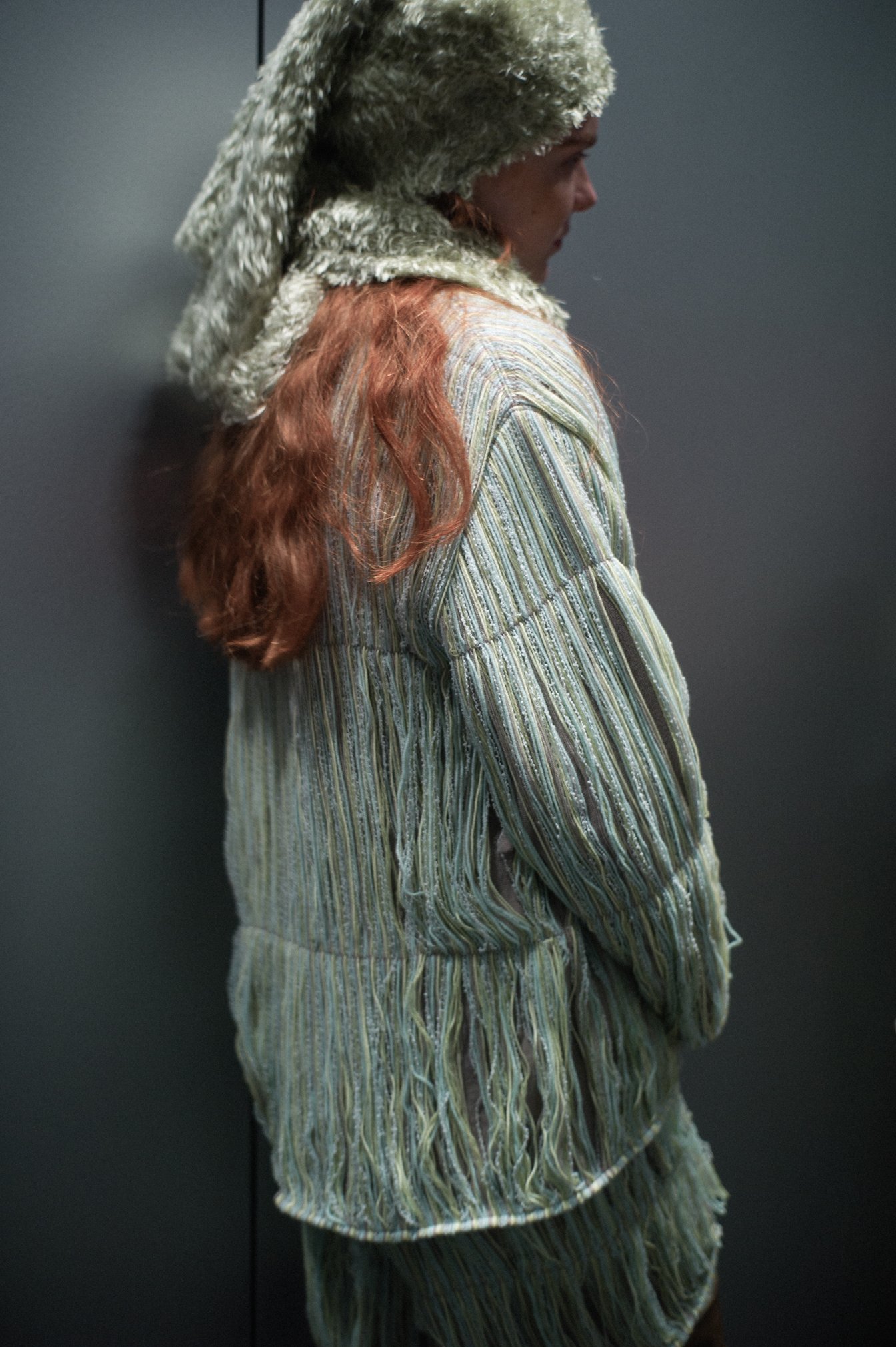 ニットと真摯に向き合ってきたからこそ実現できる技術は、国内各地のニット工場や職人たちとの強い信頼関係を証明するものでもある。ファーストルックのダイナミックなフリンジが印象的な手編みのドレスは、長年の信頼を寄せる編み物教室の先生に託して制作された一品。また、6種類もの毛糸がすだれのように連なった繊細なジャケットとショートパンツは、工場との綿密な対話を重ね、高度な編み技法によって商品化された技巧の結晶だ。