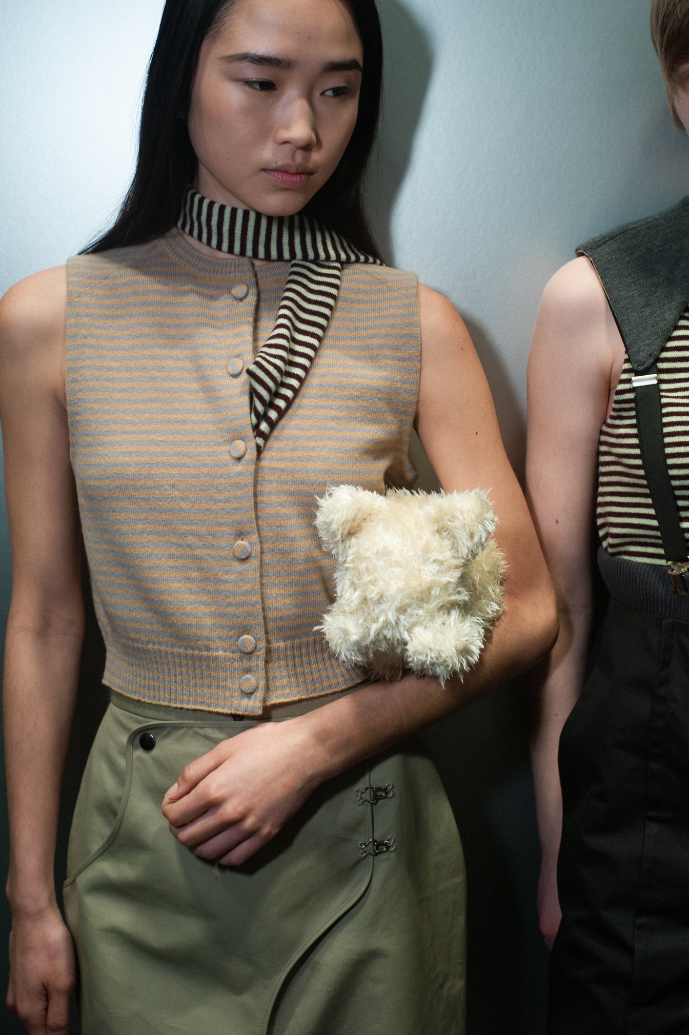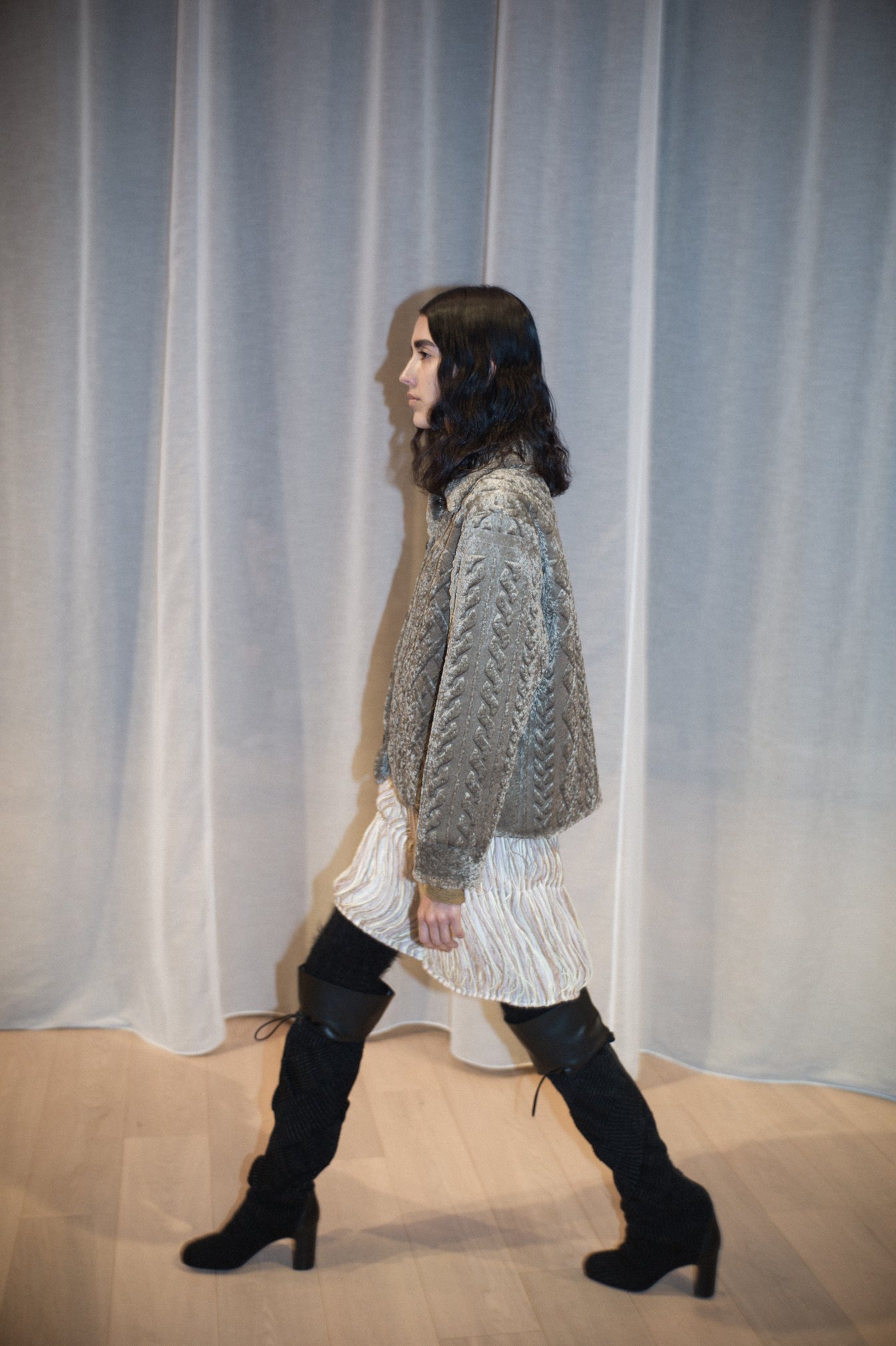 ショーを開催するにあたり、コーディネートの幅を広げるため、ニット以外の布帛(織物の生地)アイテムを加えている。しかし、コットンのスカートの裾にはニットのフリンジをあしらったり、同様にパンツのウエスト部分にはリブバンドを施したり、フェイクファージャケットにはケーブル編み風の柄をエンボス加工で入れるなど、ニットブランドとしてのアイデンティティをしっかりと示している。「ここまでくると意地ですね(笑)」と、村上はニット専業で10年間続けてきたプライドを垣間見せた。