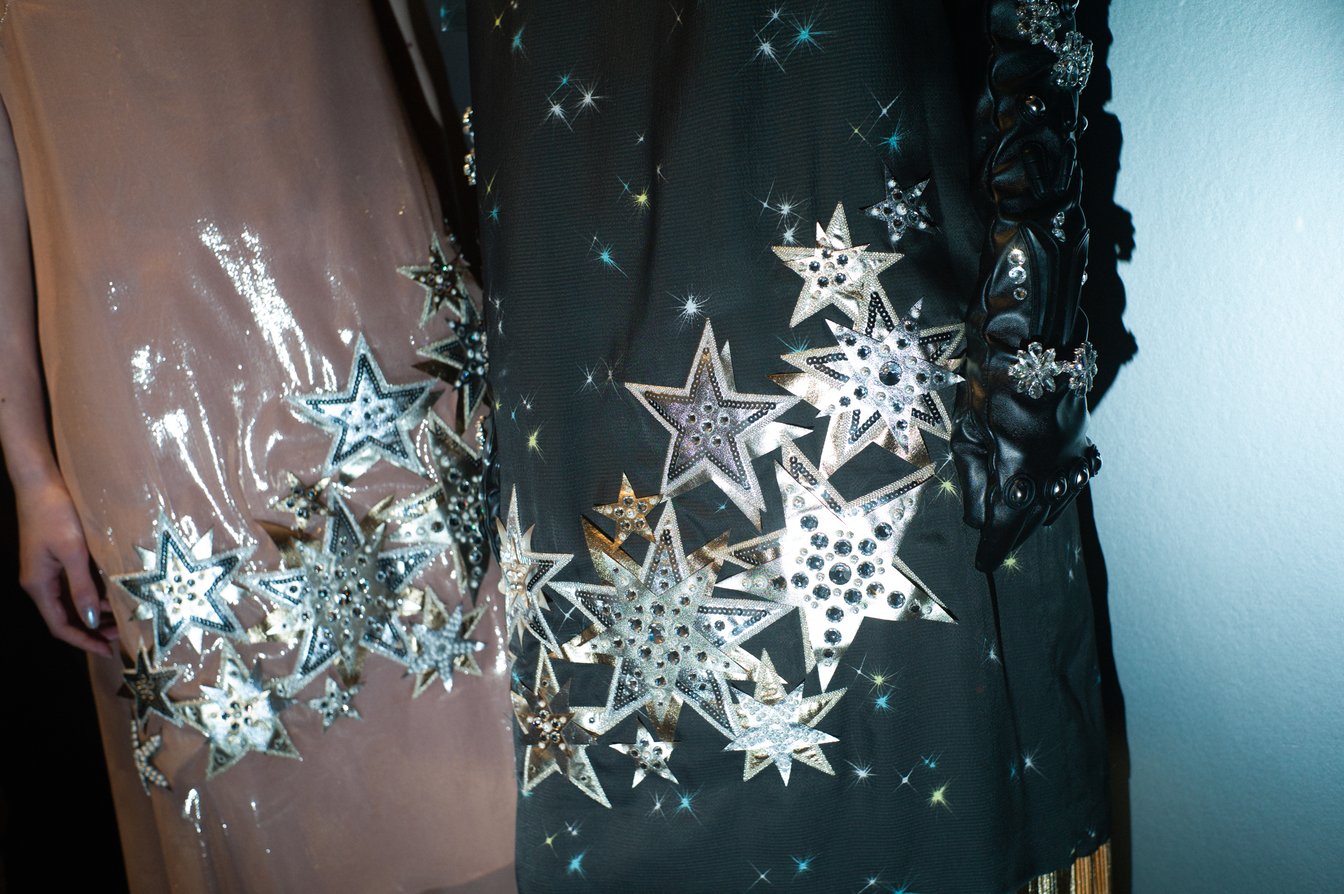 この着物ジャケットはさまざまなプリントを施したバリエーションで展開。キラキラとしたグラフィックは、着想源である夜の“不気味さ”や日本らしさを反映させるために、あえてアニメ「銀河鉄道999」に描かれるような、神秘的に瞬く夜空を意識したという。