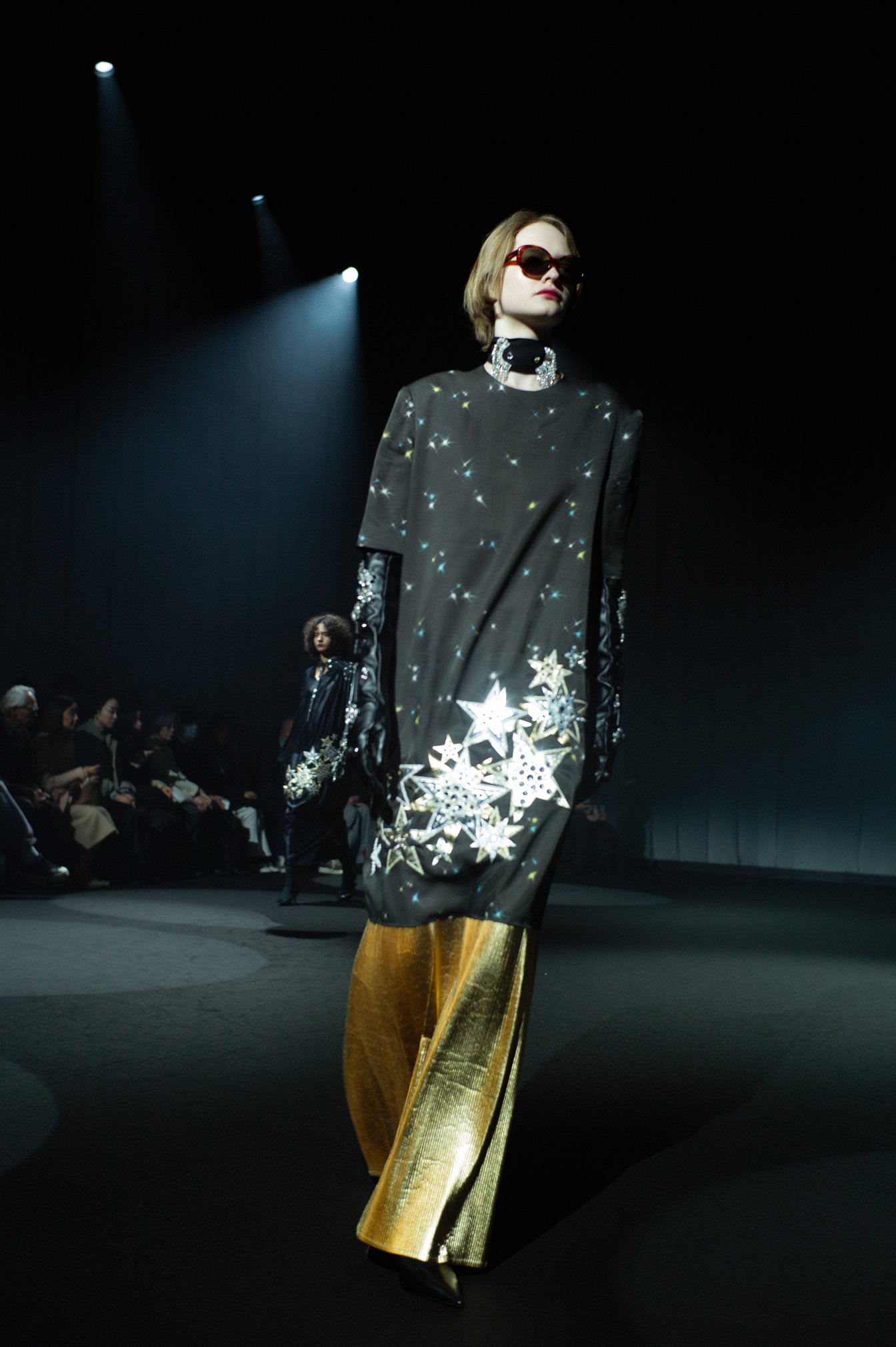 ファーストルックで登場した着物の構造をヒントにしたジャケットも、その和洋折衷デザインの一例だ。平置きで綺麗に畳める着物のようにフラットでありながらも、艶やかなシルクウールで品よく仕立てられたこのジャケットは、和服と洋服のいいとこ取り。ビジューをあしらったグローブを合わせ、夜の煌めきをプラスしている。