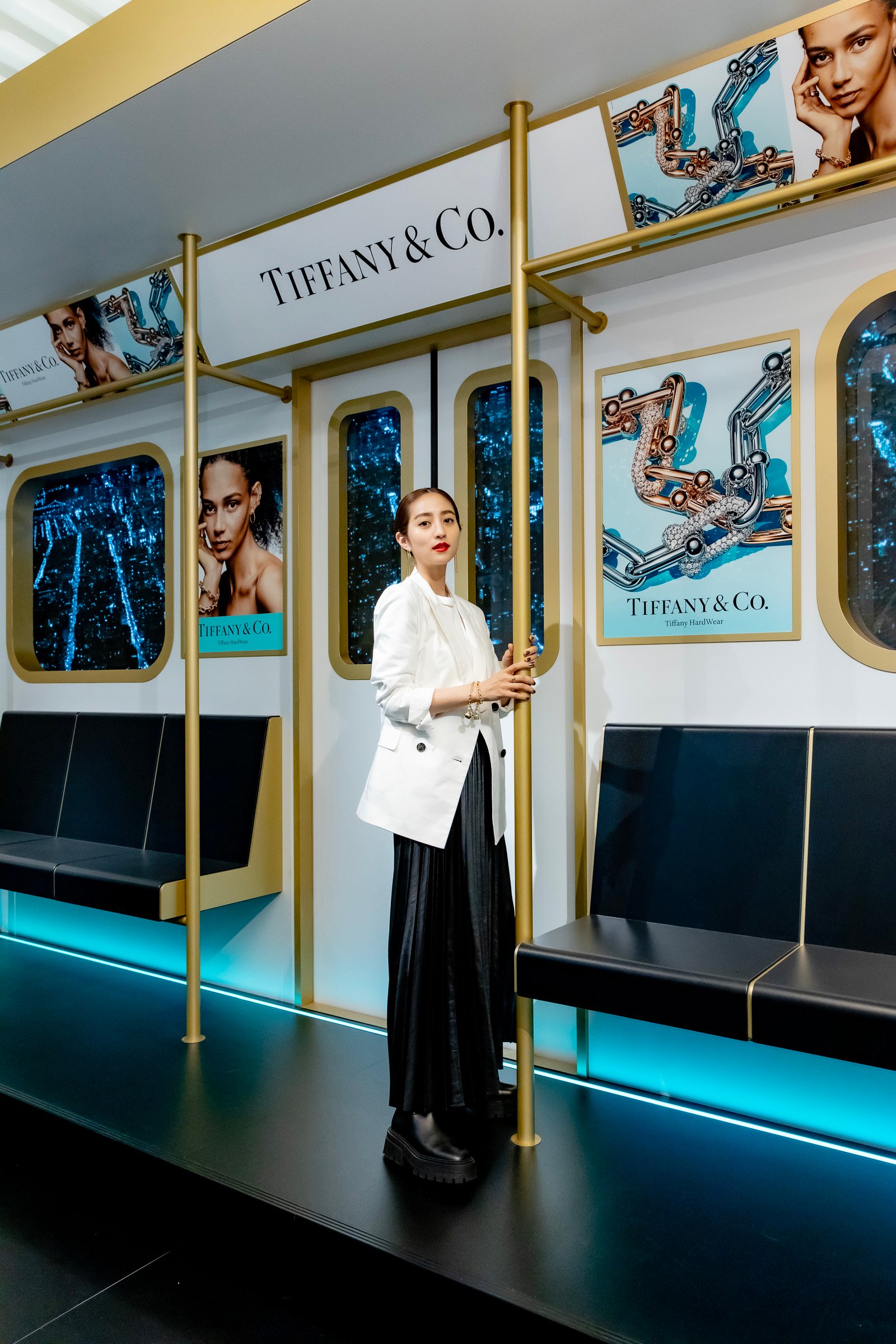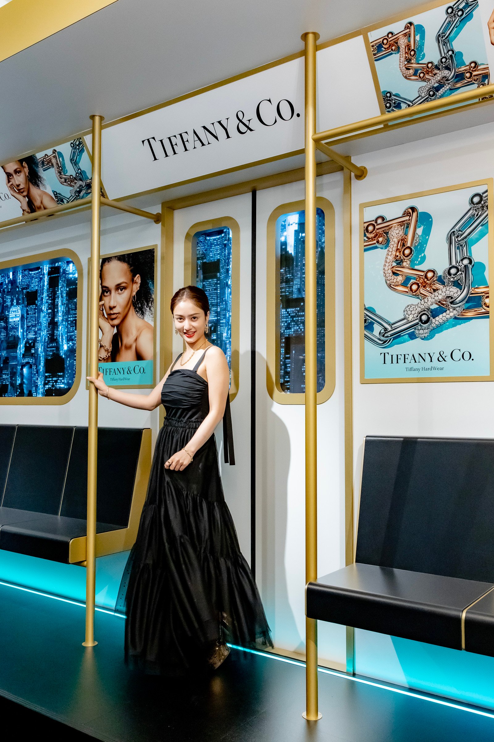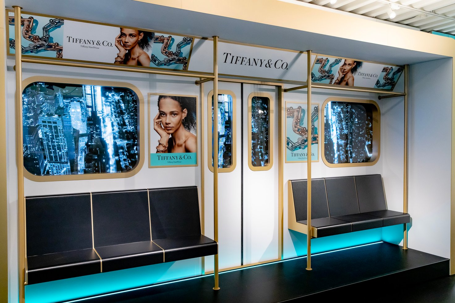 店内に入るとまず目に飛び込んでくるのが、ニューヨークを象徴するサブウェイを模したフォトスポット。白とゴールドを基調に、ティファニーブルーのライトや「ティファニー ハードウェア」コレクションのポスターで彩られたサブウェイの車窓からは、ゆっくりとニューヨークの街並みが流れて見える仕掛けが。まるで本当にニューヨークのサブウェイに乗っているかのような感覚を味わえます。