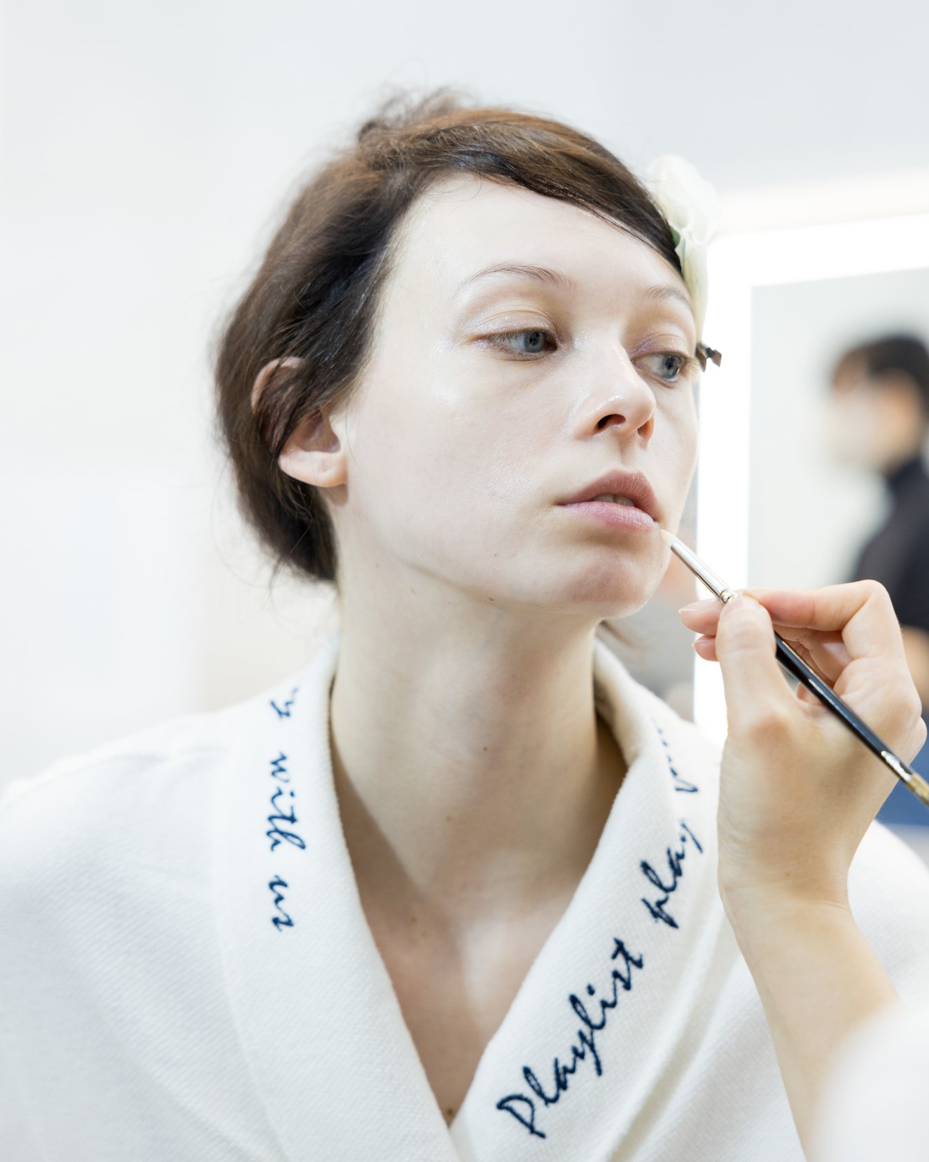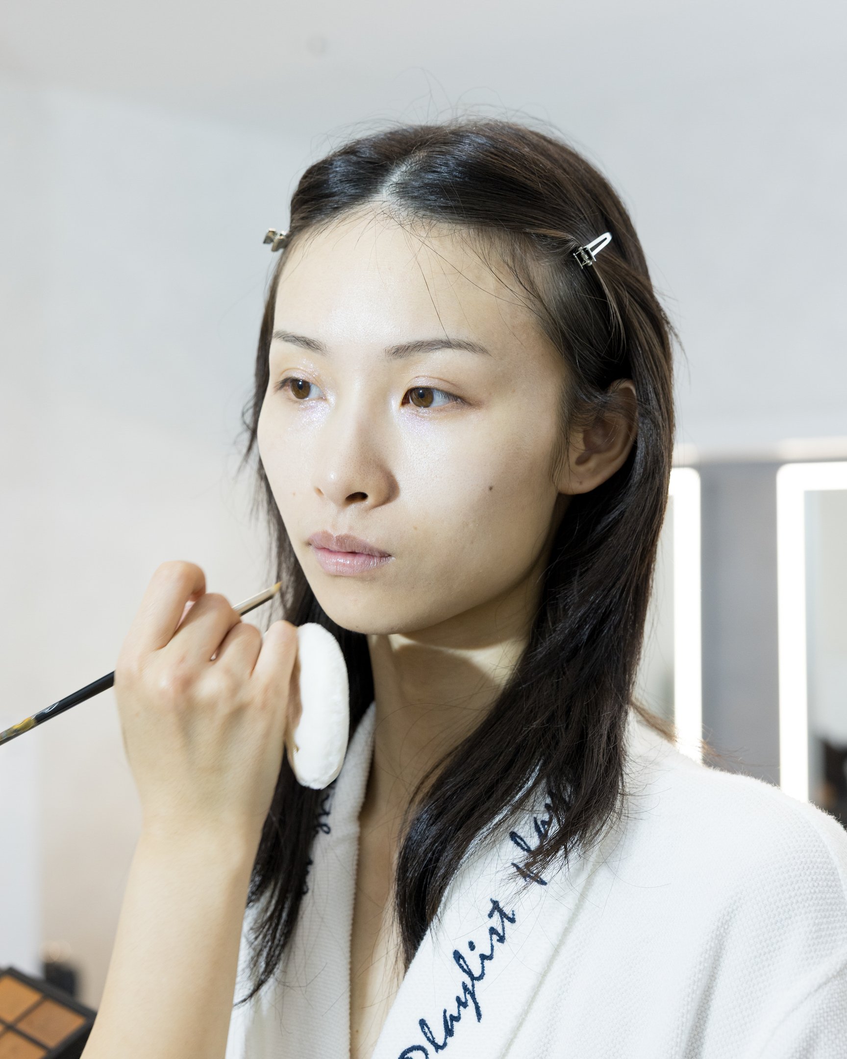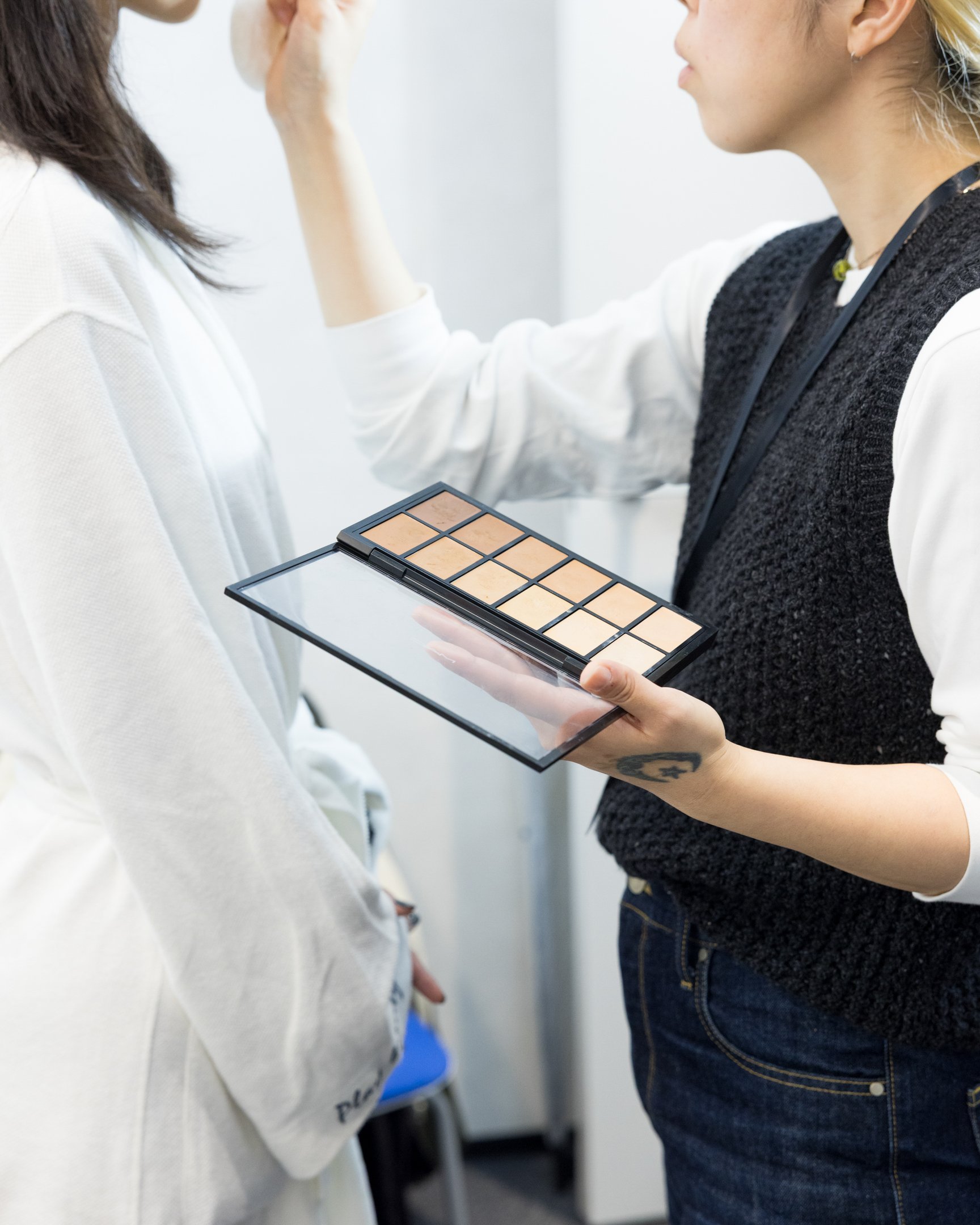 今回はコレクションのテーマからも、メイクで表情を作るよりも、より内面の繊細さを表現したく、唇にはほとんど色は使わずリップクリームだけで完成させています。逆に元々の唇の血色感が強いモデルは、唇の輪郭をファンデーションで消してふわっと柔らかくなるように仕上げています。