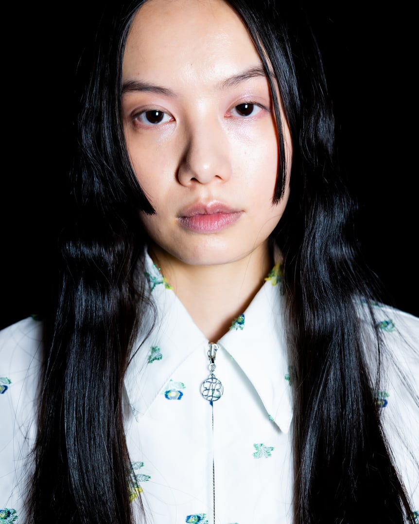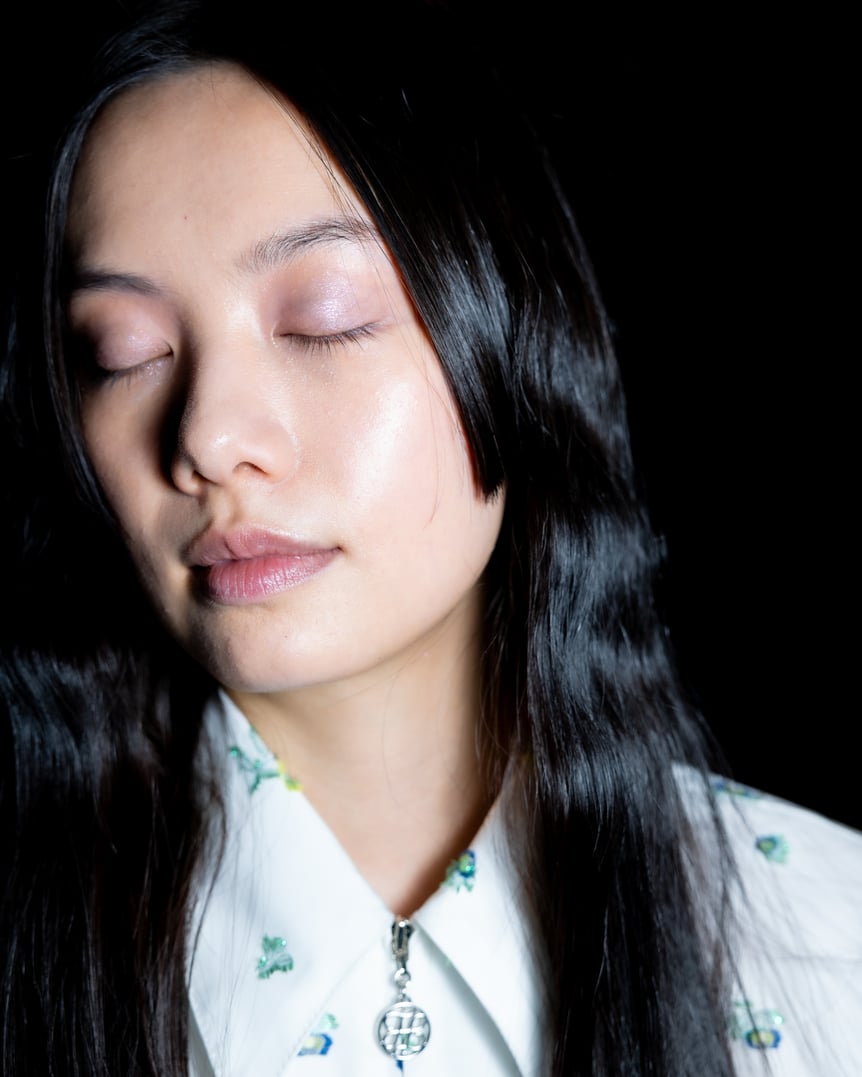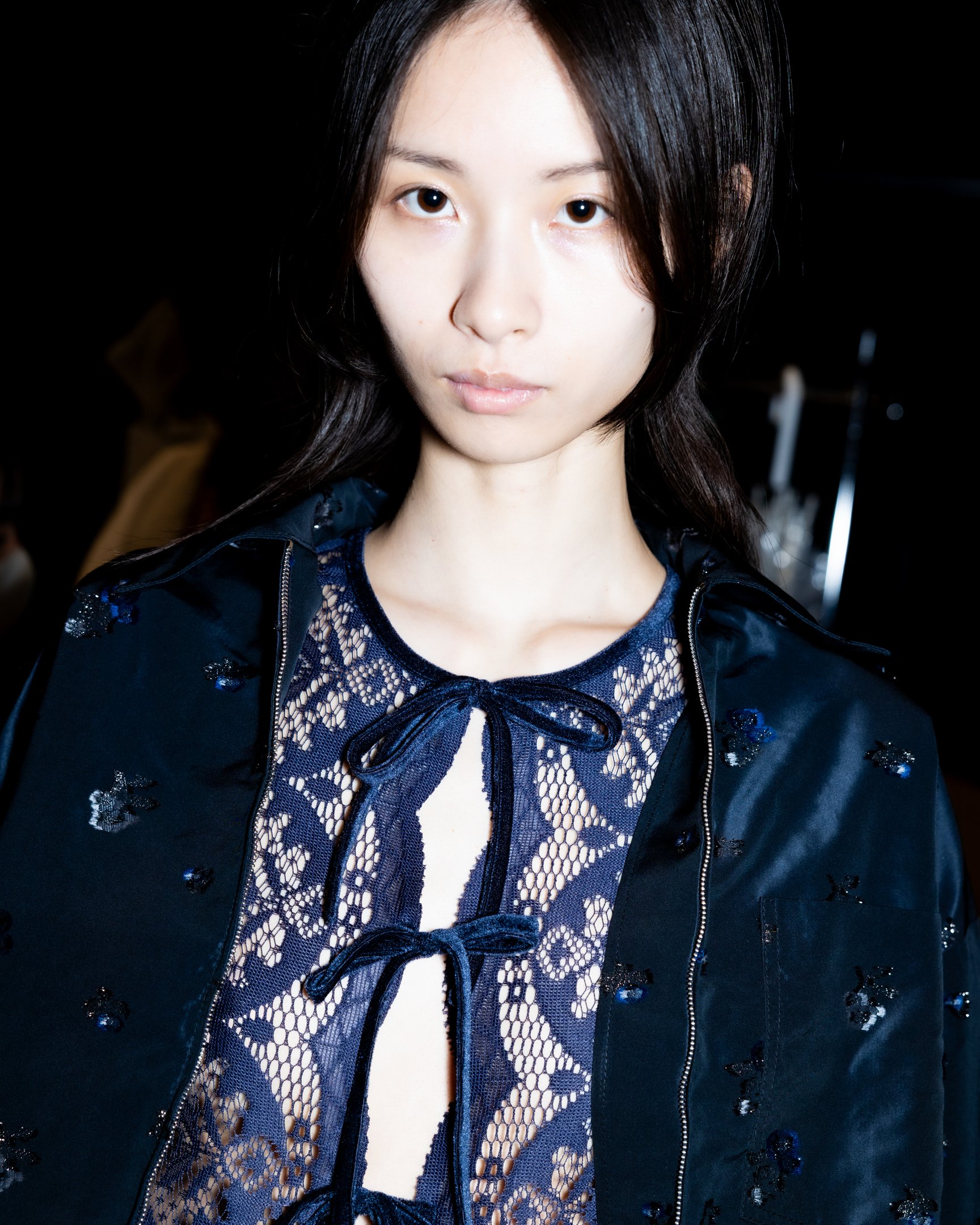 今回はコレクションのテーマからも、メイクで表情を作るよりも、より内面の繊細さを表現したく、唇にはほとんど色は使わずリップクリームだけで完成させています。逆に元々の唇の血色感が強いモデルは、唇の輪郭をファンデーションで消してふわっと柔らかくなるように仕上げています。