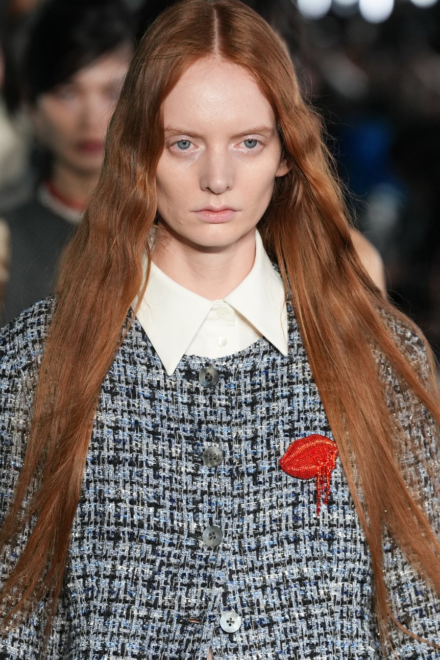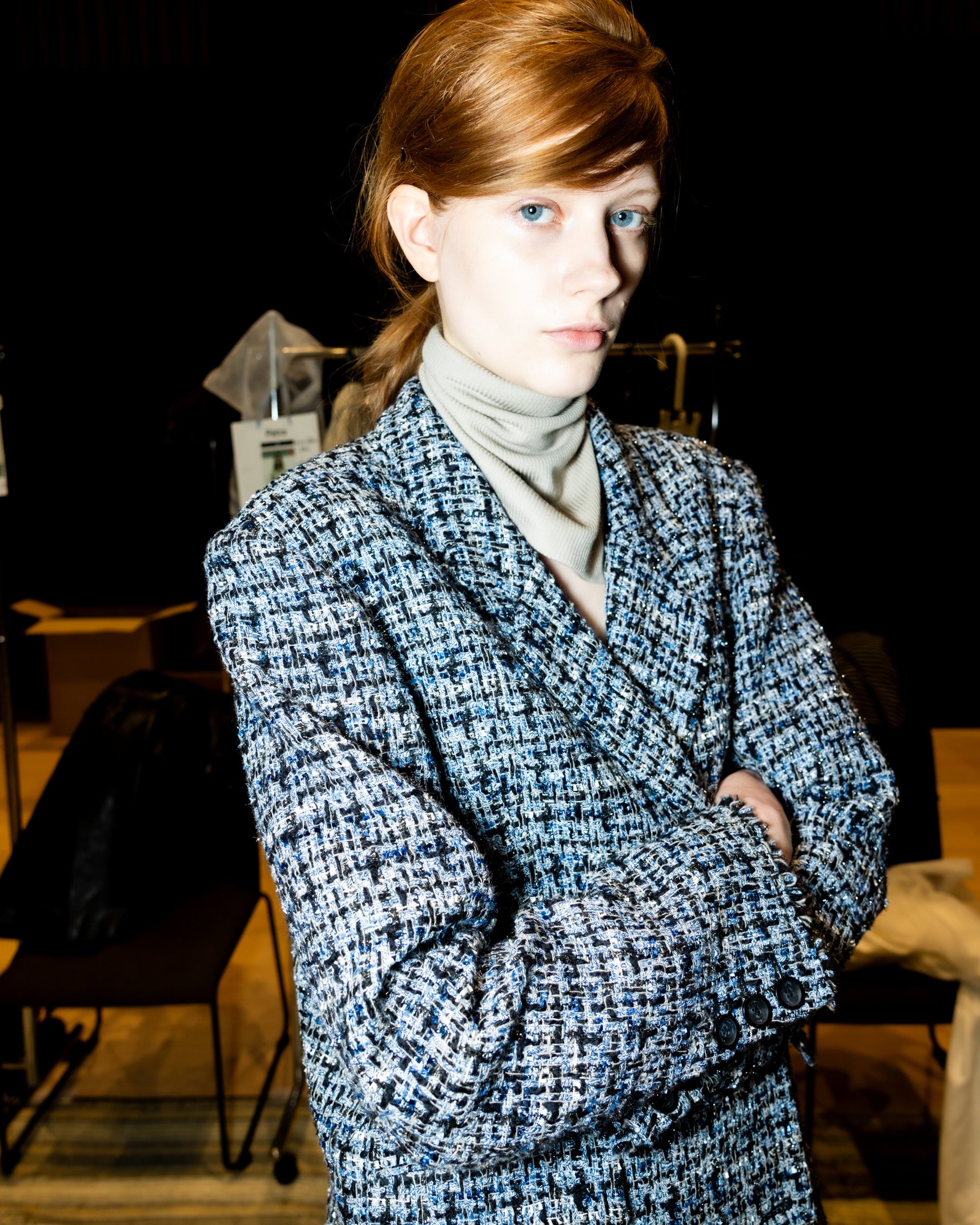 ヘアは大きく分けて、まとめ髪のレトロなスタイルと、ニュアンスのあるダウンスタイルの2種類。最初のテストの時は、ダウンスタイルのヘアをもっとしっかりと巻いていましたが、実際にルックを着たものを見て、もう少し現代的に落とし込みたくラフなスタイルに仕上げました。