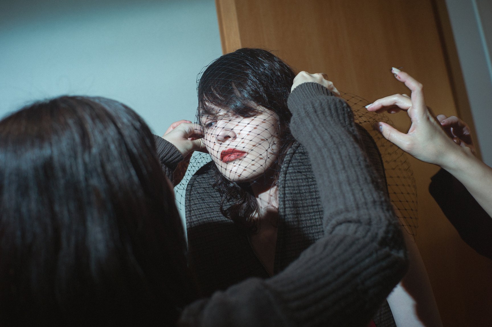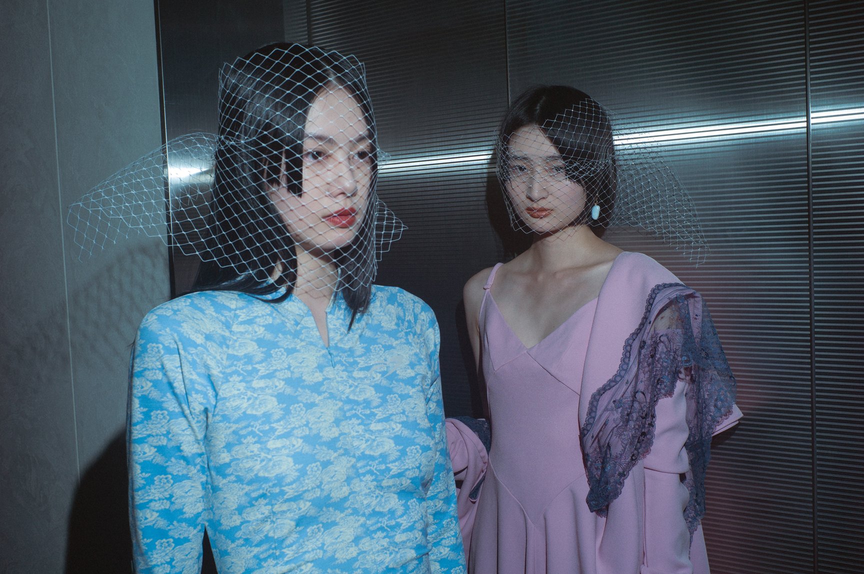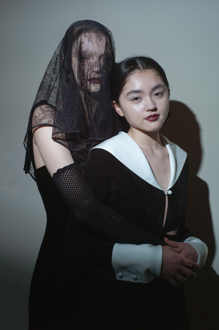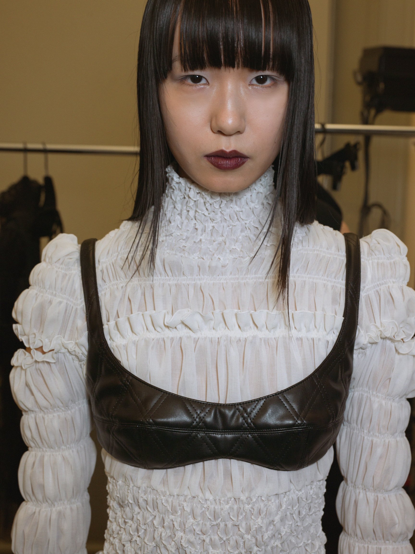 いくつになっても愛でていたい“Eternal Favorites(永遠のお気に入り)”をテーマにした、舟山瑛美氏によるフェティコの2024秋冬コレクションで作られたのは、「ゴシックが好きな女の子」です。退廃的で目を惹くダークな世界観をメイクアップに宿すために、肌は「これまでのシーズンに比べるとレア感は抑えて、本人たちより2トーンほど上げた重めなスキンでゴシックな雰囲気を作りました」(ヘアメイクアップアーティスト Nobuko Maekawa氏)。ルックのダークさをまとめ上げるリップは、唇のシェイプをはっきりと出しつつ、主張しすぎないようにティッシュオフでなじませて落ち着かせていました。肌の重さと暗いリップでダークな要素を与えながらもゴシックな印象に傾きすぎないよう、アイはグレーのシャドウでニュアンスのあるピュアな眼差しを演出していました。