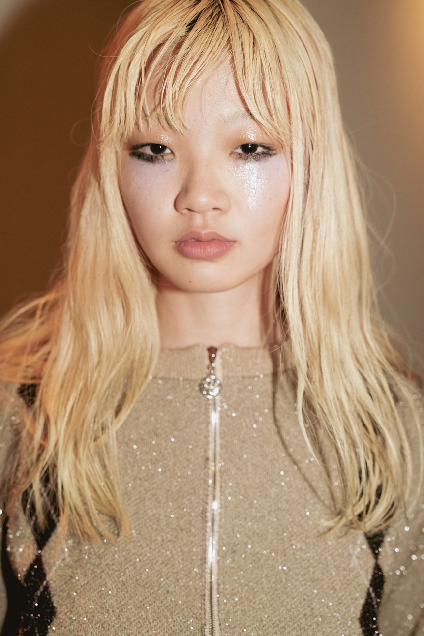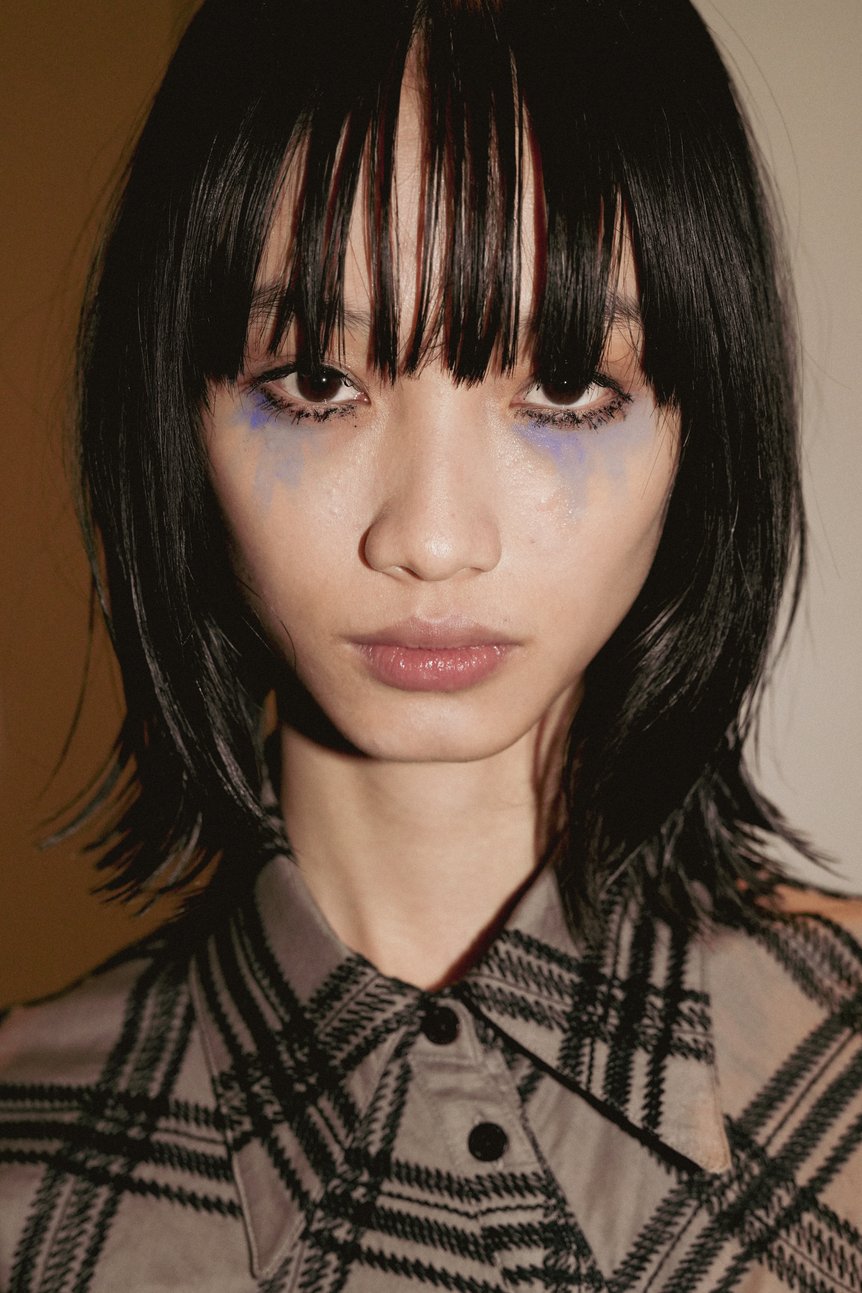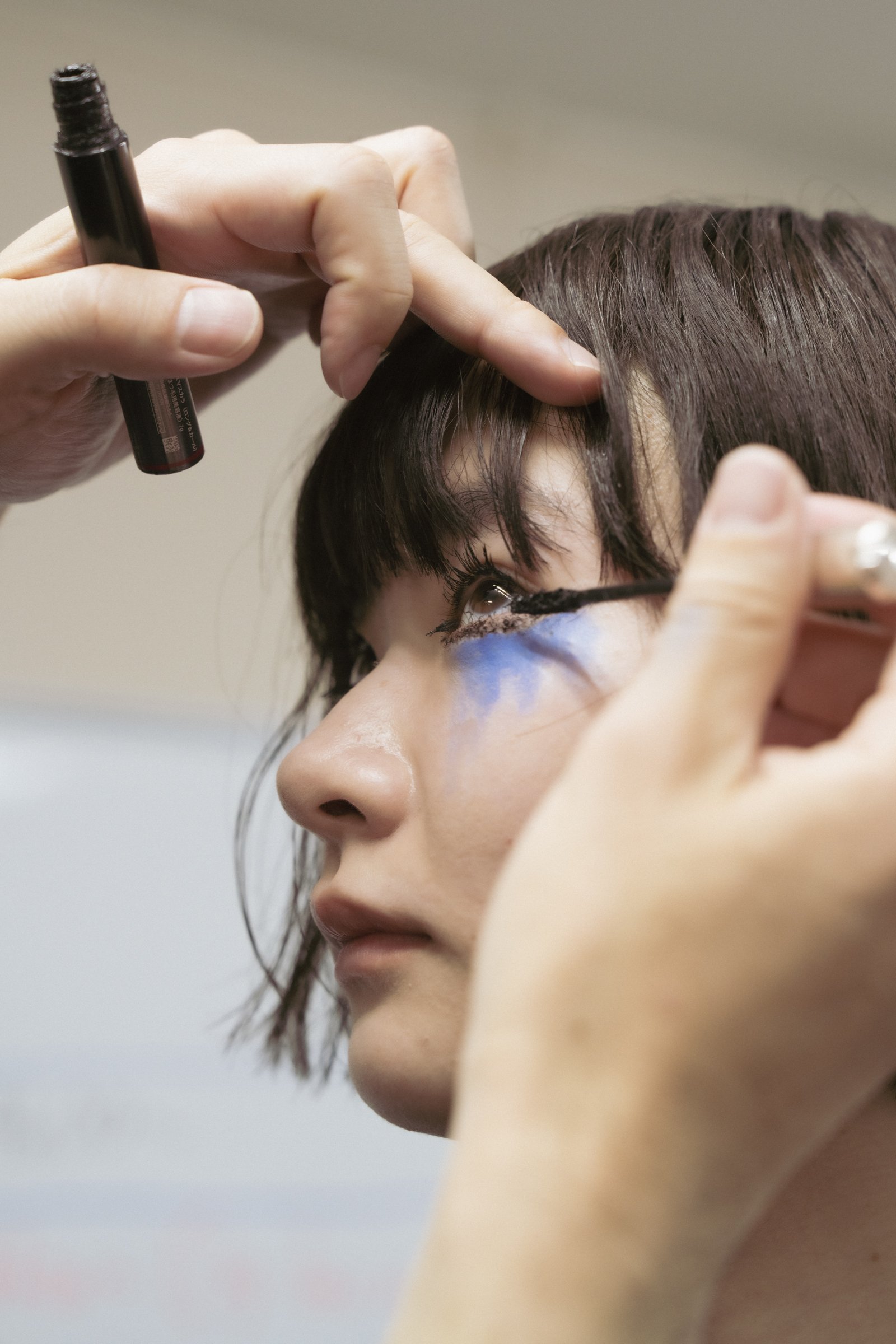 そんなコレクションから、メイクアップはヘアメイクアップアーティスト 豊田健治氏が「泣いた後に前に進む少女」と、より具体的な人間像を語ってくれました。さらにディテールとして、アイメイクは「涙で落ちたアイメイク」を表すために下まぶたに直接マスカラを押し付け、涙のカラーペイントはブルー、ミント、ラベンダーを混ぜたり使い分けたりして、服とのバランスが生まれています。頭頂部をオイリーにして作ったヘアは時間経過による“メッシーさ”が表現され、カラーペイントでモノトーン調のシックなルックに色が添えられました。