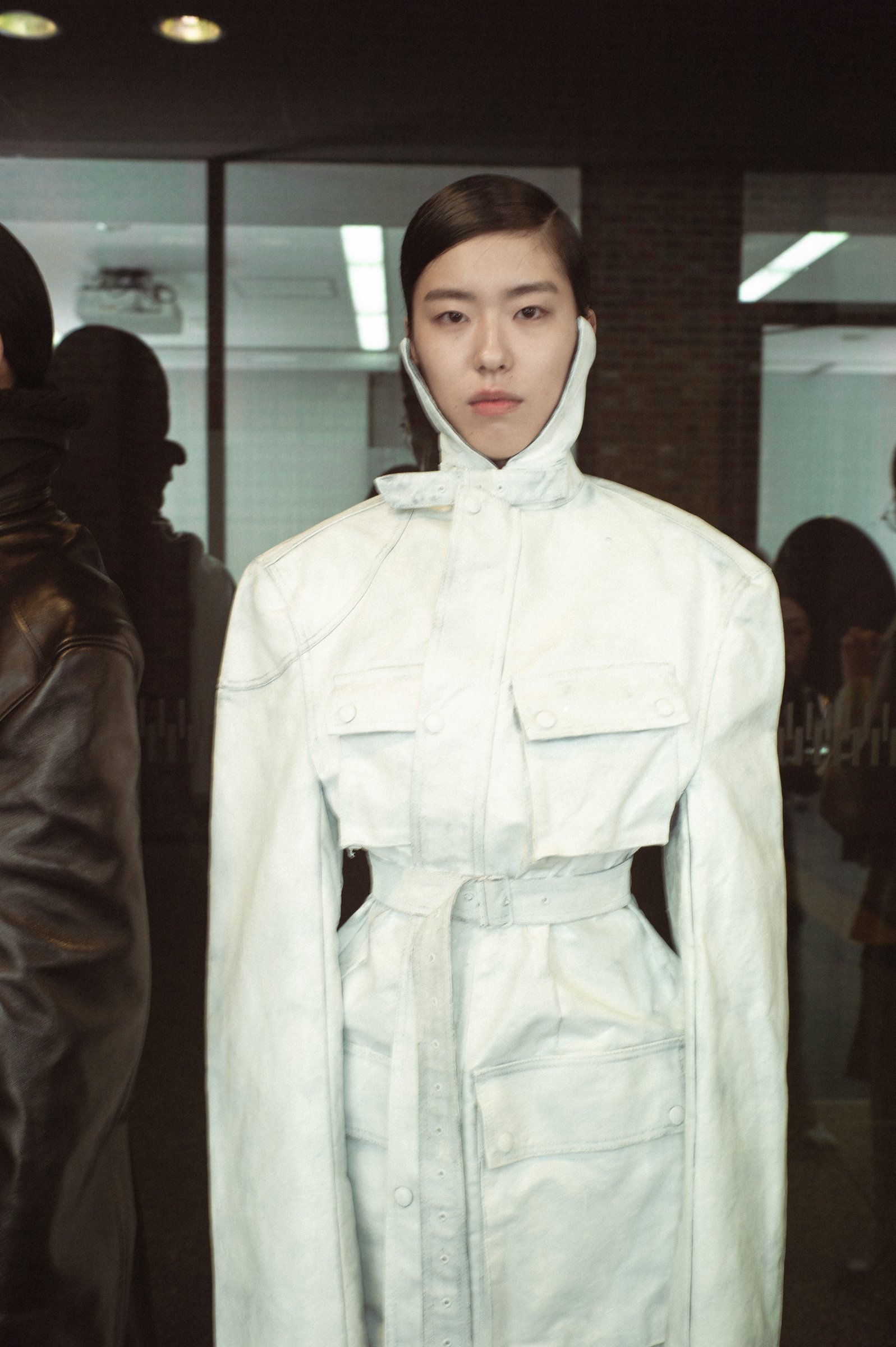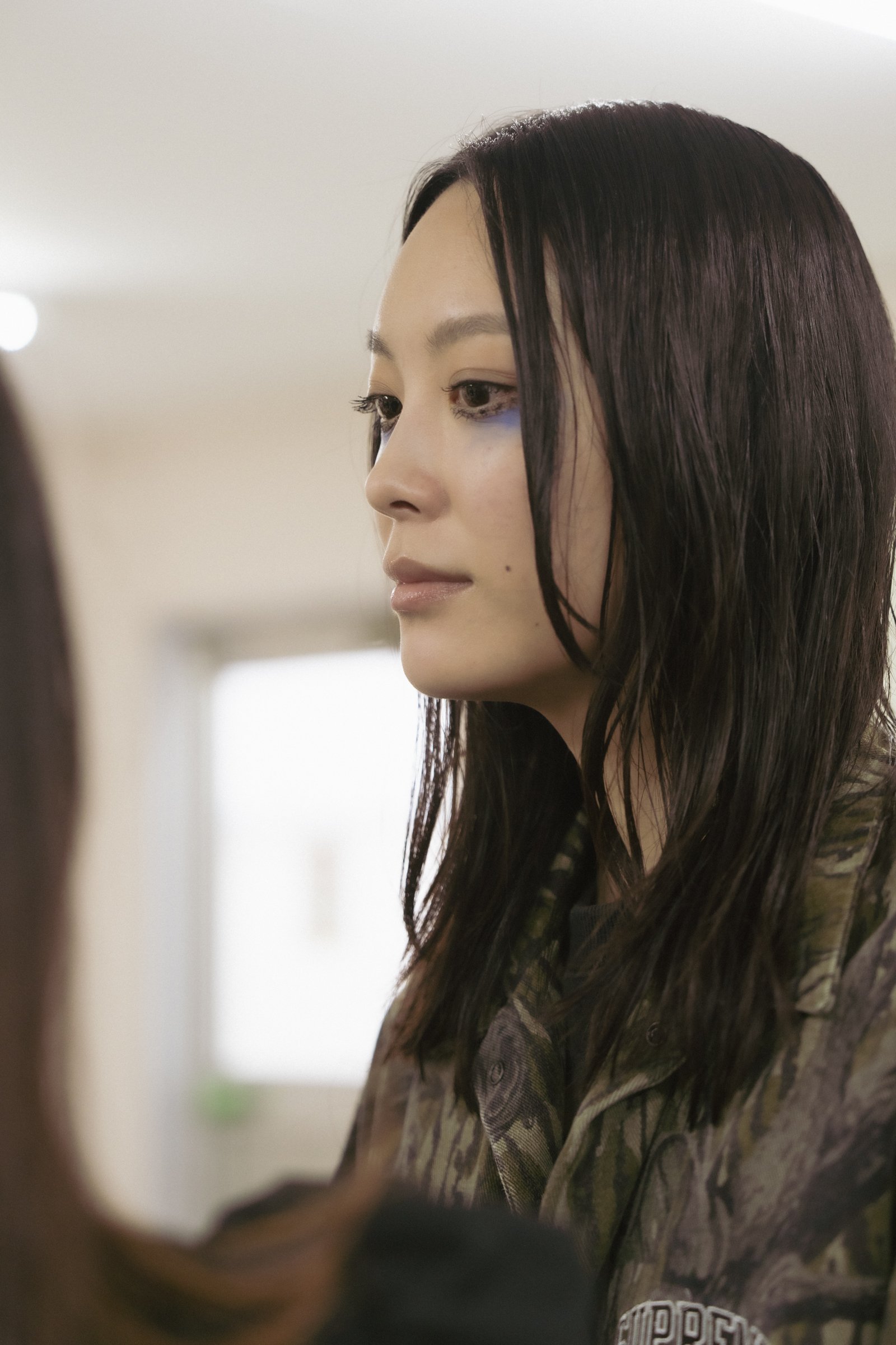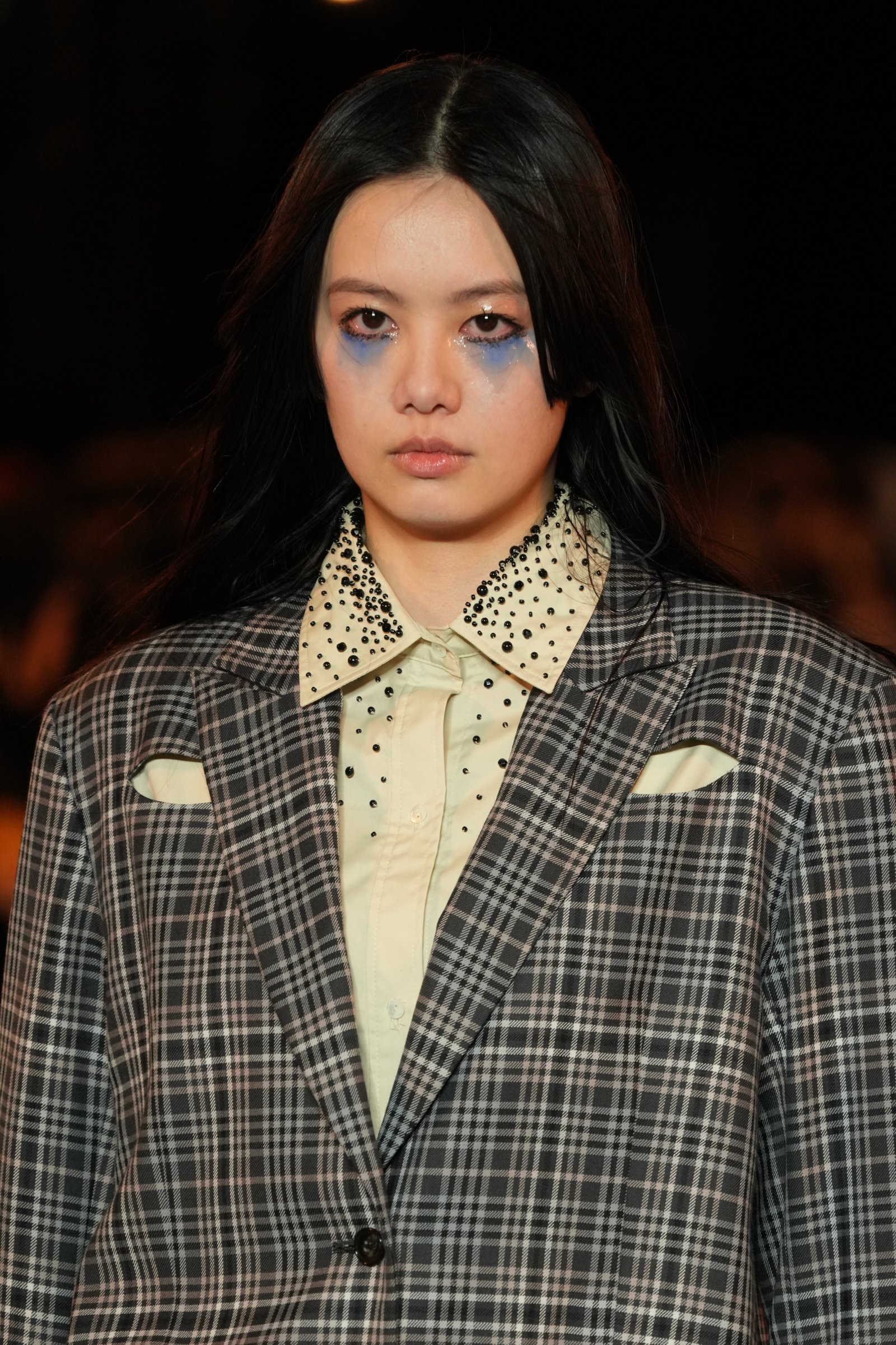 そんなコレクションから、メイクアップはヘアメイクアップアーティスト 豊田健治氏が「泣いた後に前に進む少女」と、より具体的な人間像を語ってくれました。さらにディテールとして、アイメイクは「涙で落ちたアイメイク」を表すために下まぶたに直接マスカラを押し付け、涙のカラーペイントはブルー、ミント、ラベンダーを混ぜたり使い分けたりして、服とのバランスが生まれています。頭頂部をオイリーにして作ったヘアは時間経過による“メッシーさ”が表現され、カラーペイントでモノトーン調のシックなルックに色が添えられました。