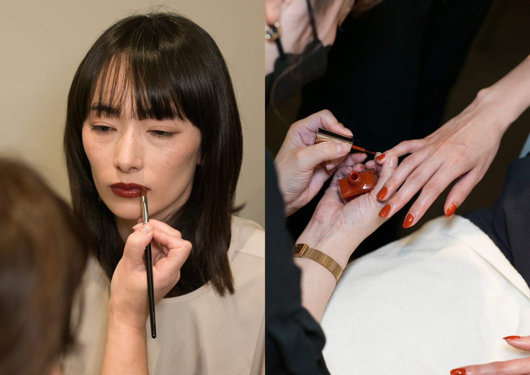 catch up:艶っぽい印象を与えるネイルとリップの色合わせ。ラグジュアリーな雰囲気のワンピースやガウンコートと合わせるのも魅力的ですが、リラックス感のあるセットアップと合わせるのも素敵。この秋はヨウヘイ オオノのルックのようにバームタイプのハイライターで頬骨にツヤも足して、メイクまでもがラグジュアリーな装いを楽しみたいです。