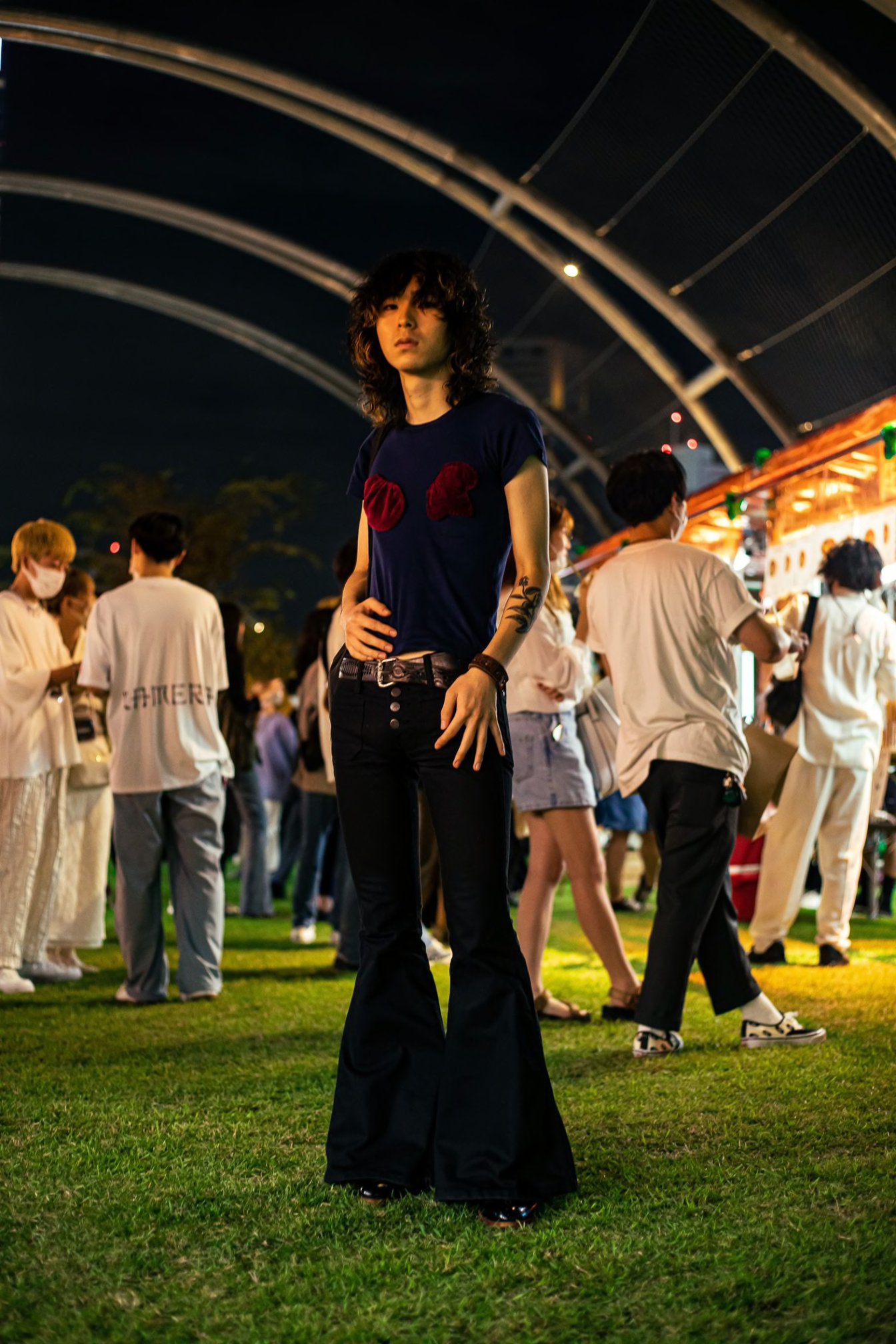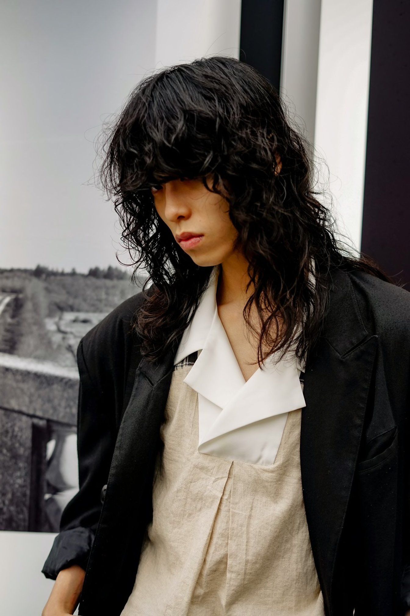 長めの髪に強めのパーマ、ウェットな質感が特徴のメンズヘアスタイルが人気を集めています。エッジさのあるヘアスタイルはモードな雰囲気の服との相性が良く、「チン?メンズ(CHIN MENS)」のシャツや、70年台のロックスターを彷彿とさせるピチT×ベルボトムのコーディネート、「ジョン ローレンス サリバン(JOHN LAWRENCE SULLIVAN)」のセットアップなどと合わせたスタイルが見られました。