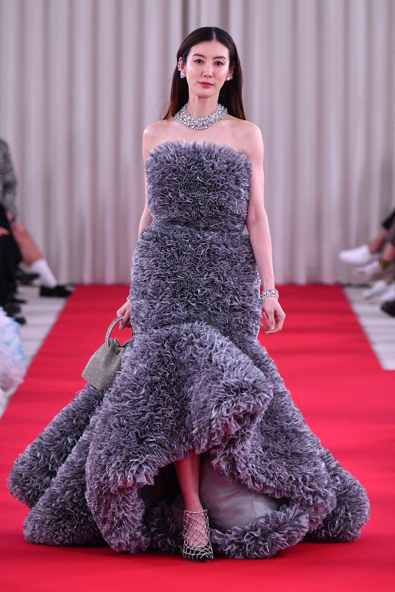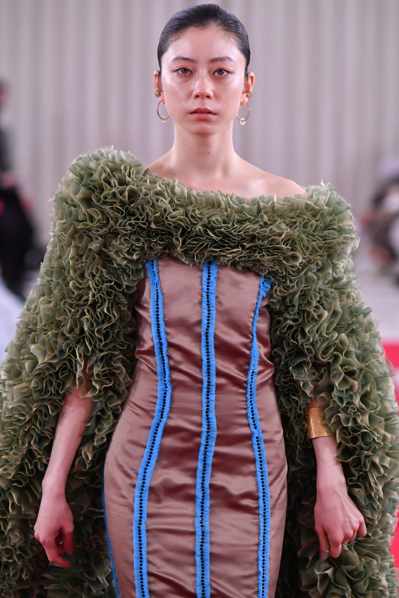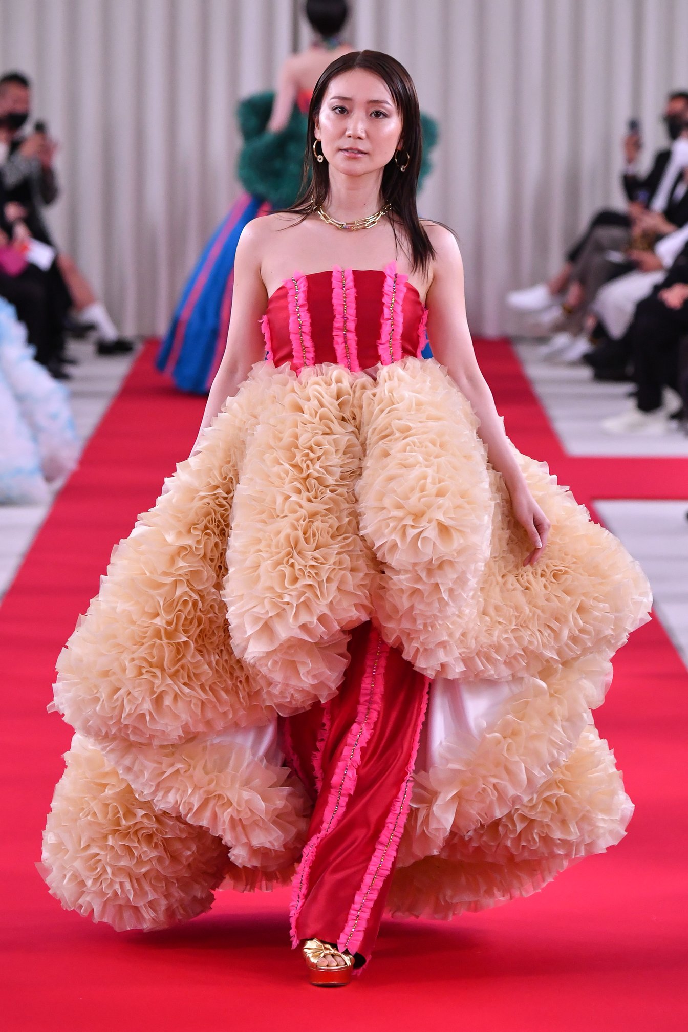 上品なサテンとオーガンジーのラッフルをベースに、今回も様々なボリュームとカラーで表現。タイトなドレスとガウンを組み合わせるスタイリングや、長いトレーンを引いたルックなど、歩く度に繊細に揺れるデザインが優雅な印象を与えた。今回製作されたドレスは、それぞれの着用モデルをイメージして、オートクチュールの仕立てで製作したとデザイナーの小泉智貴は説明する。